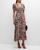 Saloni Lea Silk Floral Long-Sleeve Midi Dre…