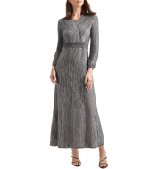 Misook Tie Neck Long Sleeve Pleated Maxi Dress_Marine Teal/ Violet