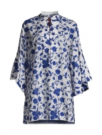 La Vie Style House Floral Embroidered Cotton Long-Sleeve Mini Caftan BLUE WHITE