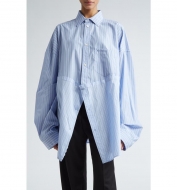 Balenciaga Cut Up Stripe Asymmetric Oversize Cotton Button-Up Shirt_Sky Blue/ White
