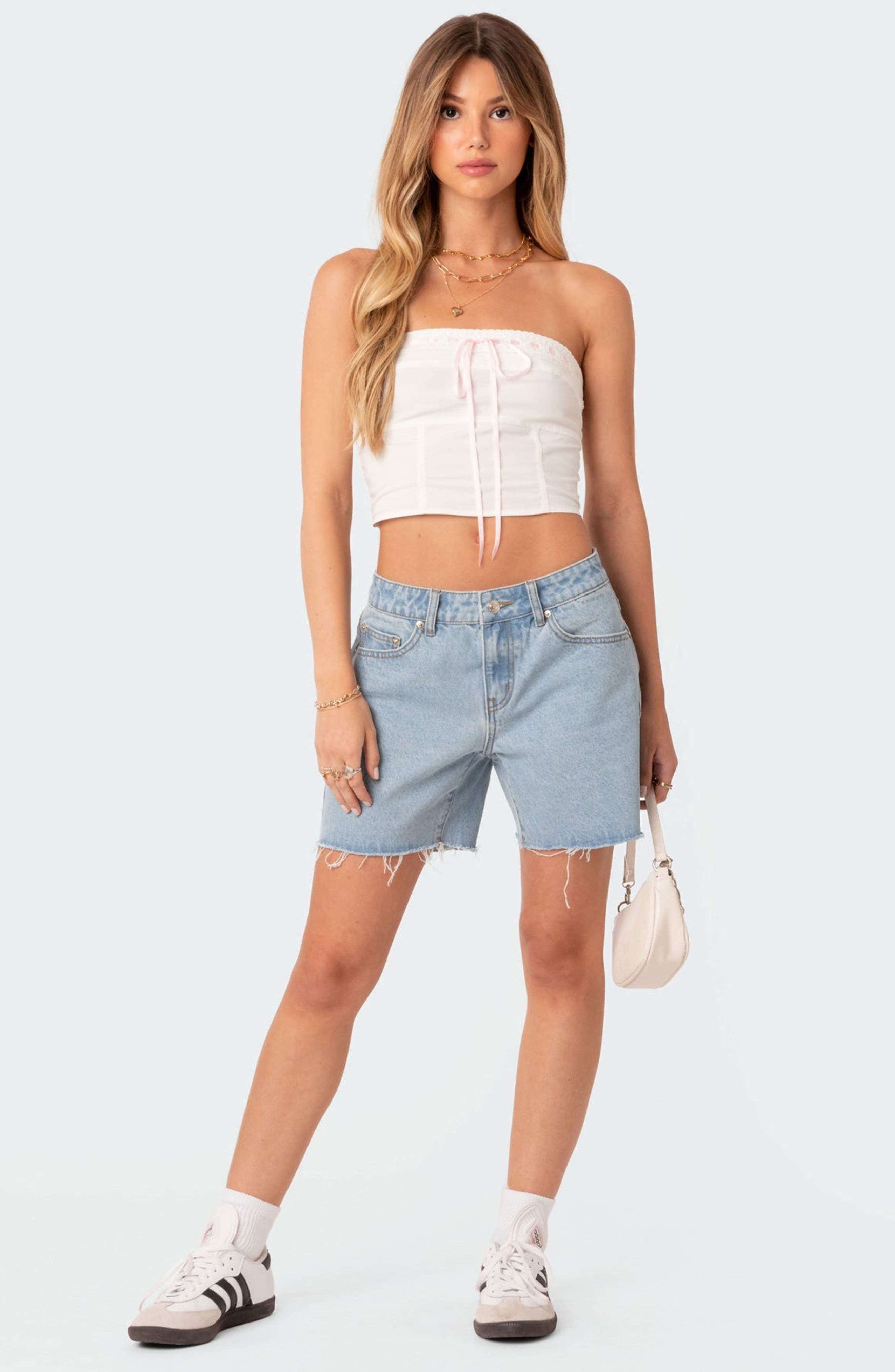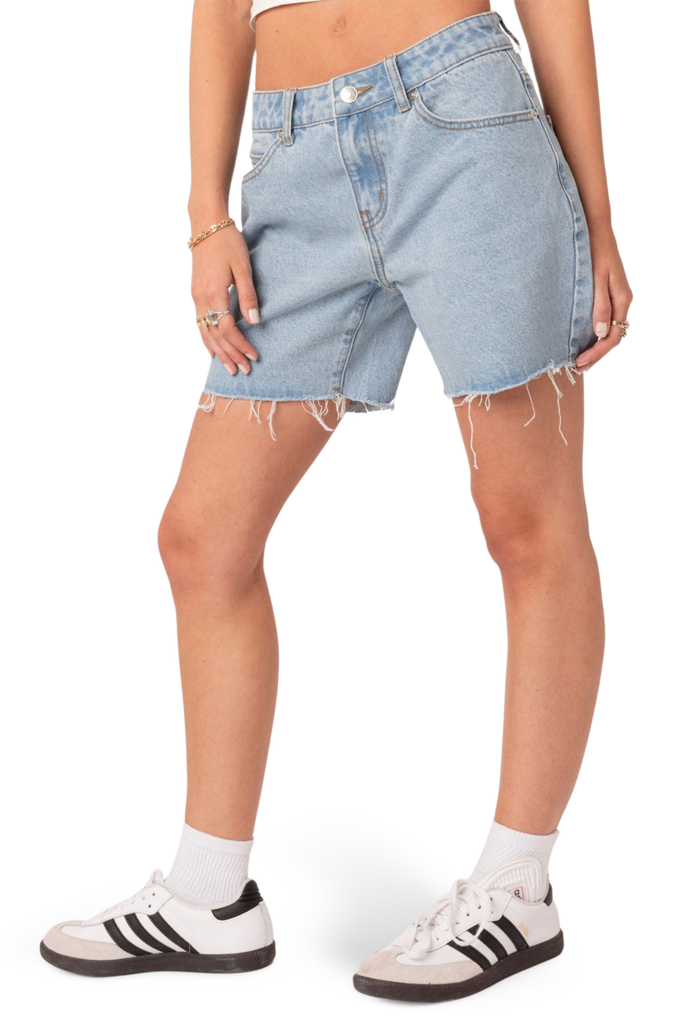 EDIKTED Tomboy Low Rise Cutoff Denim Shorts_Light-Blue
