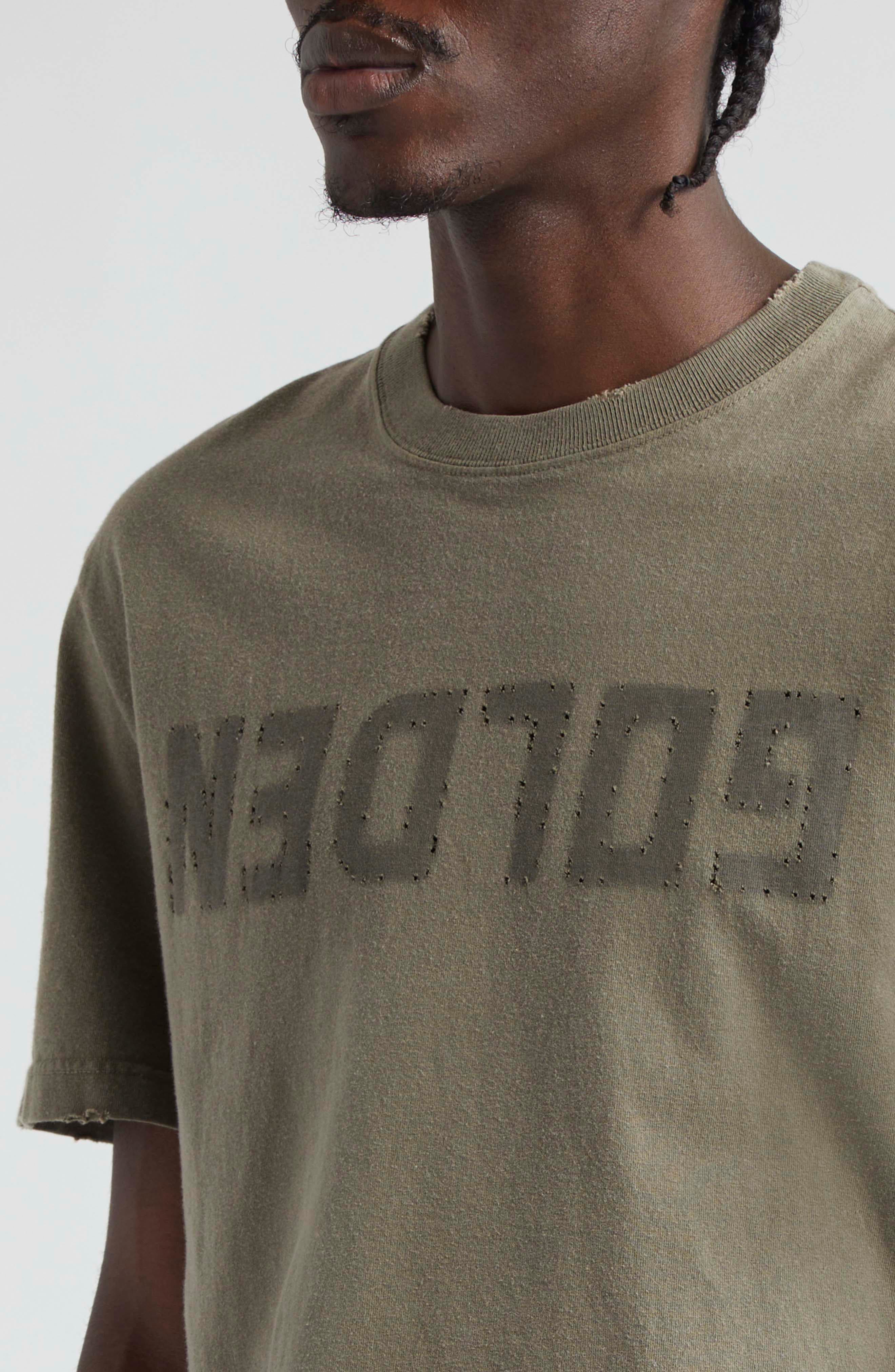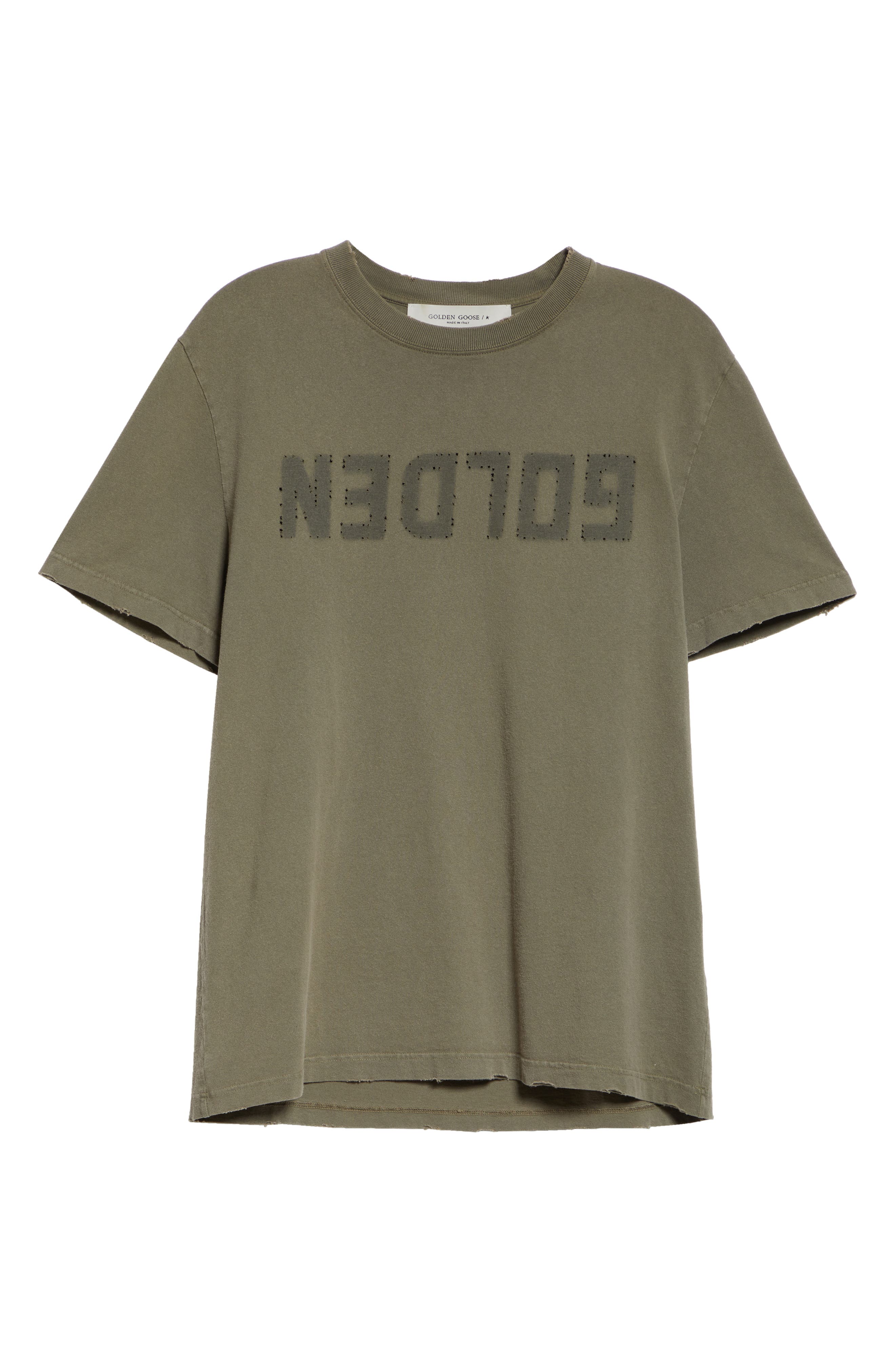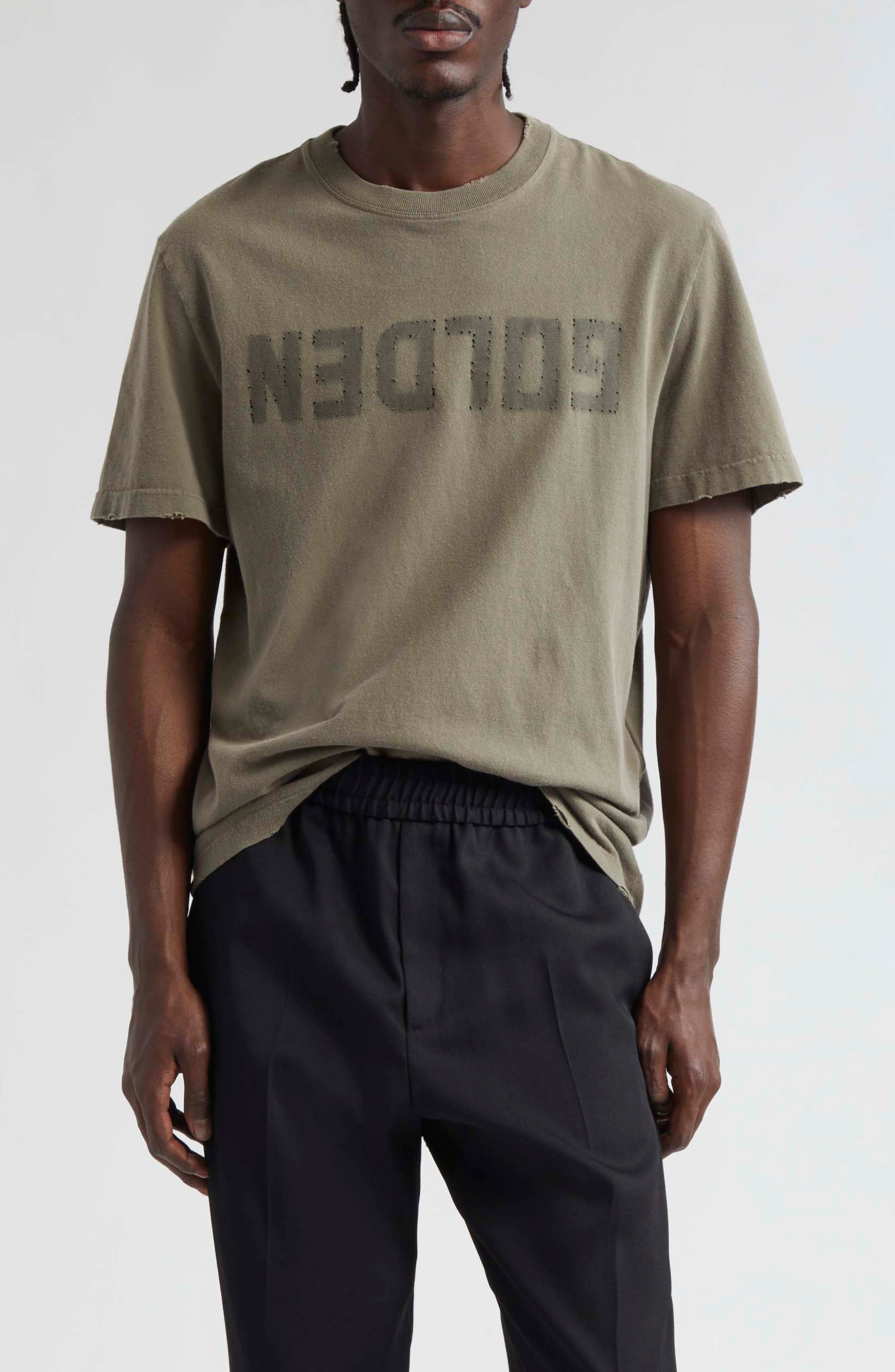 Golden Goose Distressed Upside Down Logo Cotton Graphic Tee_Dusty Olive