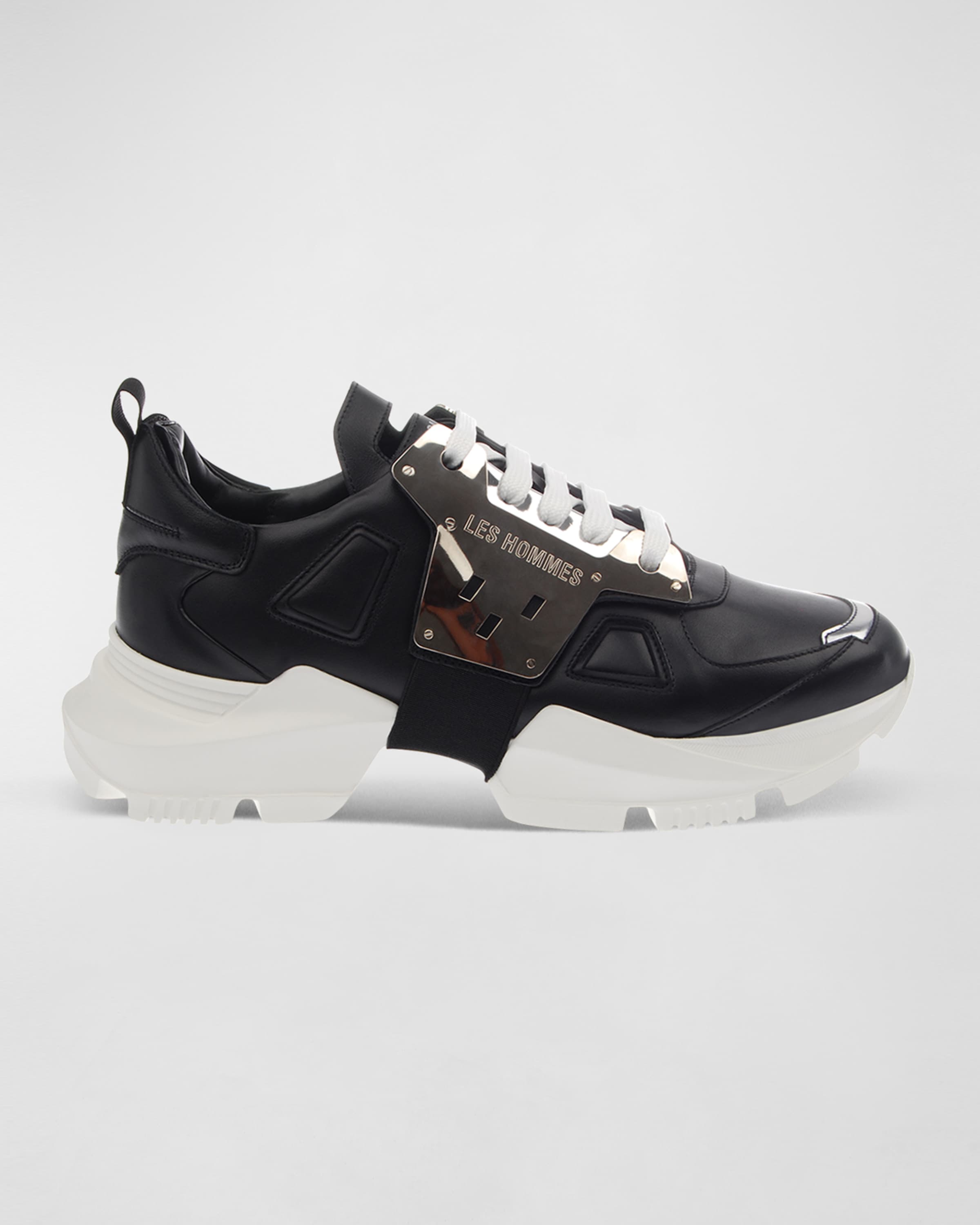 Les Hommes Mens Metallic Leather Chunky Low-Top Sneakers, Black