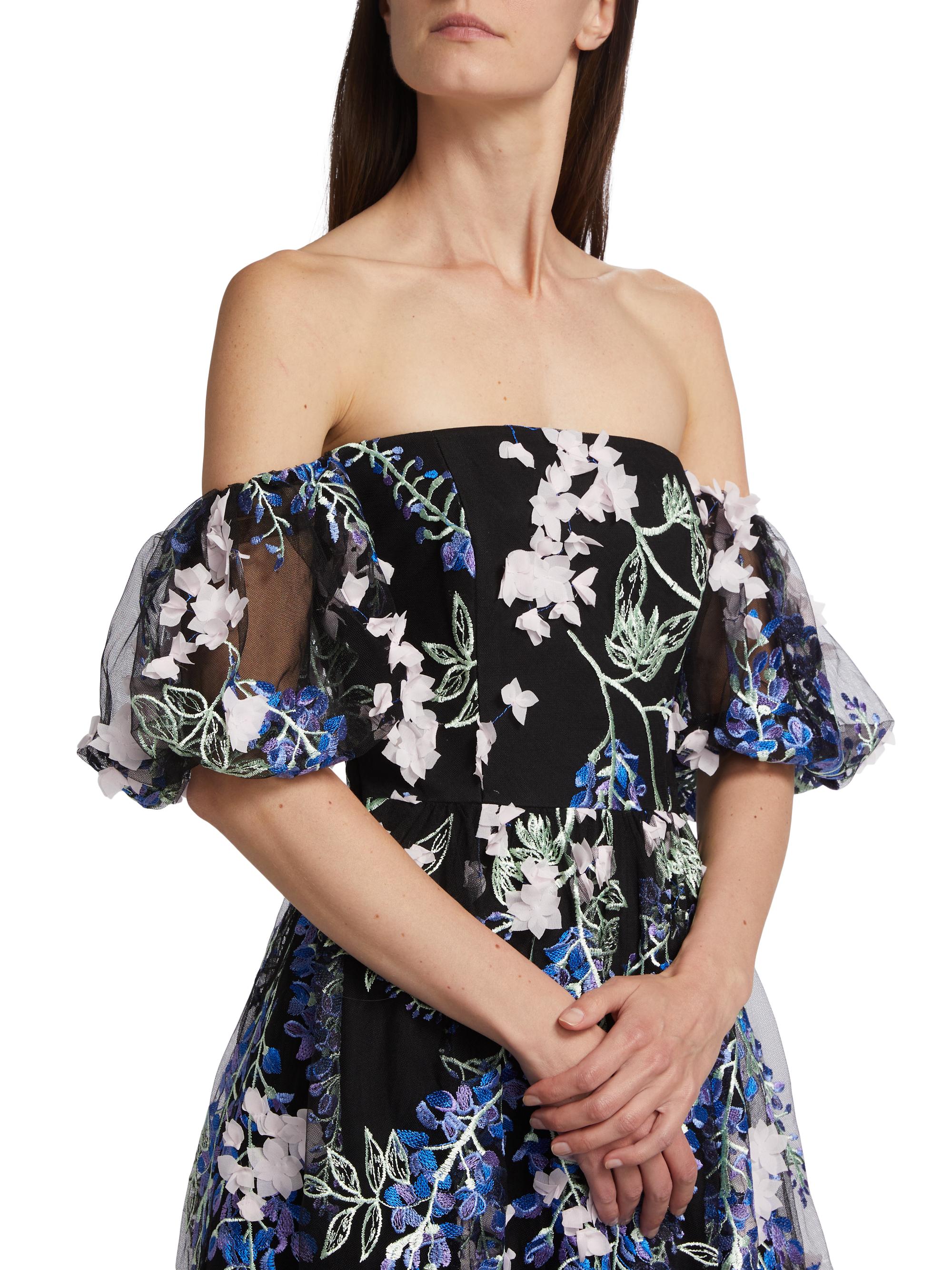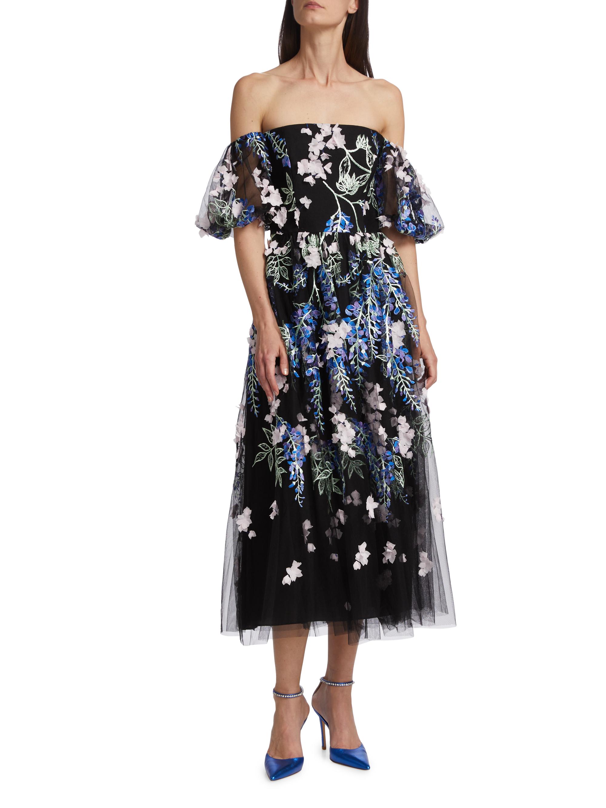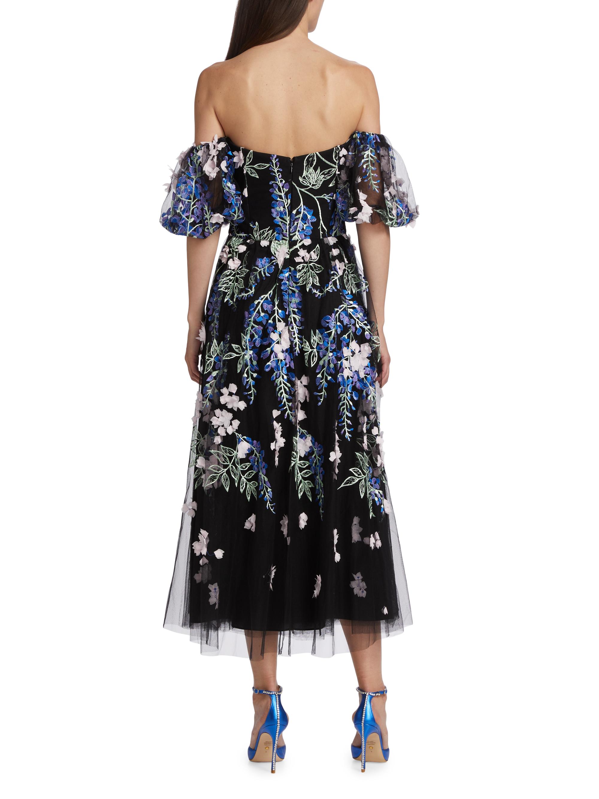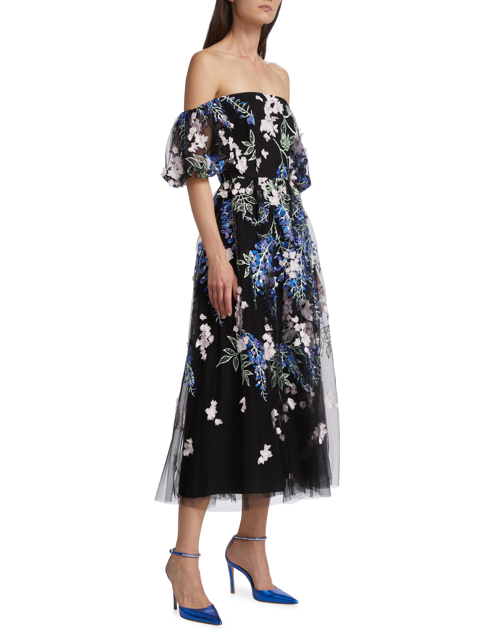 Marchesa Notte Floral Off-The-Shoulder Midi-Dress