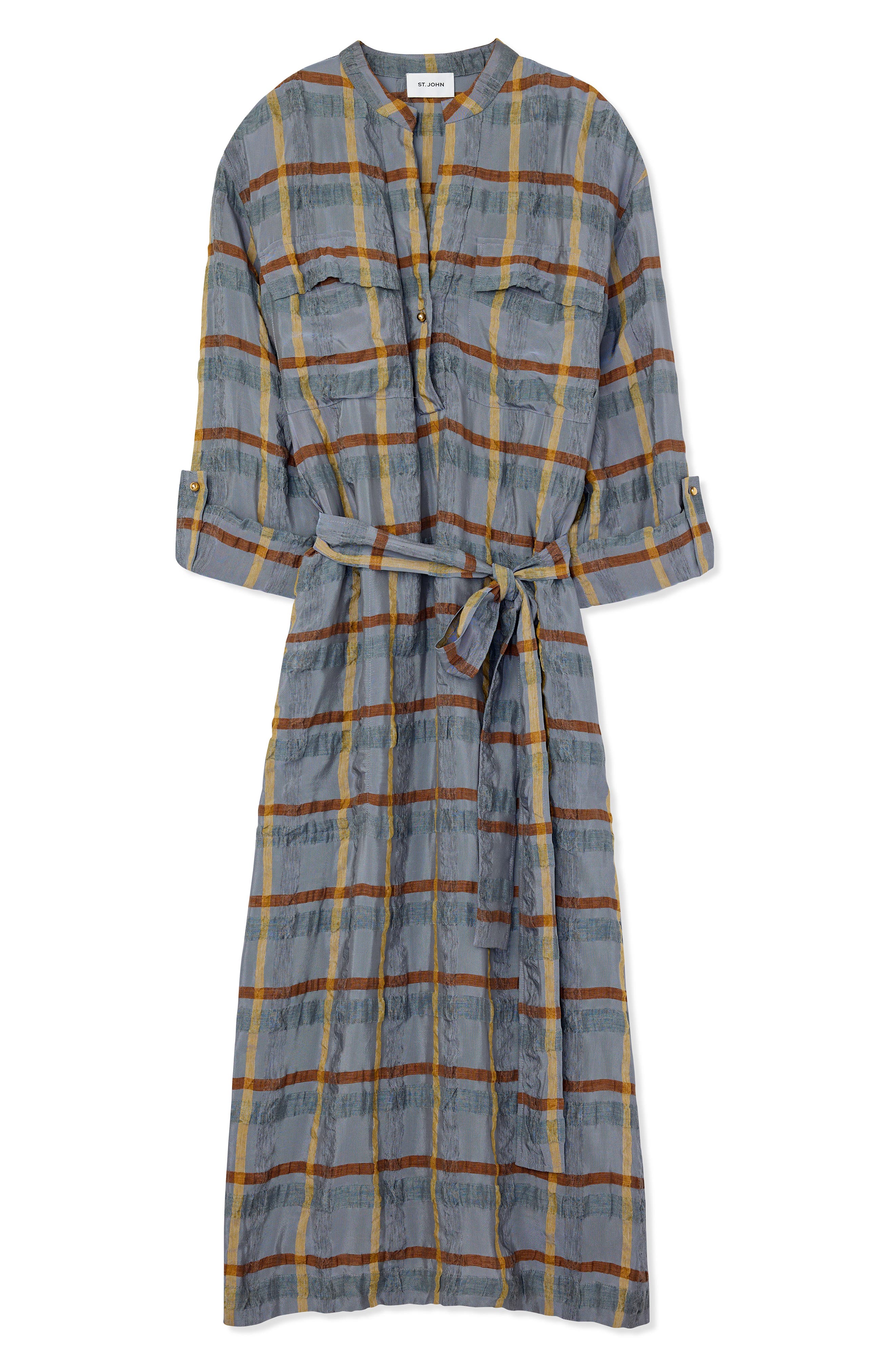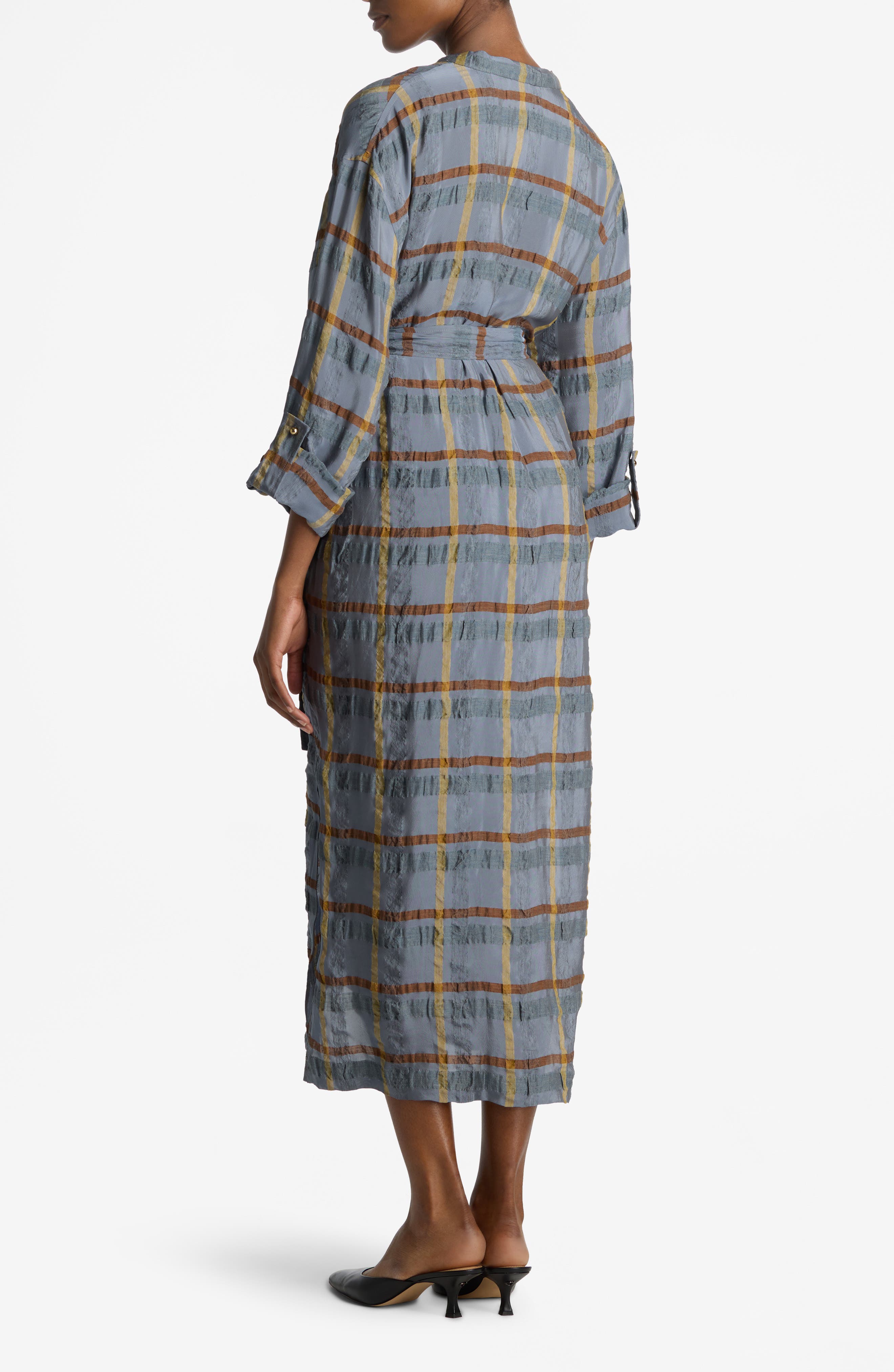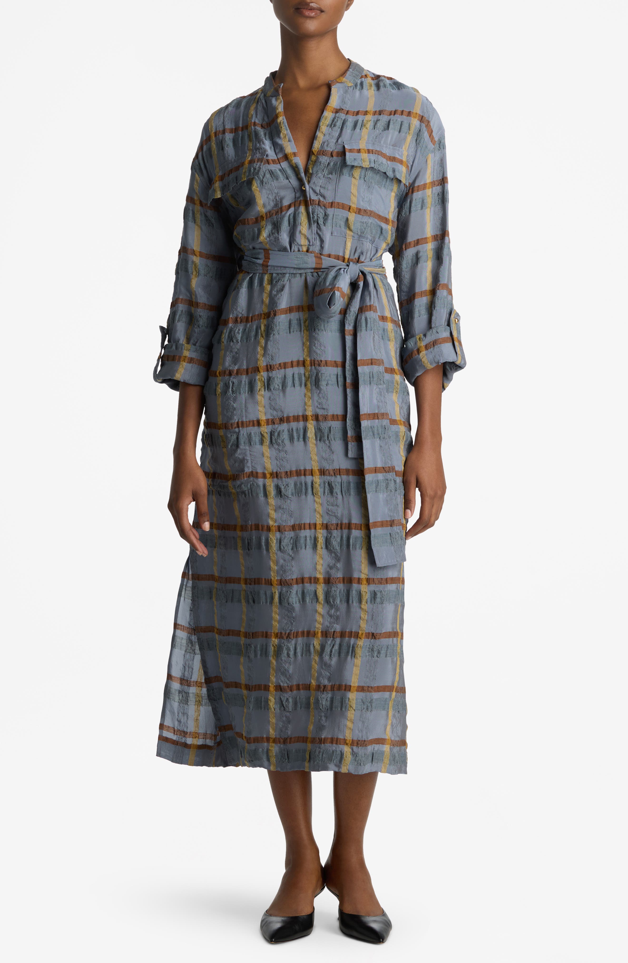 St John Collection St. John Collection Check Belted Seersucker Midi Shirtdress_Tahoe Slate/ Saddle Multi