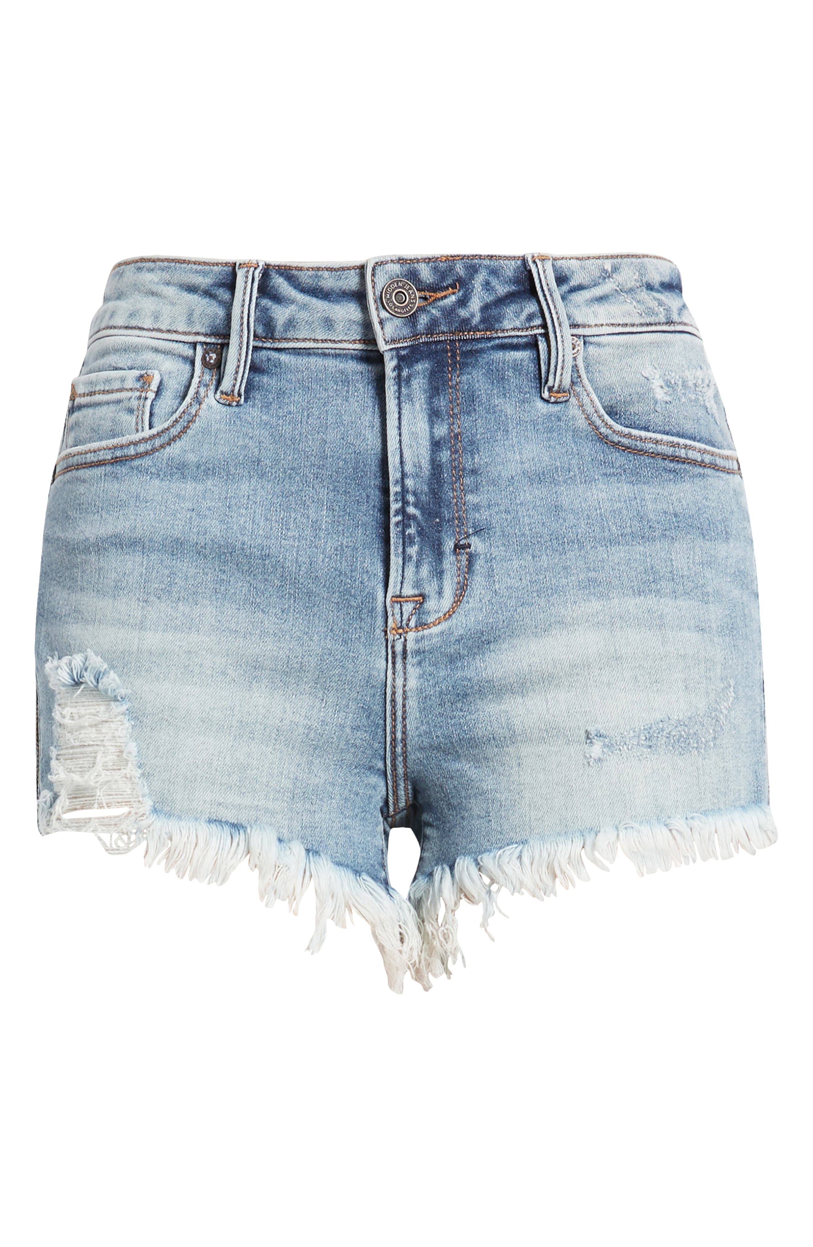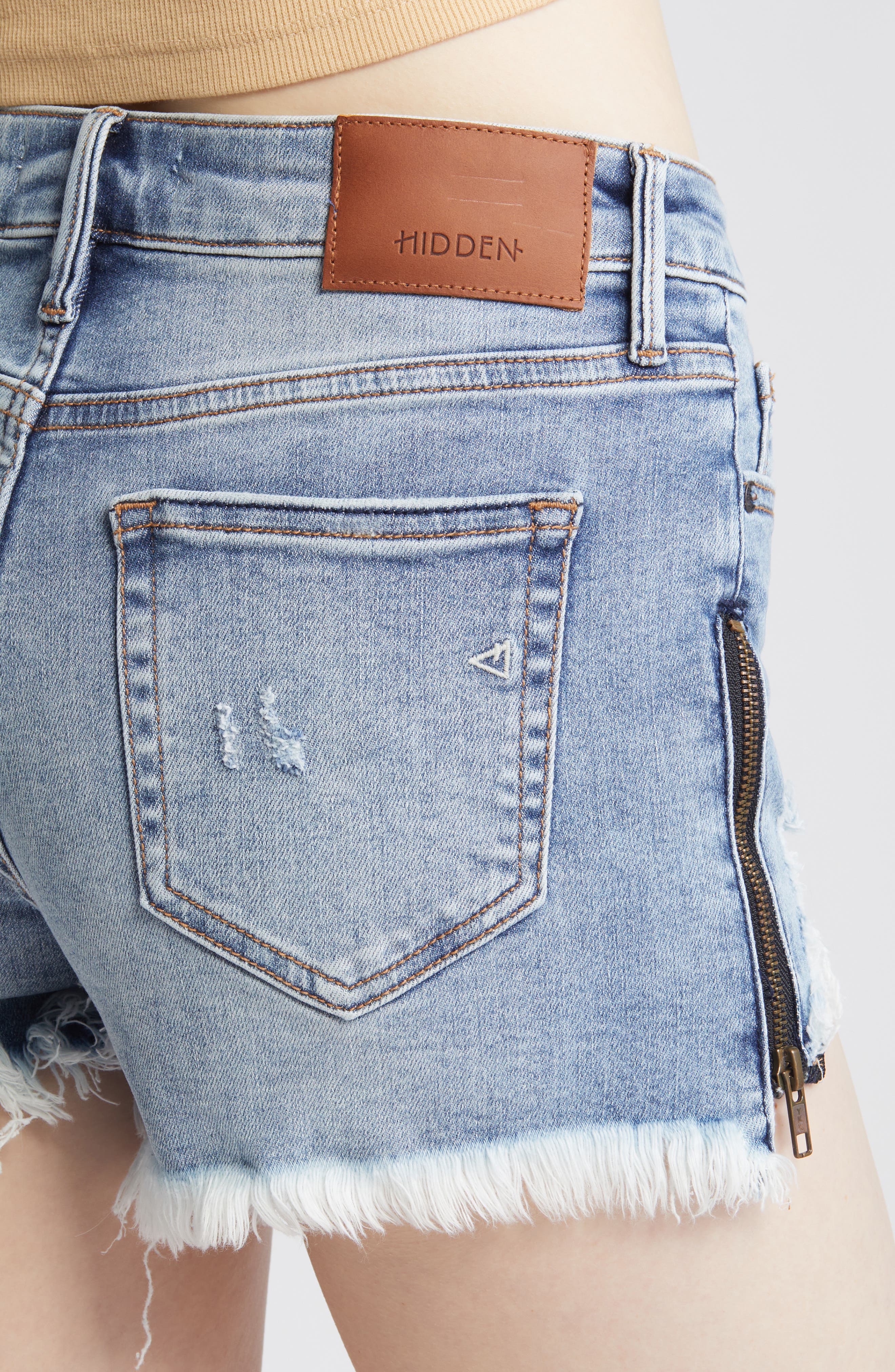 HIDDEN JEANS Distressed Side Zip Fringe Denim Shorts_Light Wash