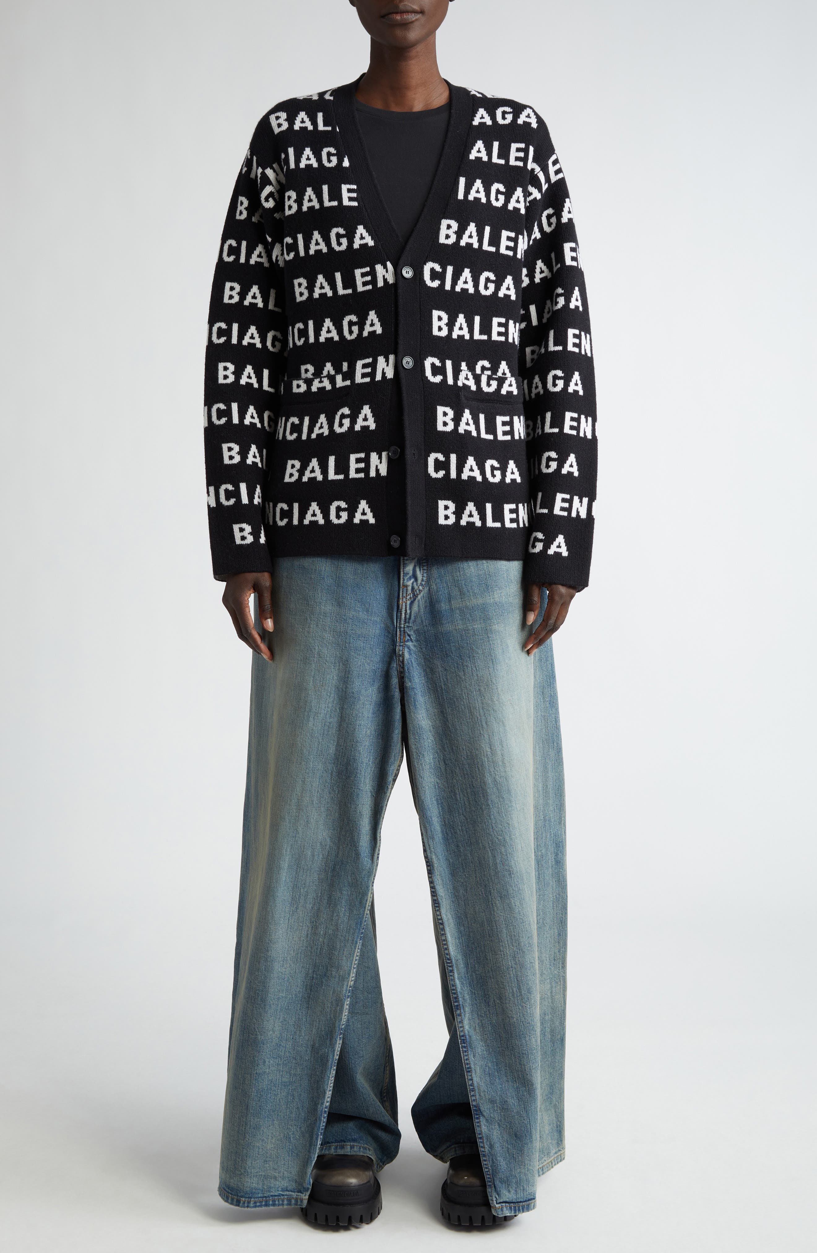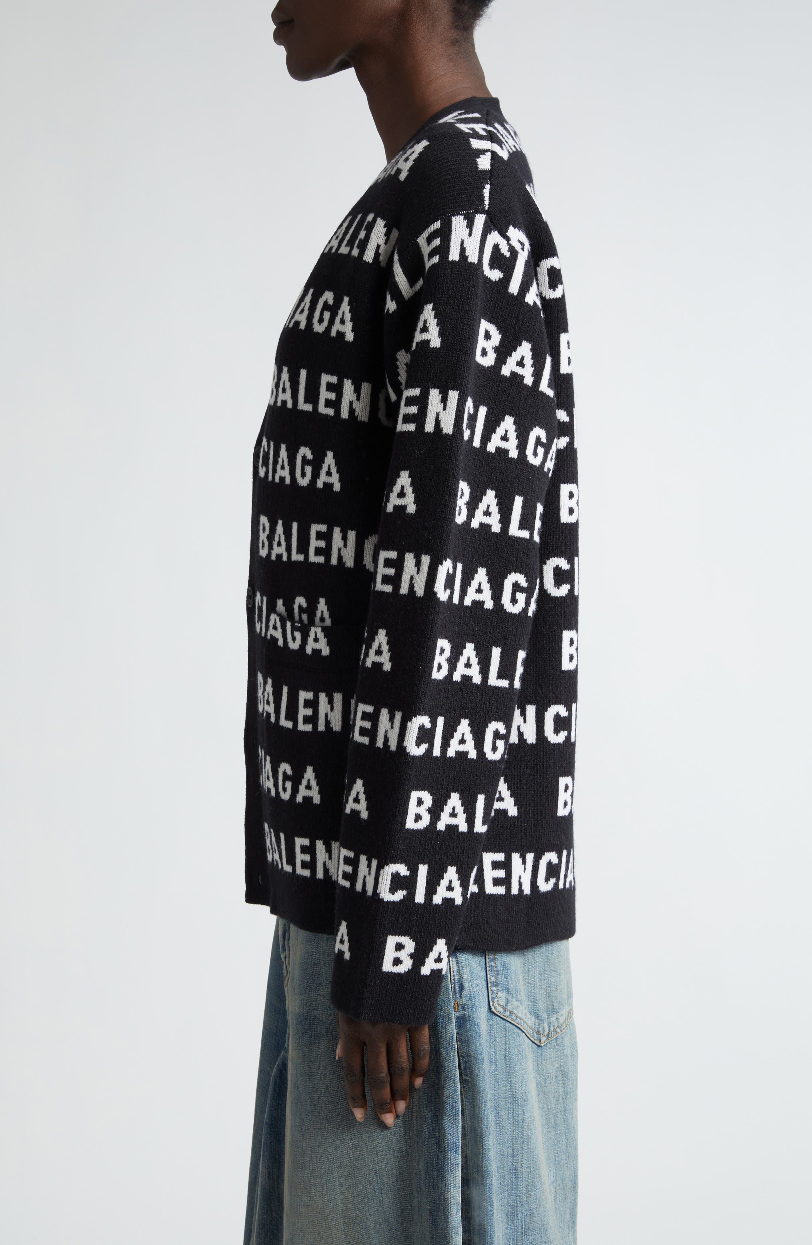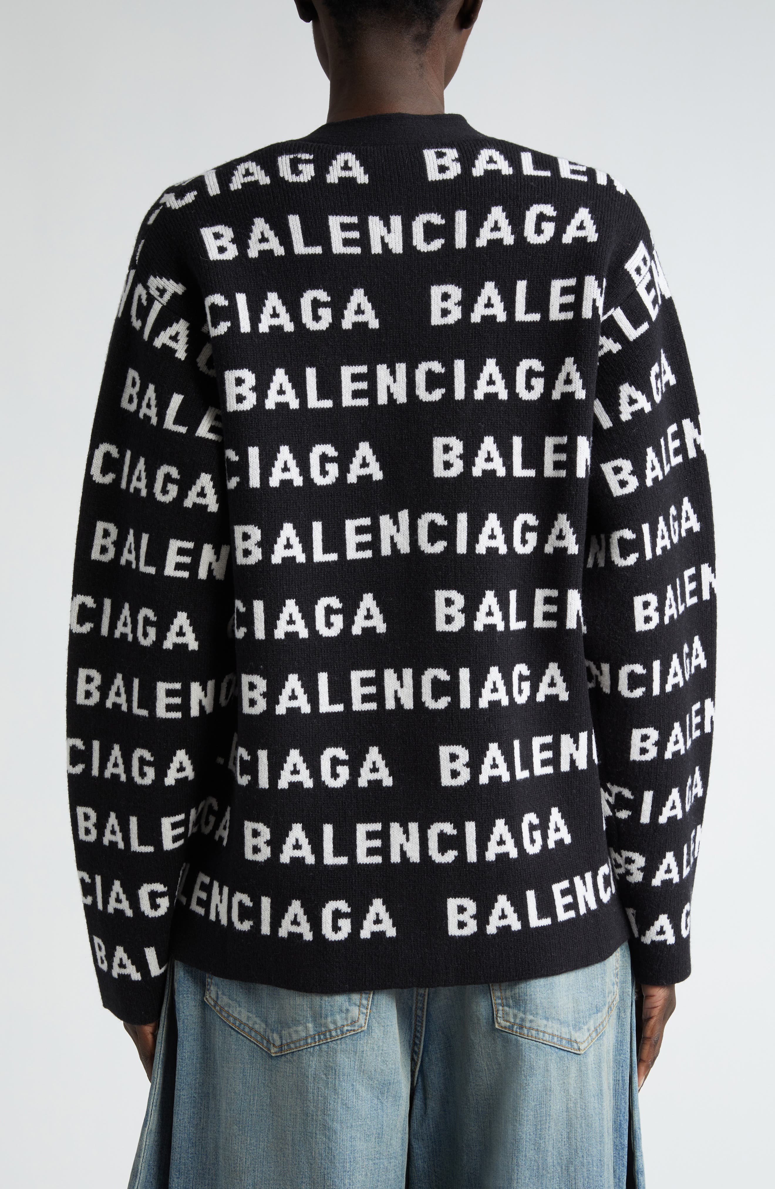 Balenciaga Logo Jacquard Wool Blend V-Neck Cardigan_Black/ White
