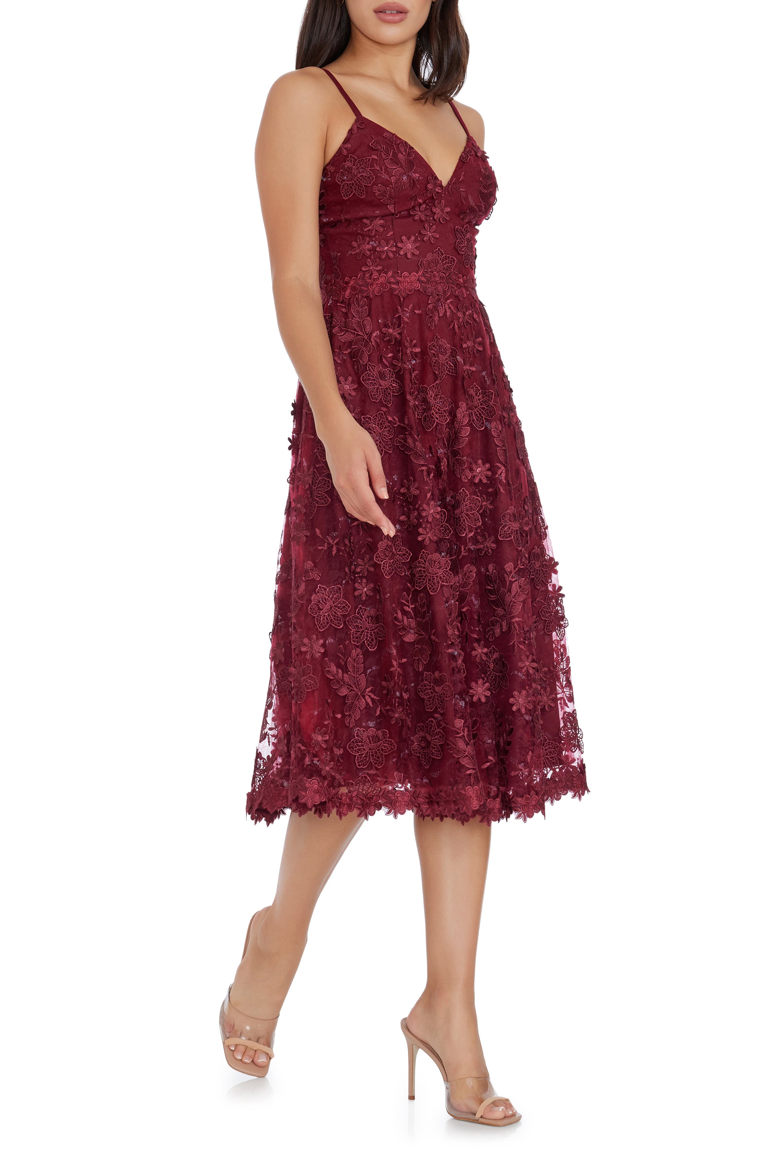 Dress the Population Tahani Floral Embroidered Fit & Flare Midi Dress_Burgundy