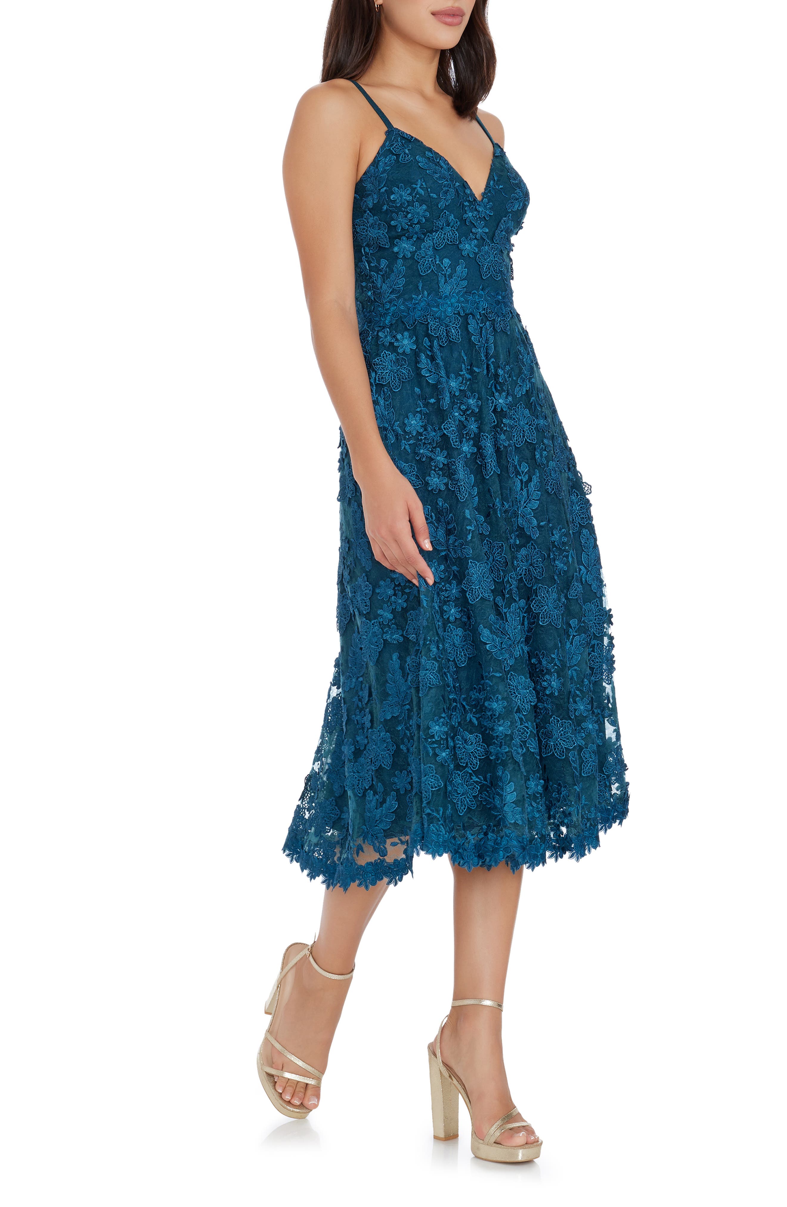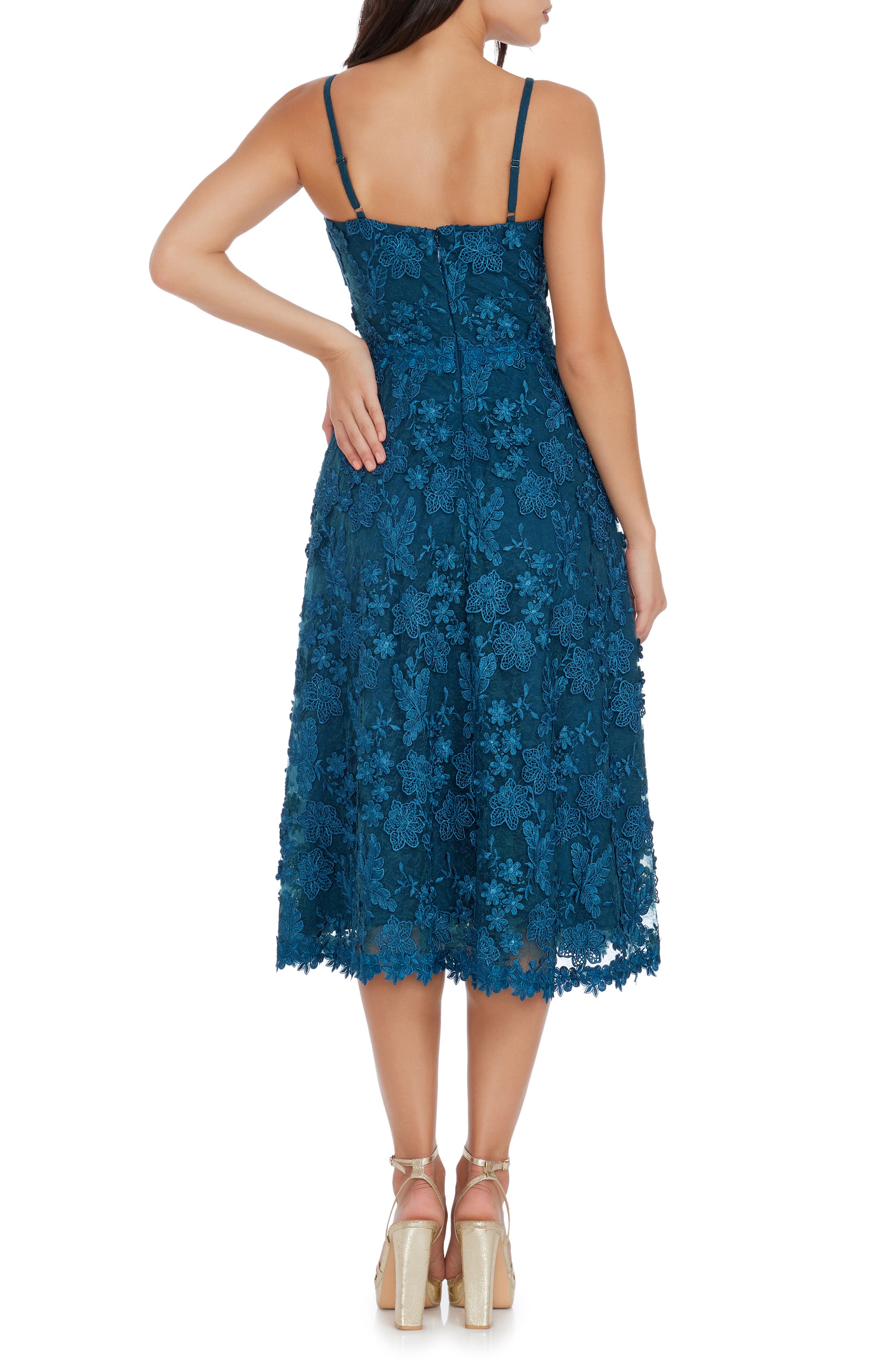 Dress the Population Tahani Floral Embroidered Fit & Flare Midi Dress_Peacock Blue