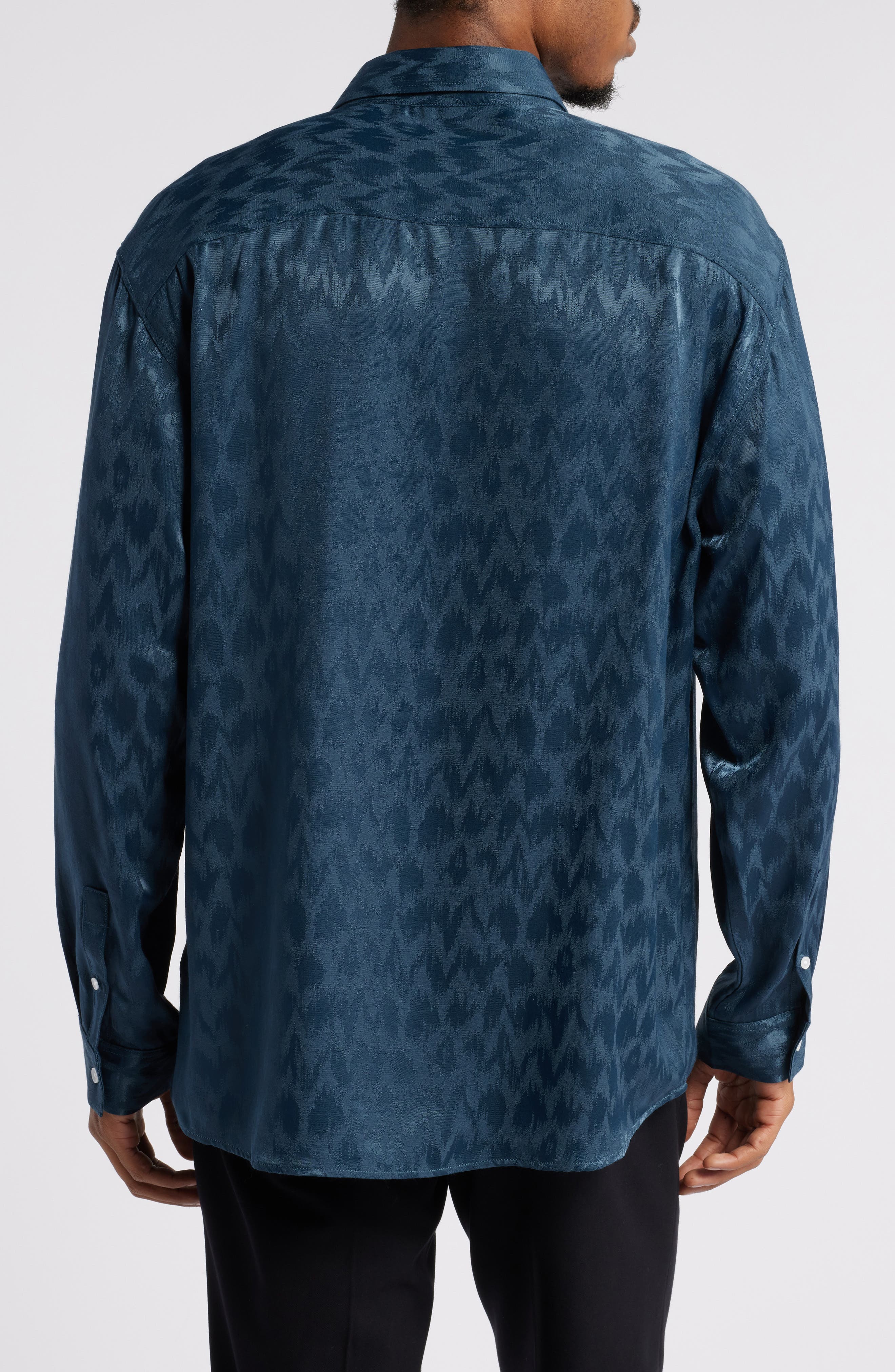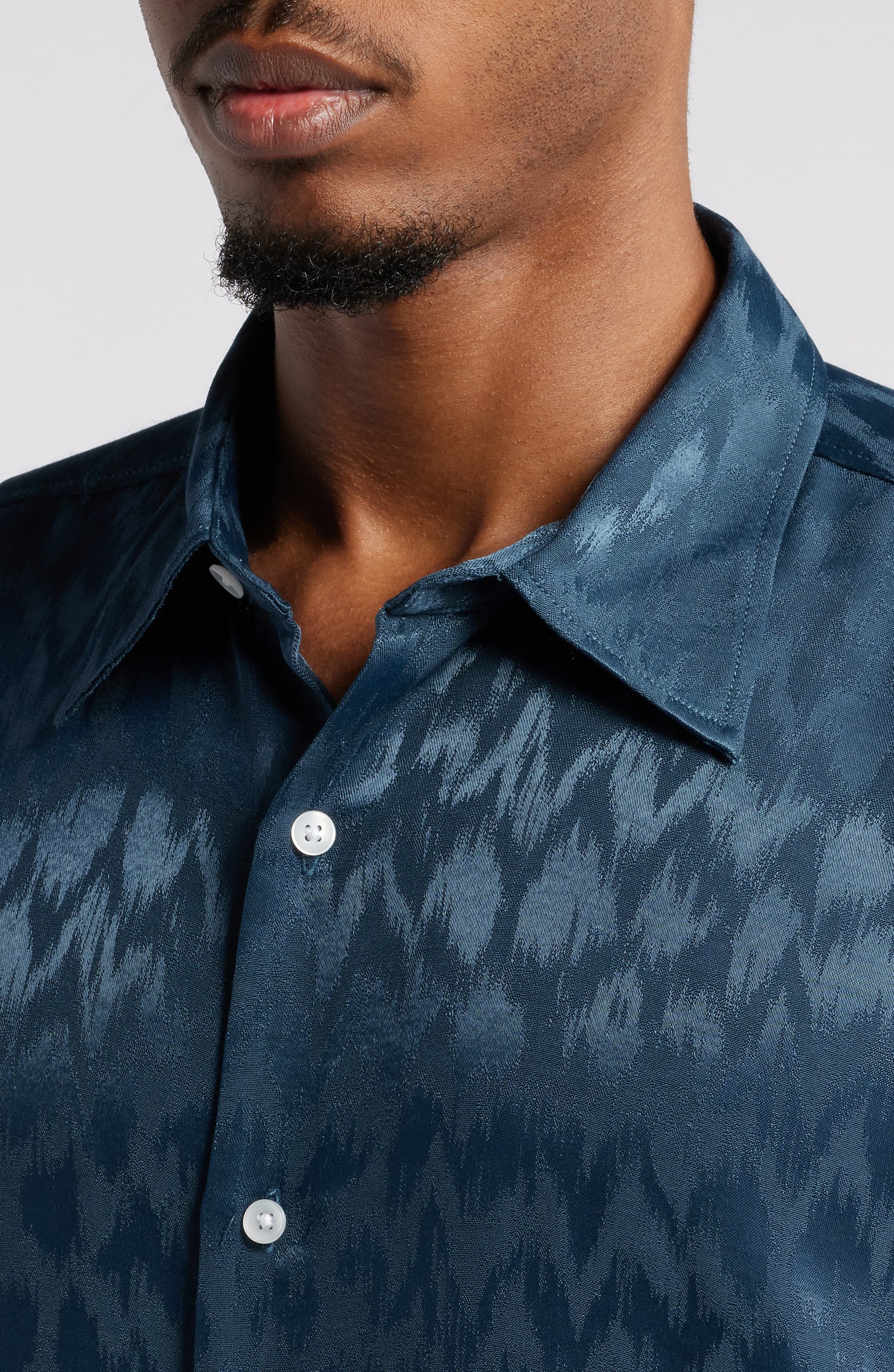Open Edit Jacquard Stretch Satin Button-Up Shirt_Navy Sky