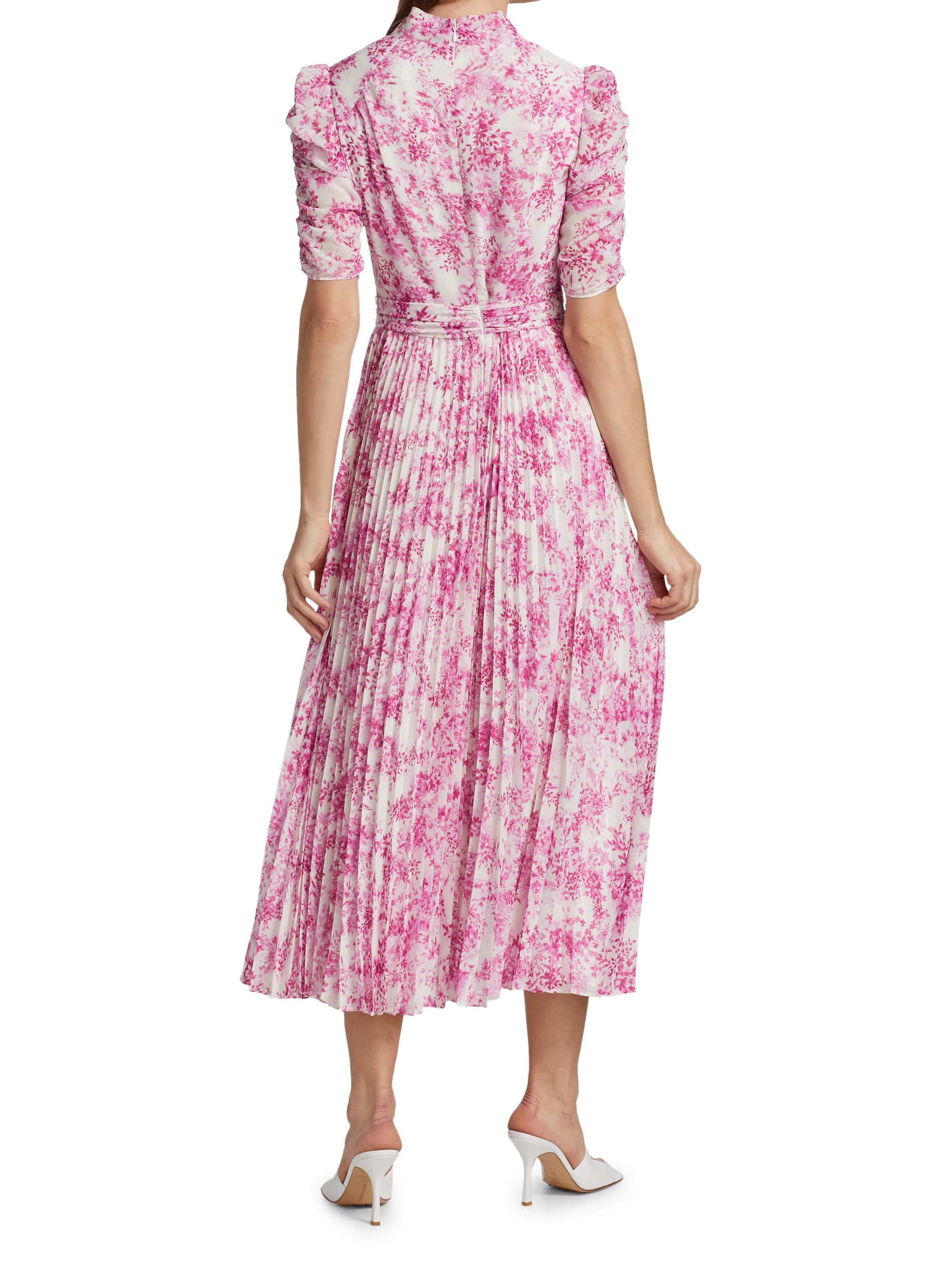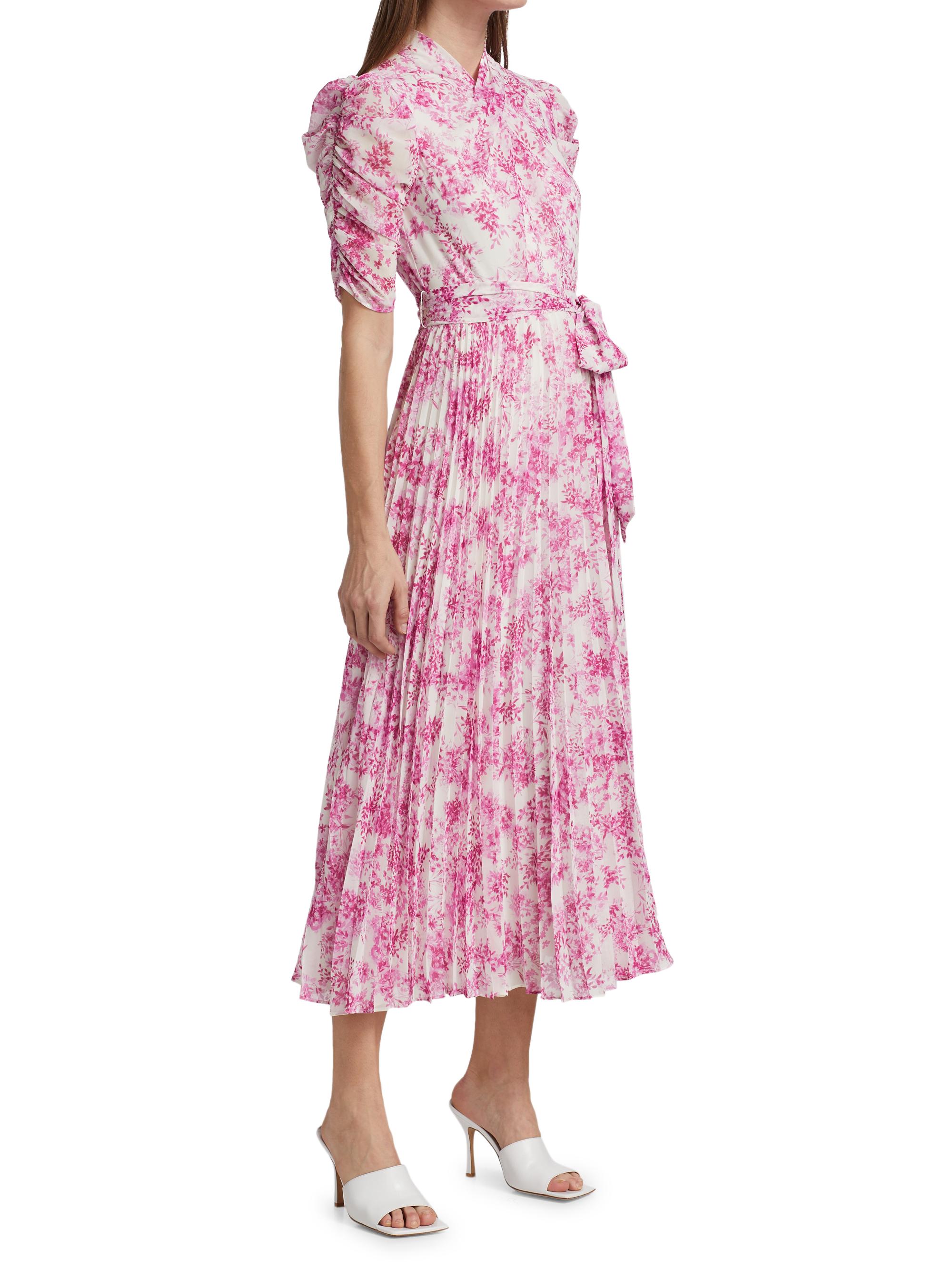 ML Monique Lhuillier Pleated Belted Floral Midi-Dress