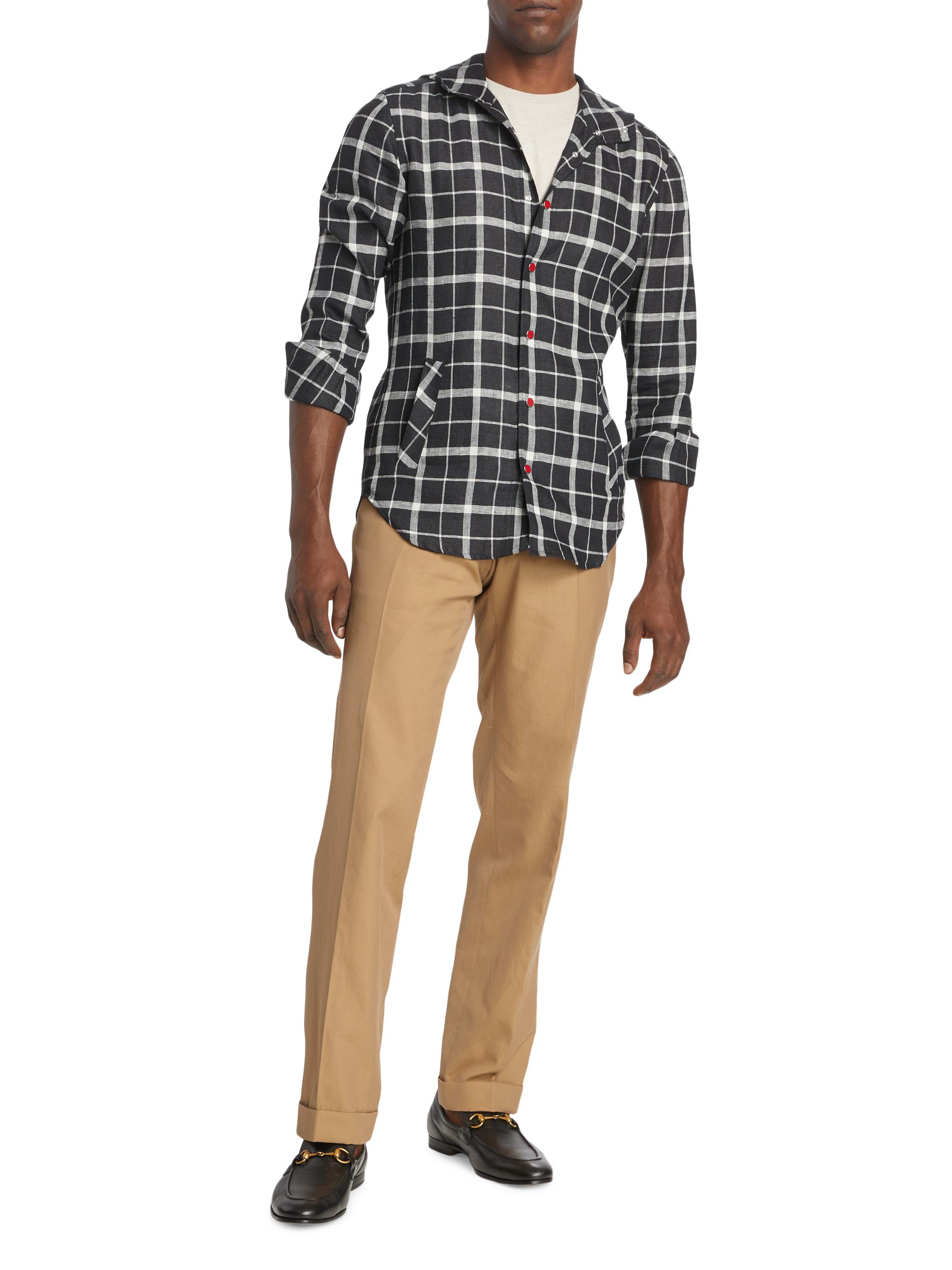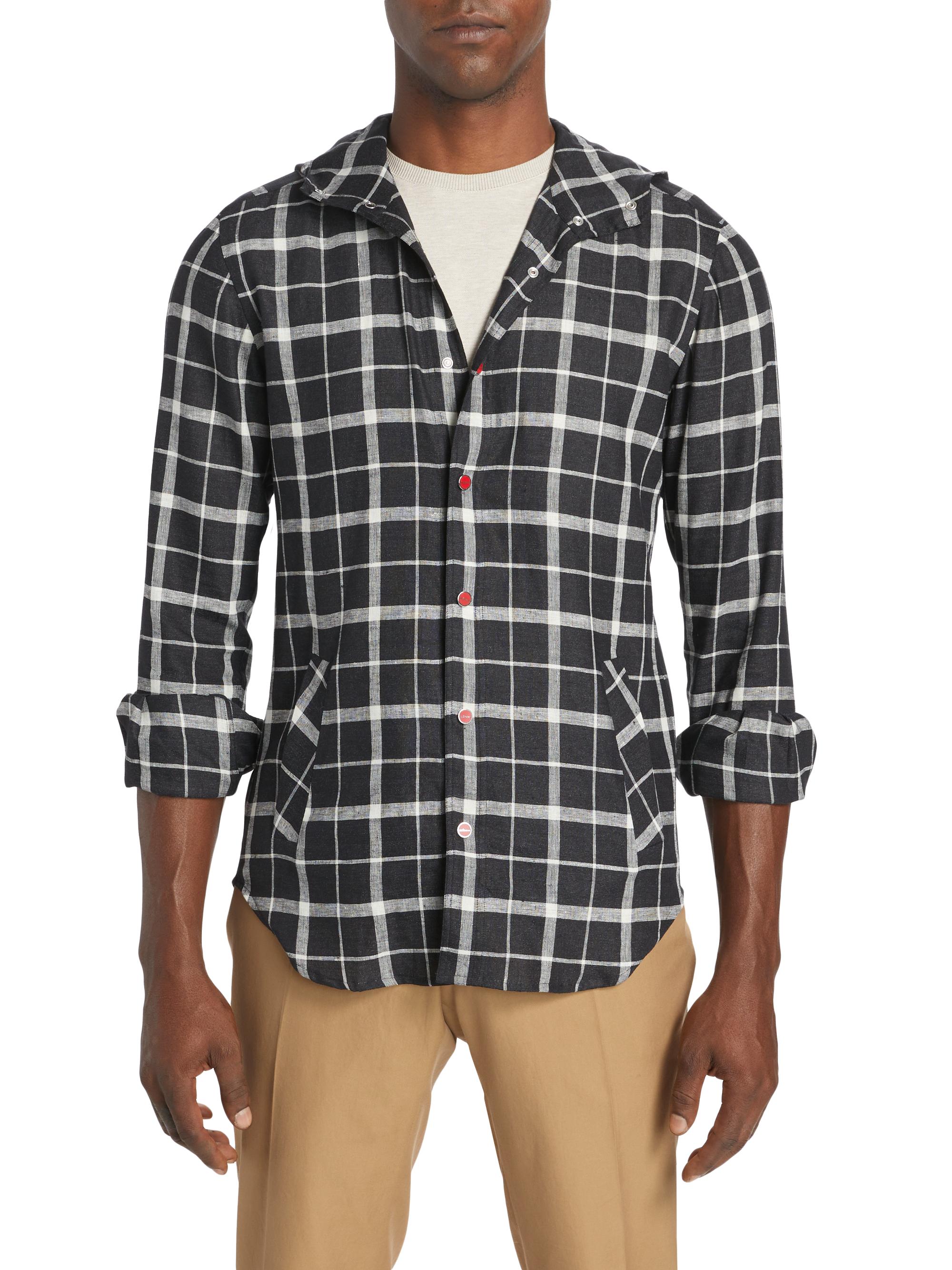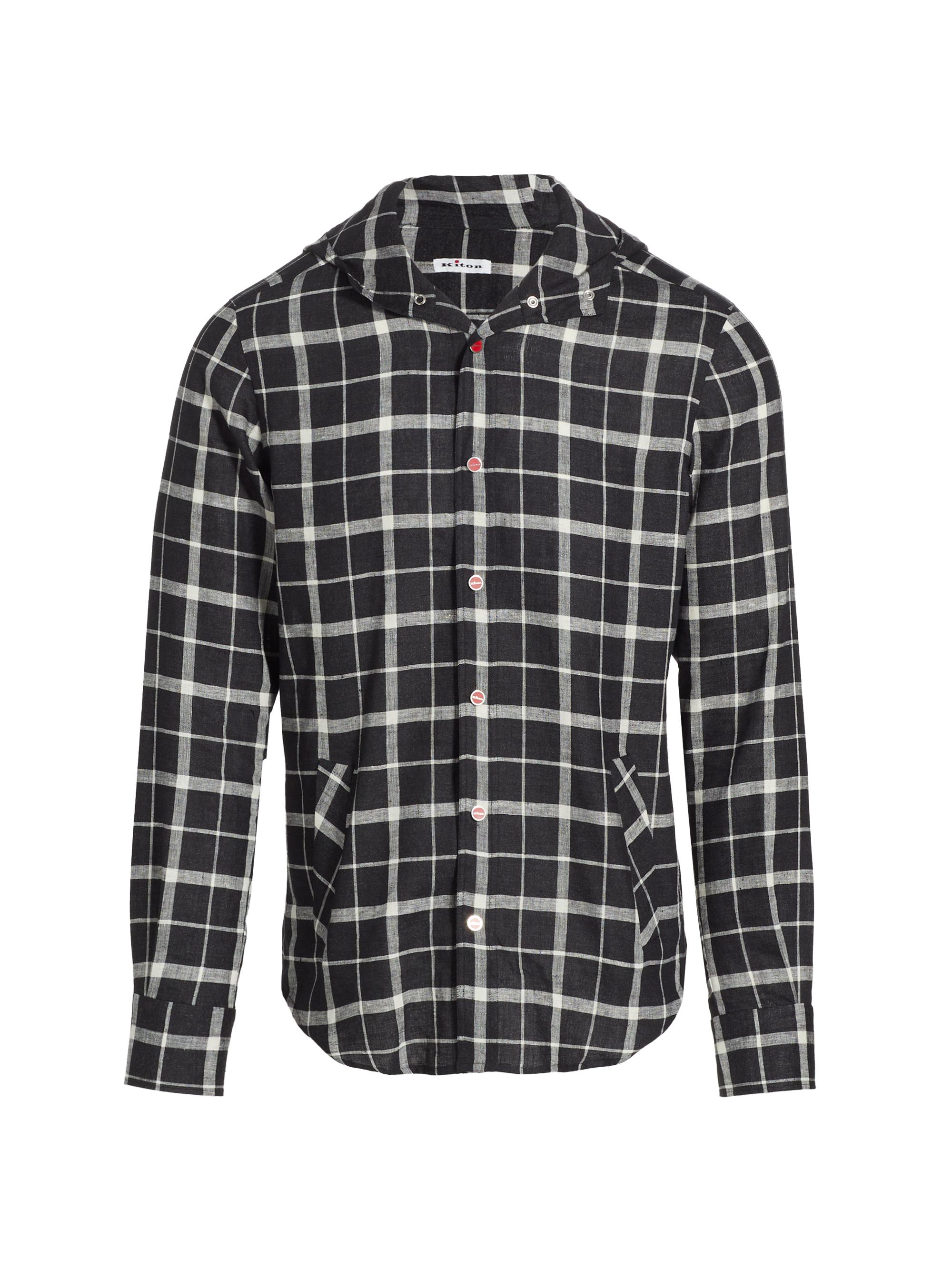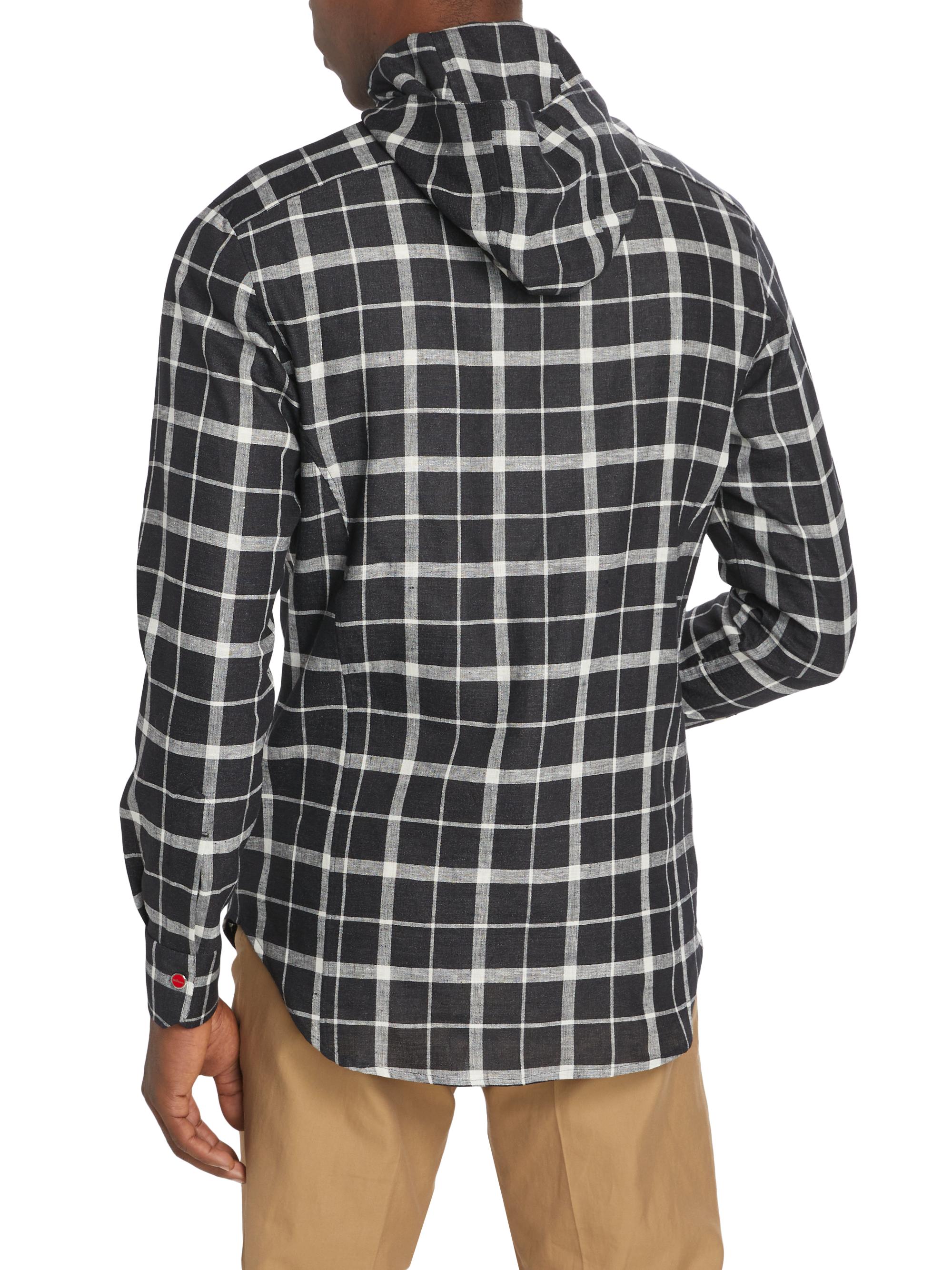Kiton Mariano Plaid Linen Hooded Shirt BLACK