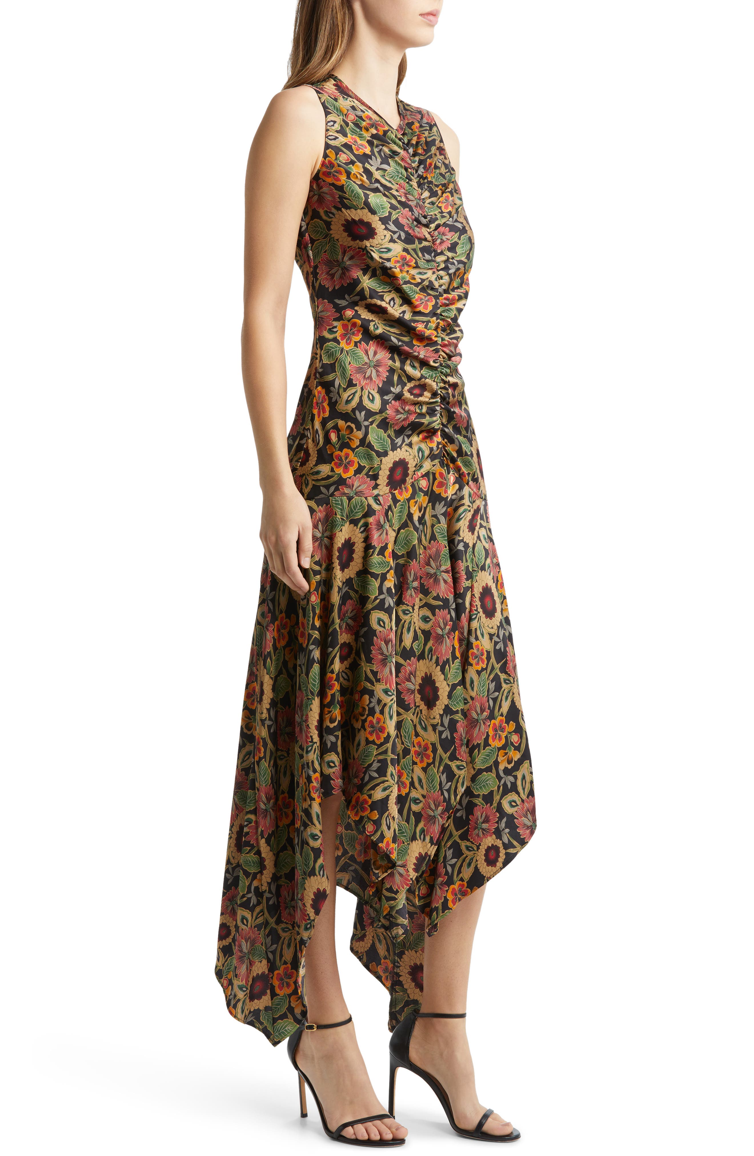 MELLODAY Floral Print Ruched Satin Midi Dress_Black Multi