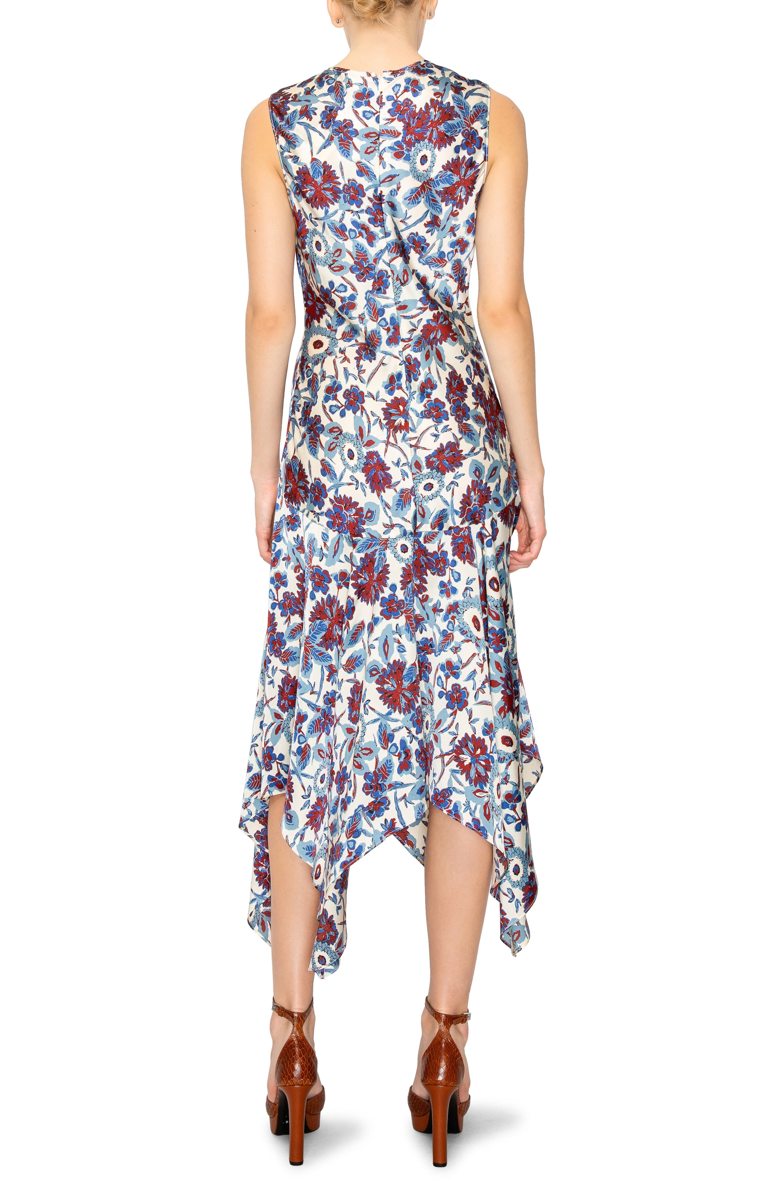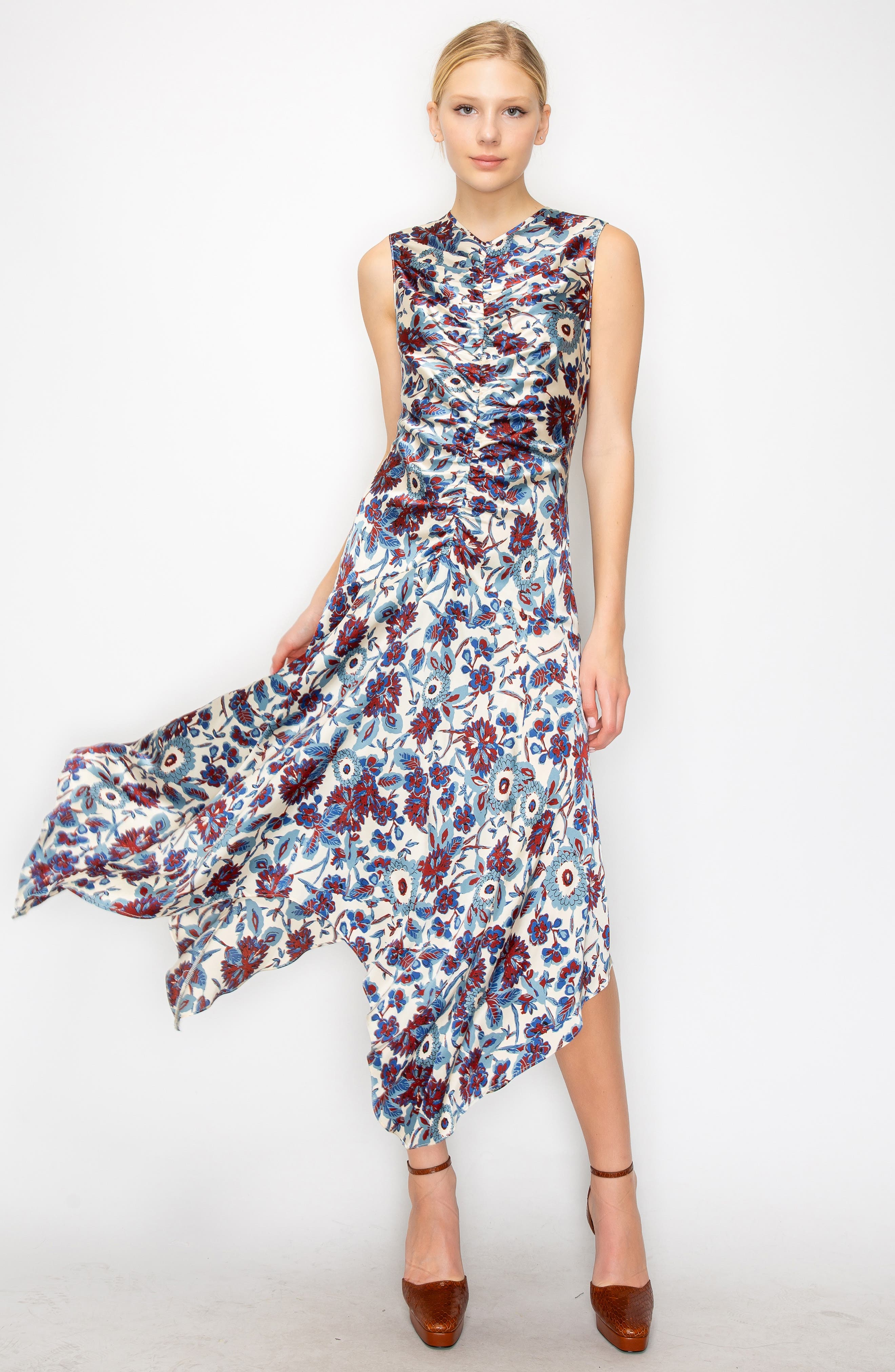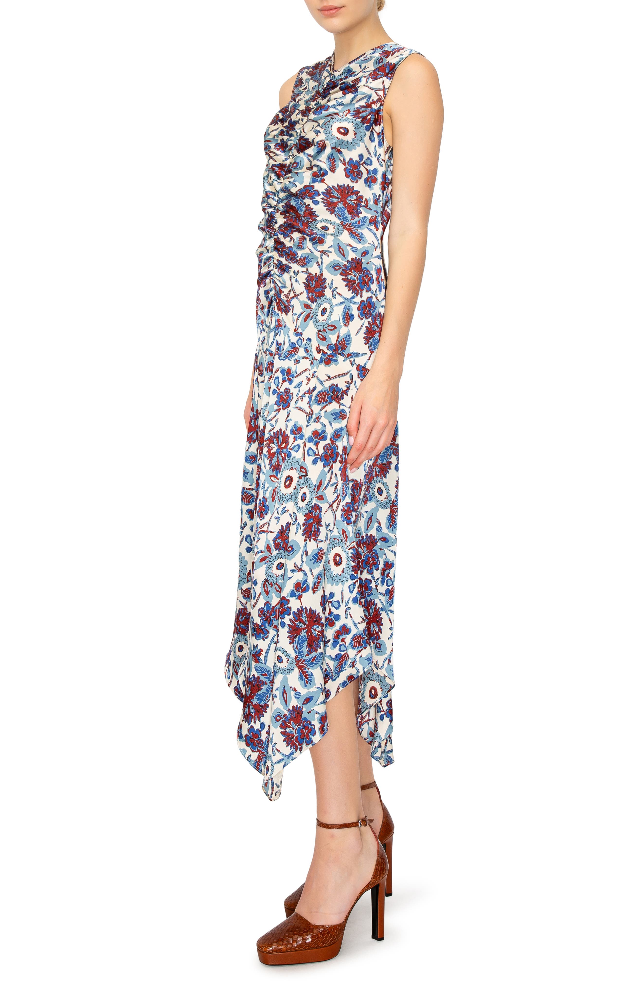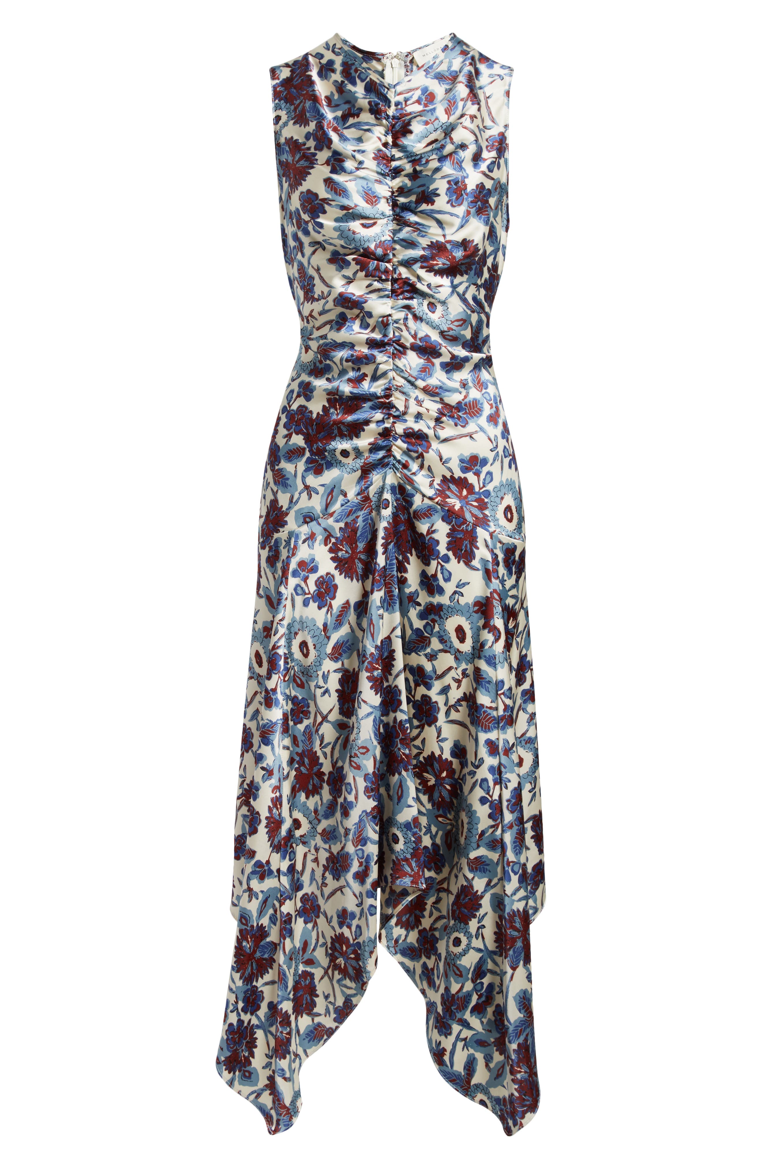 MELLODAY Floral Print Ruched Satin Midi Dress_Bone Blue