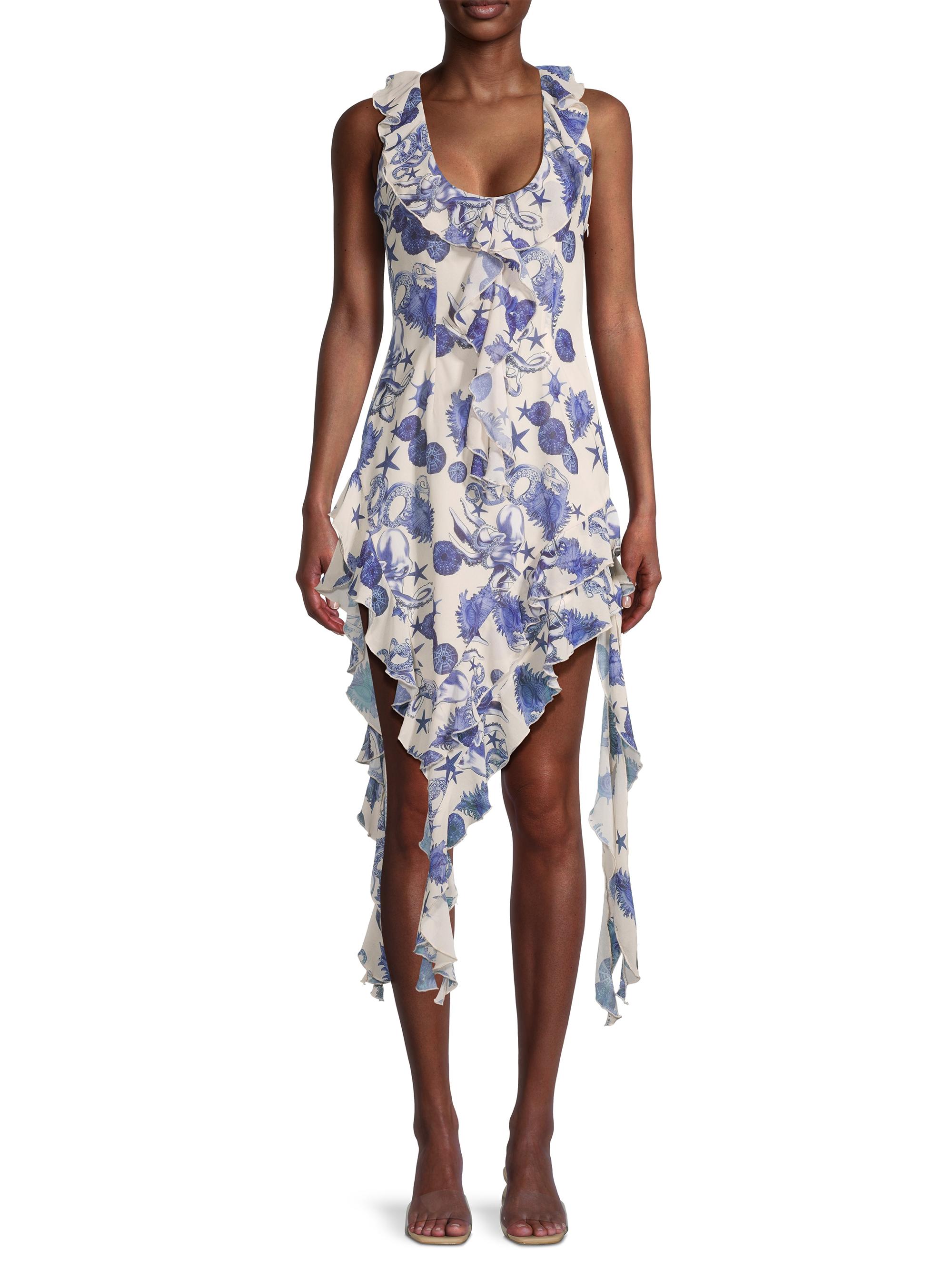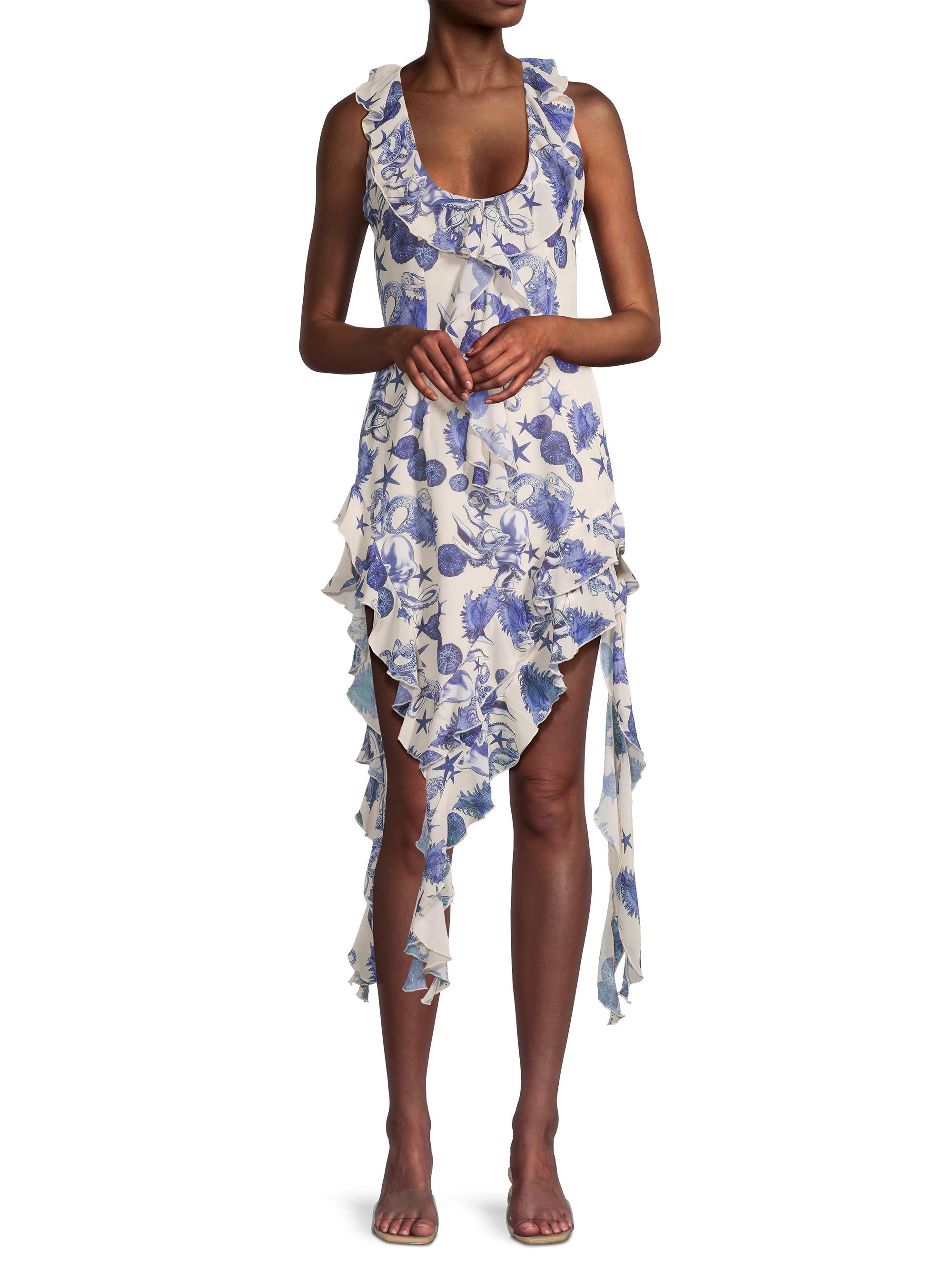 Oceanus Laguna Asymmetric Ruffled Midi-Dress