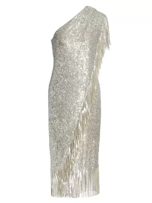 Badgley Mischka Fringed Sequin One-Shoulder Dress
