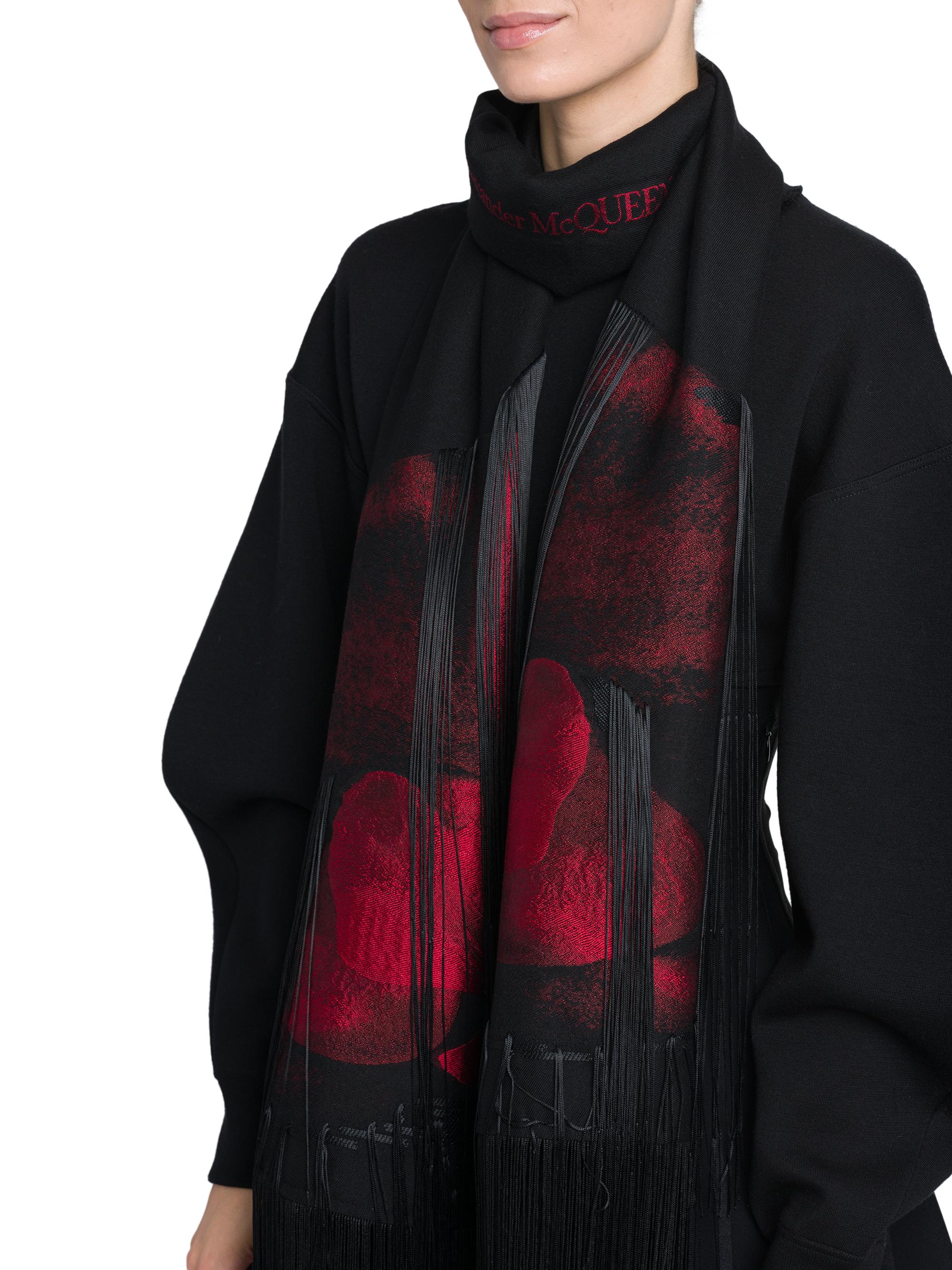Alexander McQueen Orchid Monarch Long Fringed Scarf BLACK RED