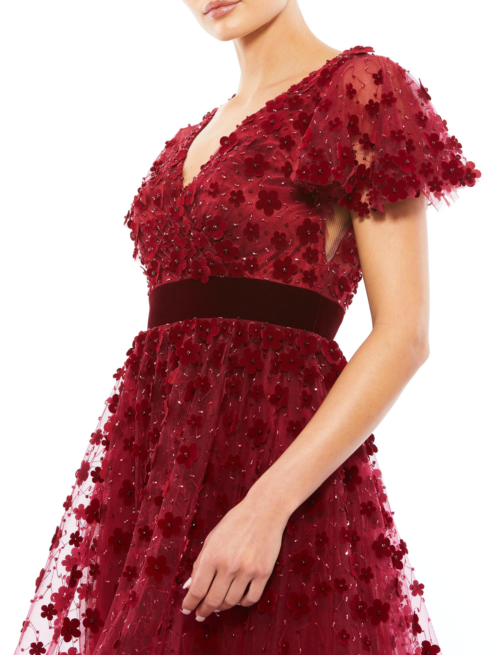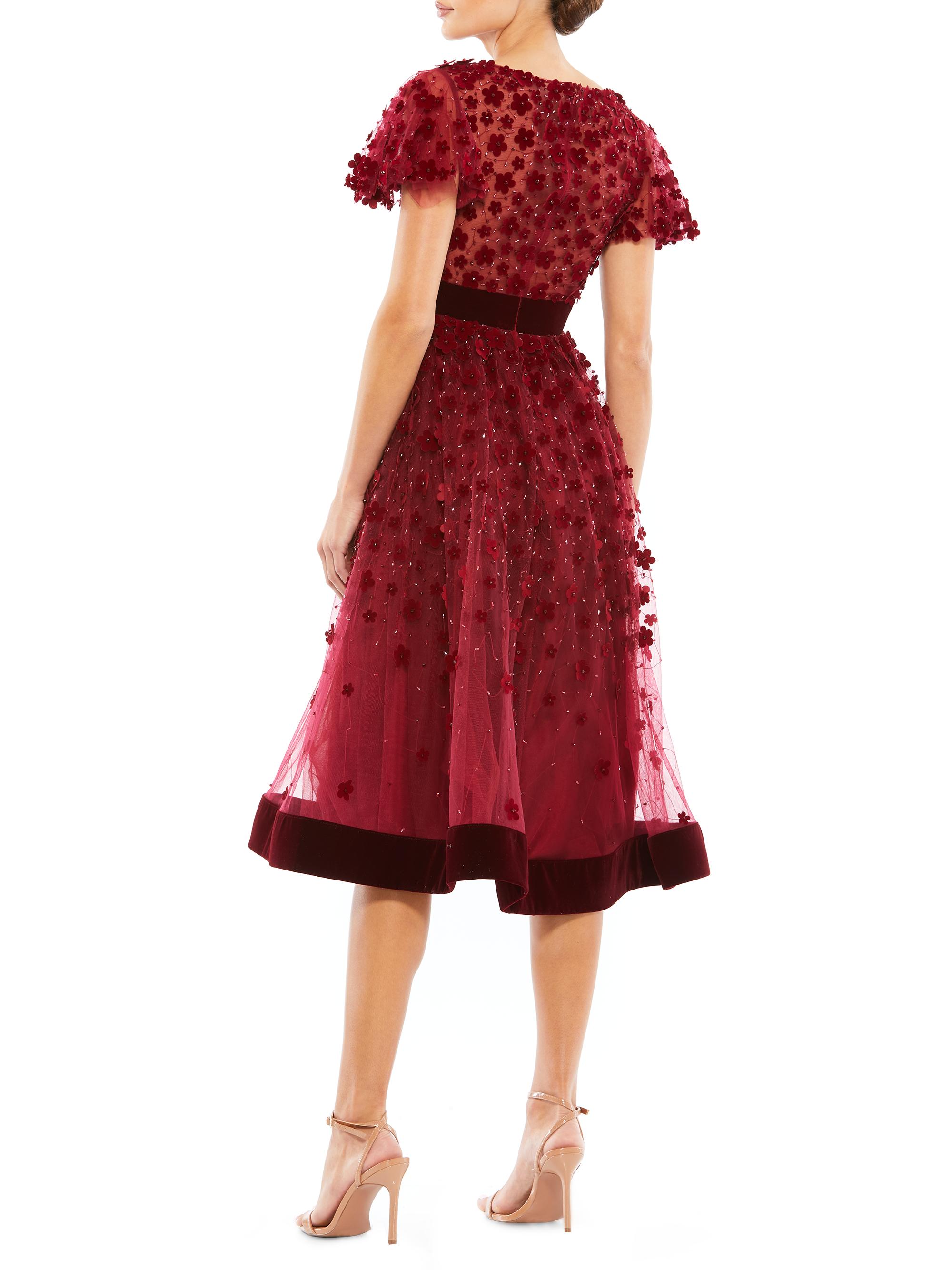 Mac Duggal Velvet Flower-Embellished Midi-Dress BURGUNDY