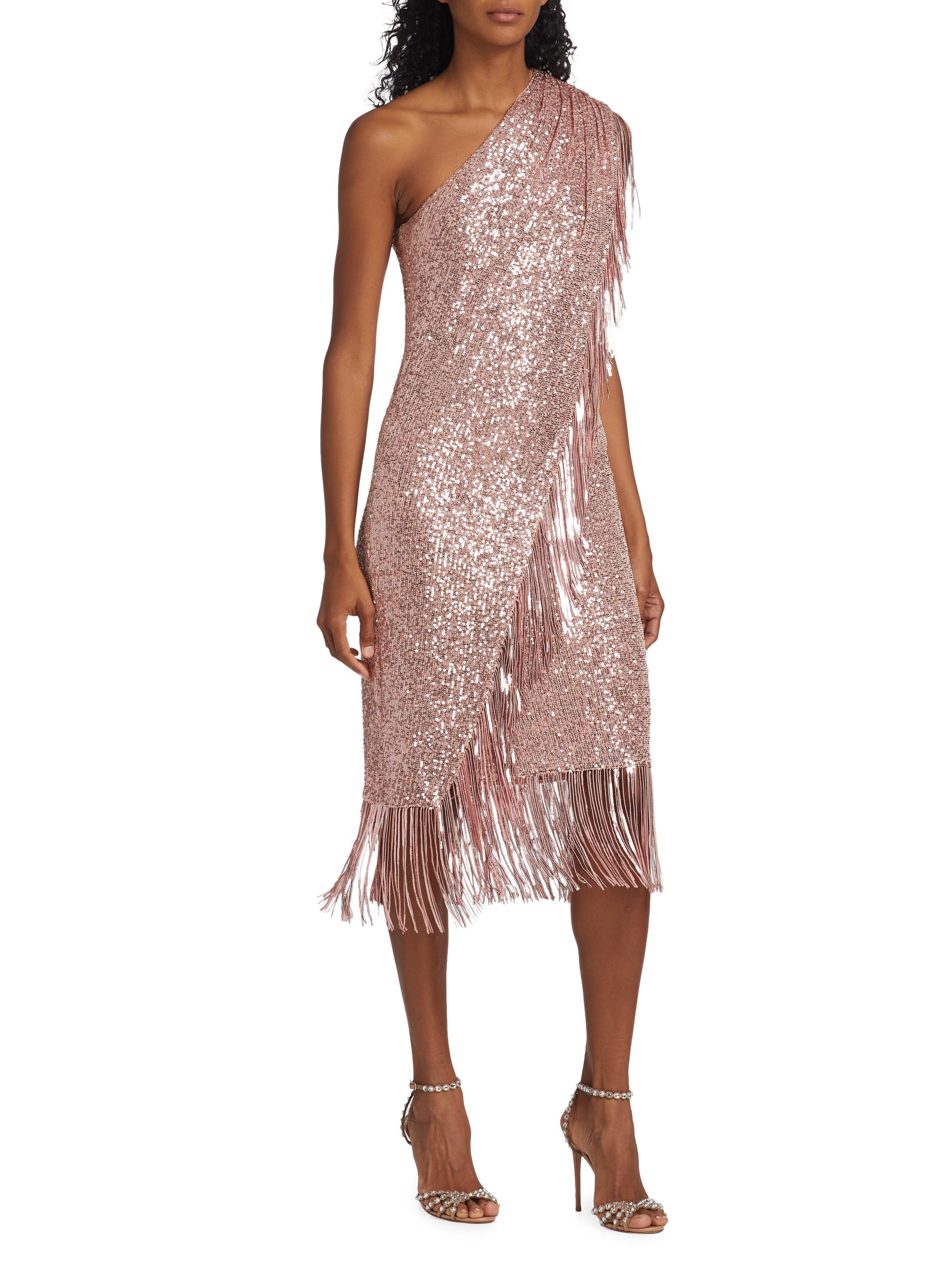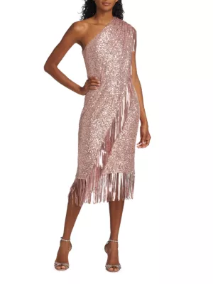 Badgley Mischka Sequin Fringe One-Shoulder Midi Dress
