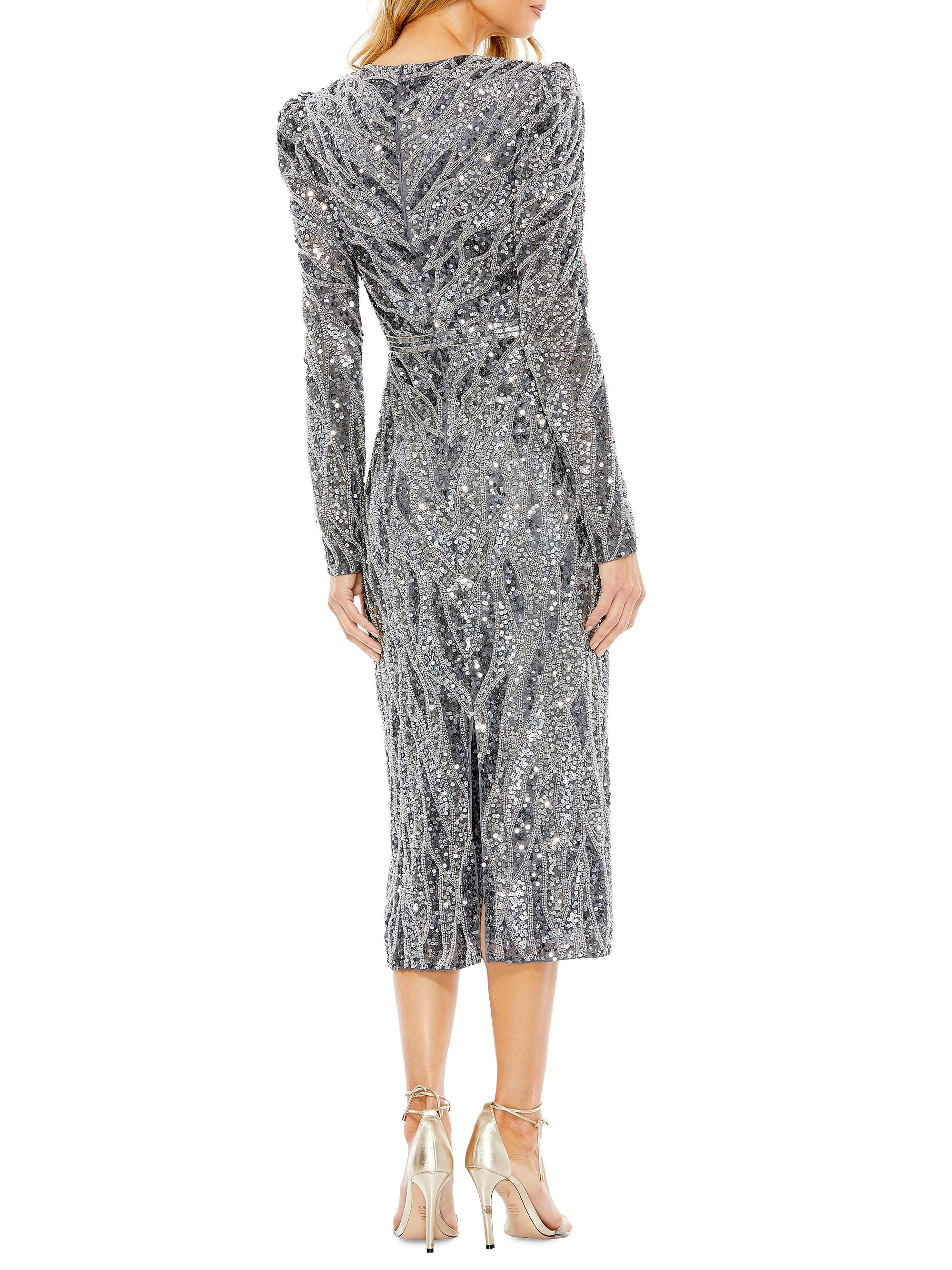 Mac Duggal Embellished Faux Wrap Midi-Dress CHARCOAL