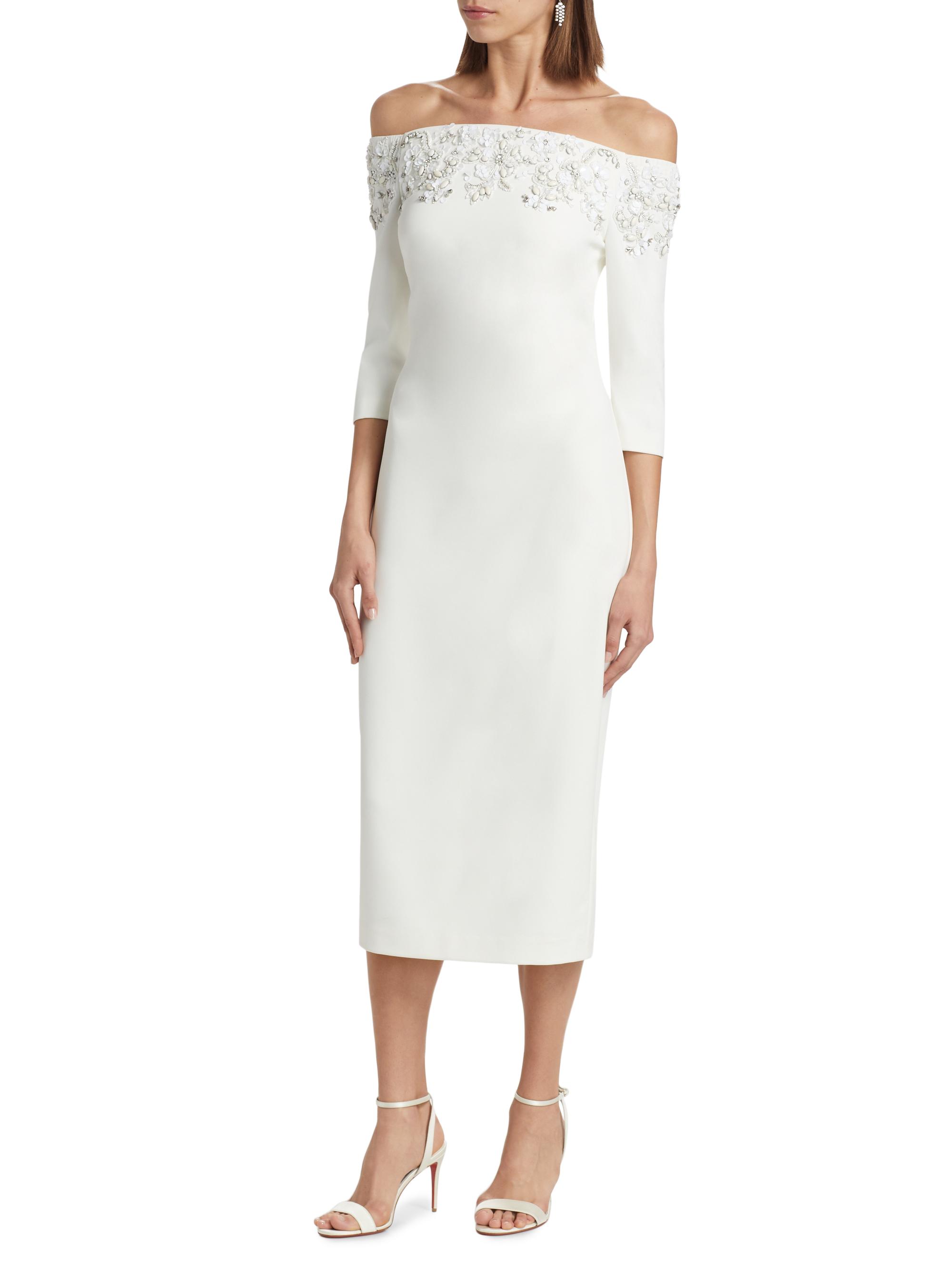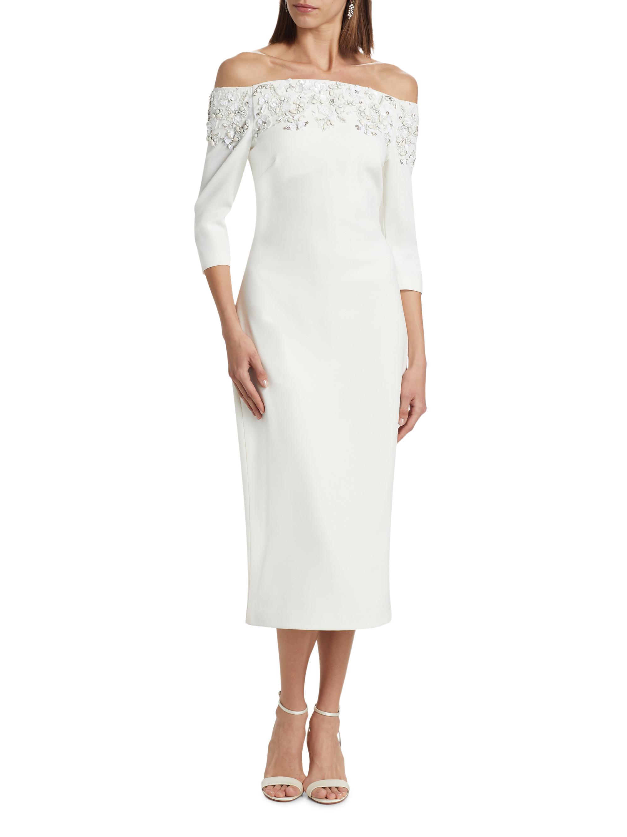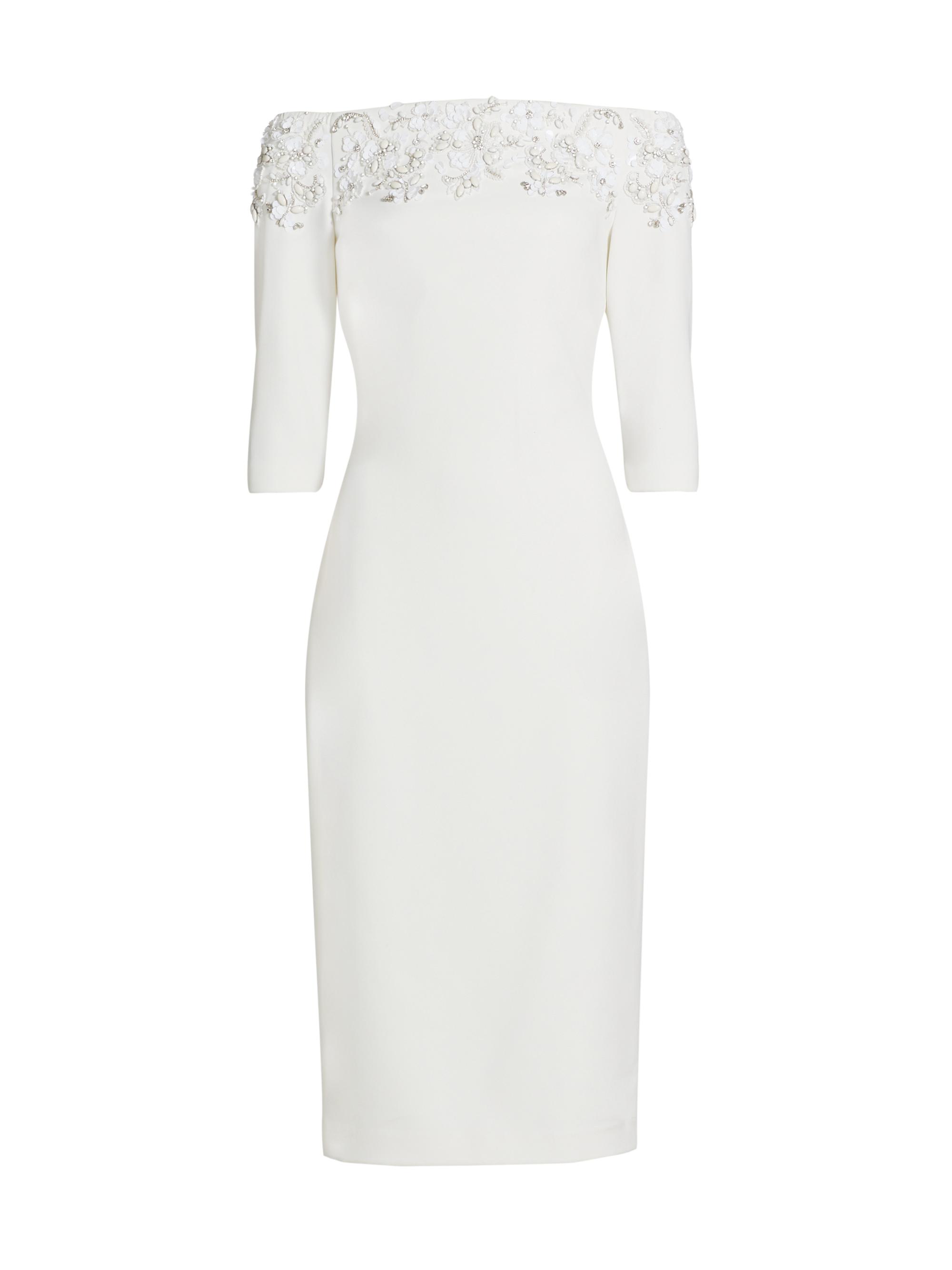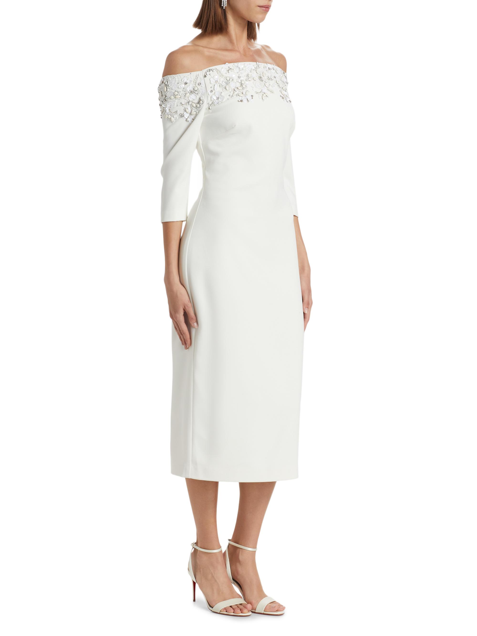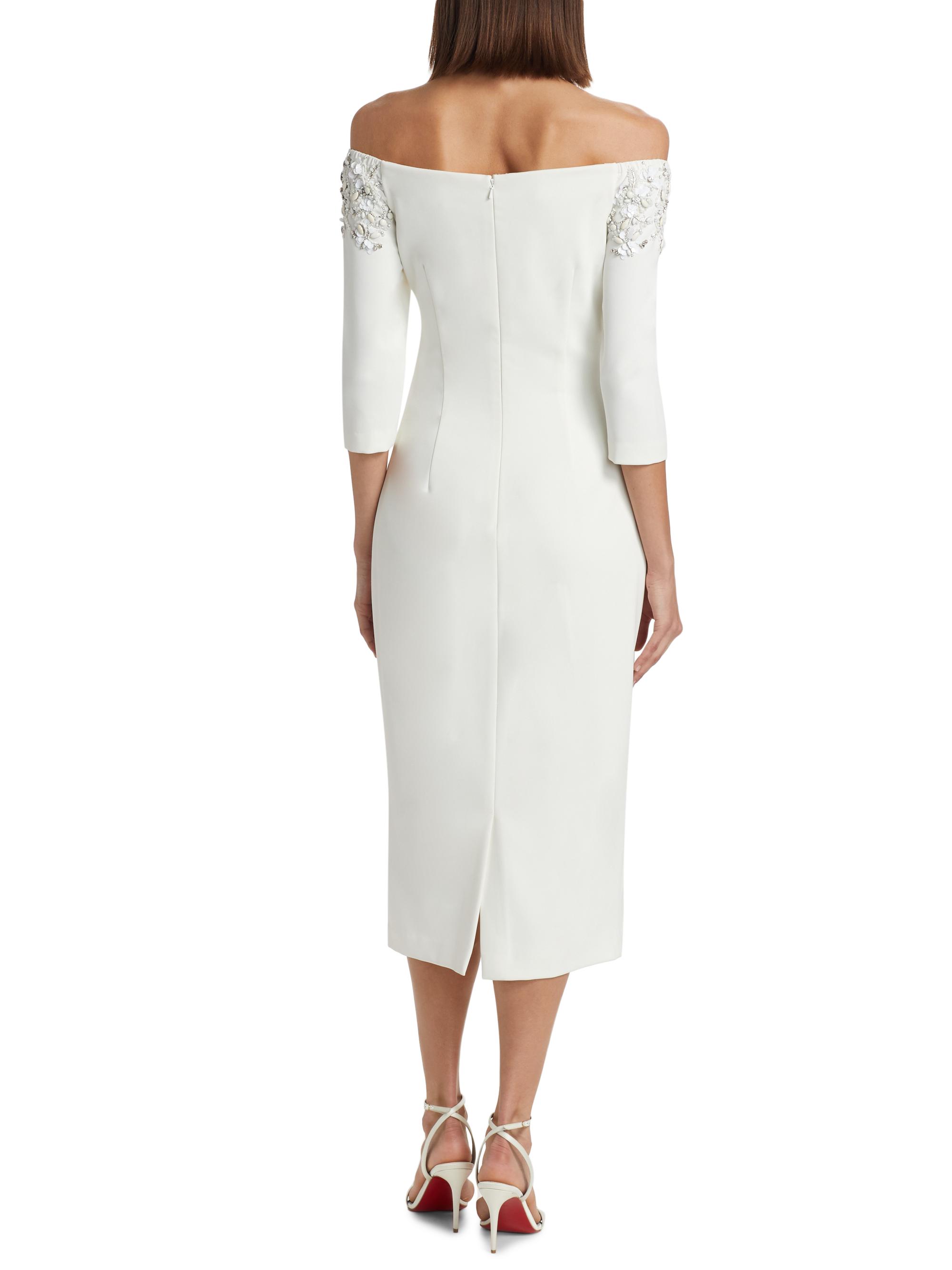 Badgley Mischka Beaded Stretch Crepe Cocktail Midi-Dress LIGHT IVORY