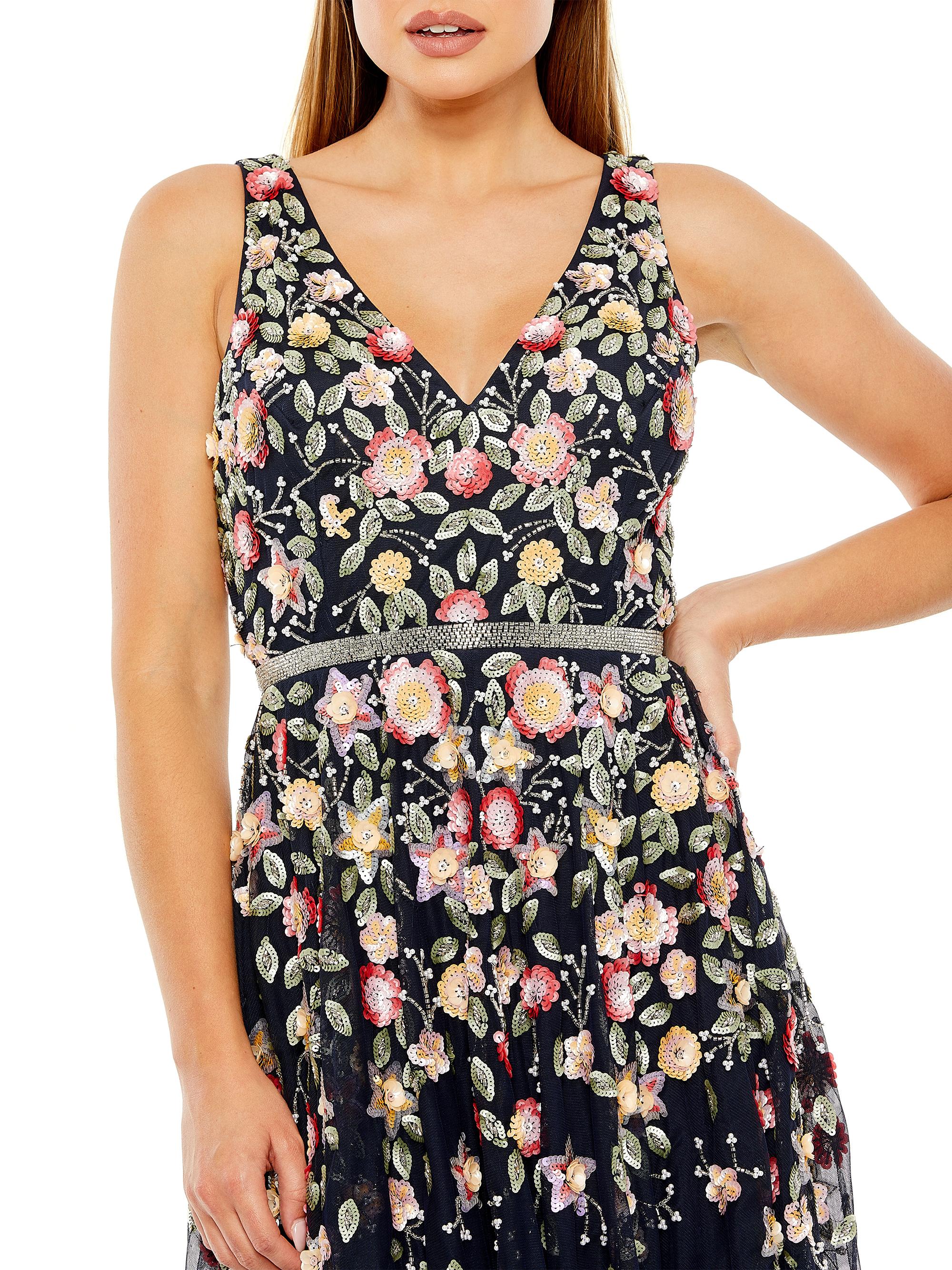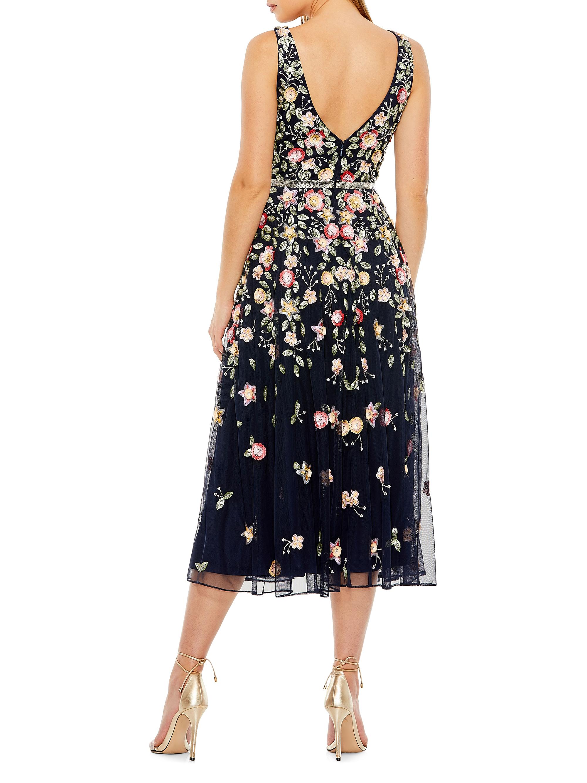 Mac Duggal Cocktail Floral Embroidered V-Neck Midi-Dress MIDNIGHT MULTI