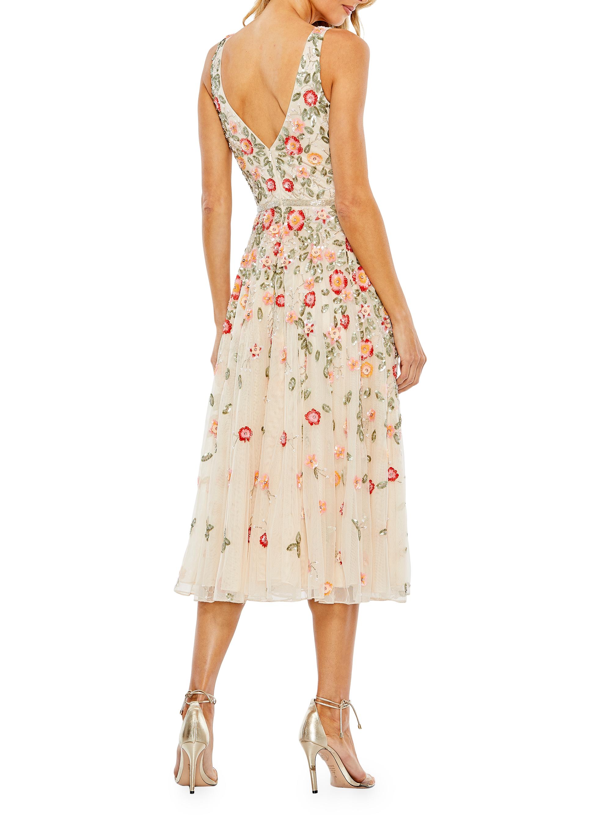 Mac Duggal Cocktail Floral Embroidered V-Neck Midi-Dress WHITE MULTI