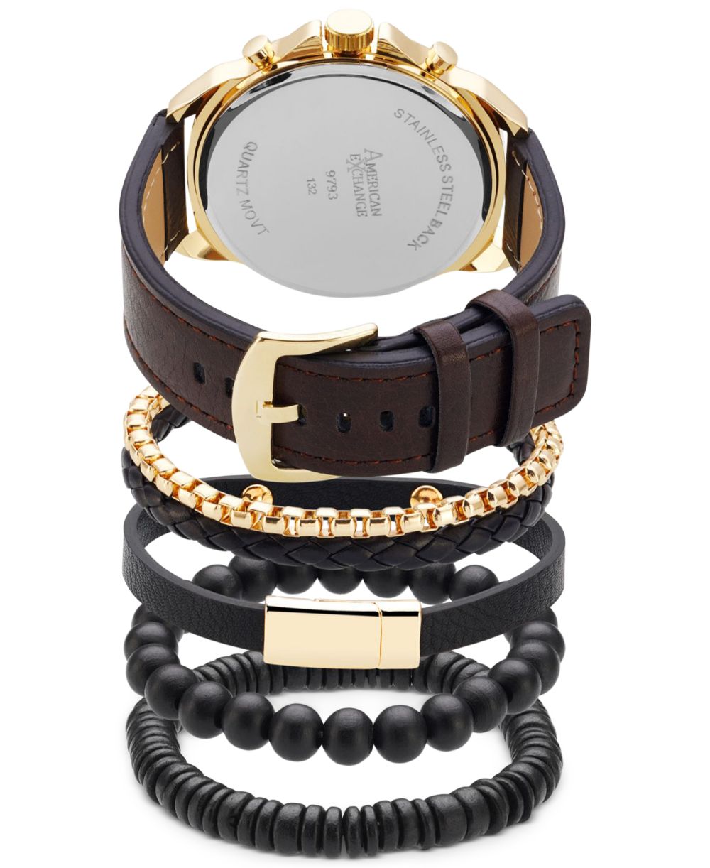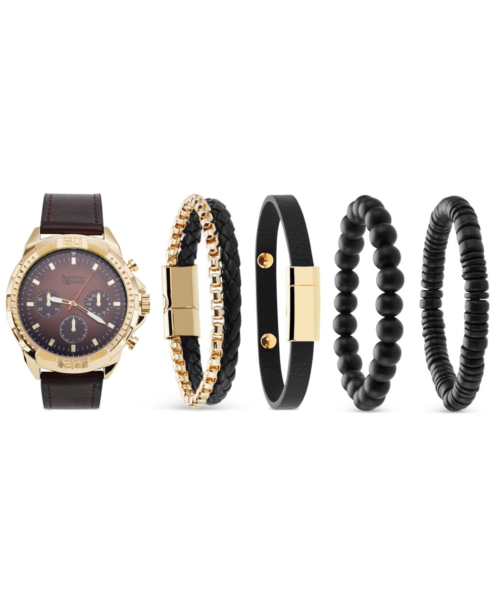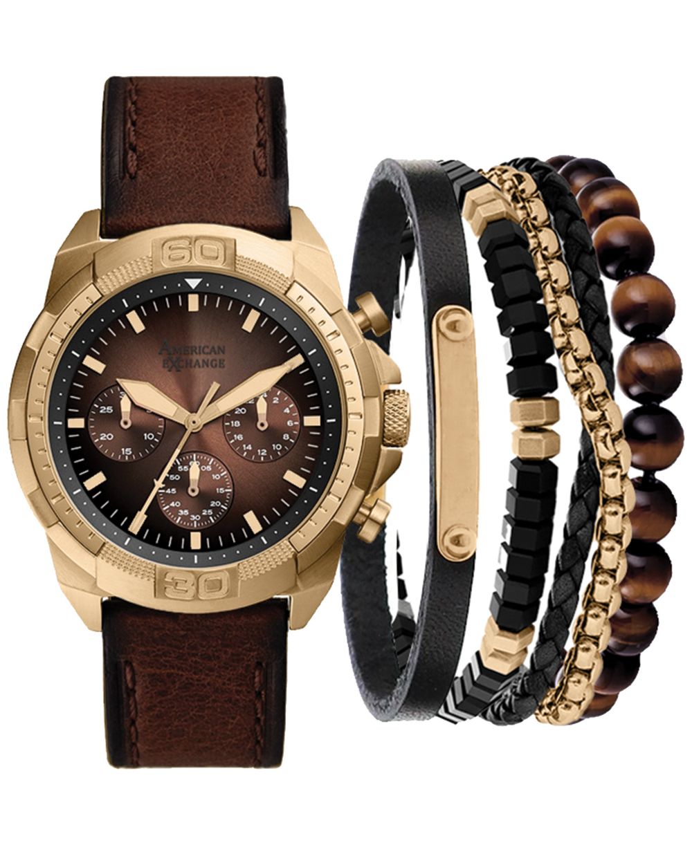 American Exchange Mens Brown Faux Leather Strap Watch 51mm Gift Set