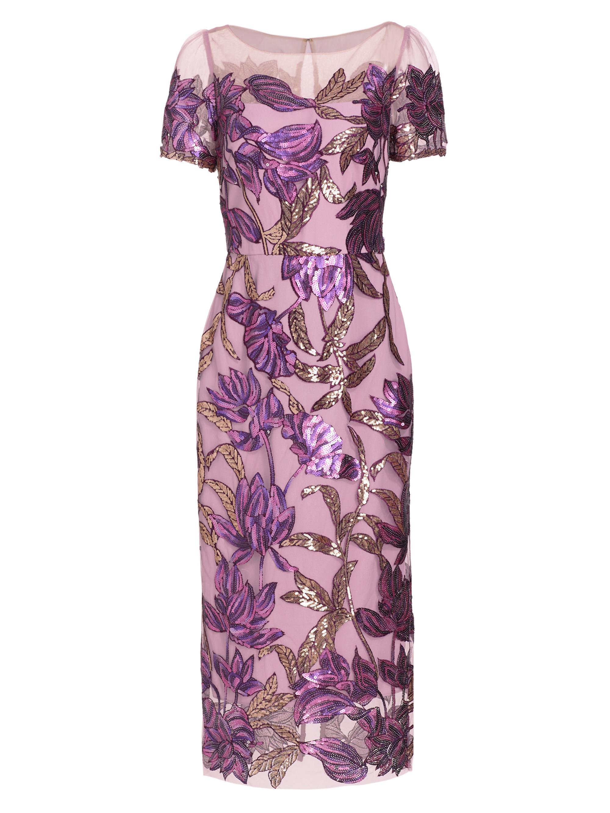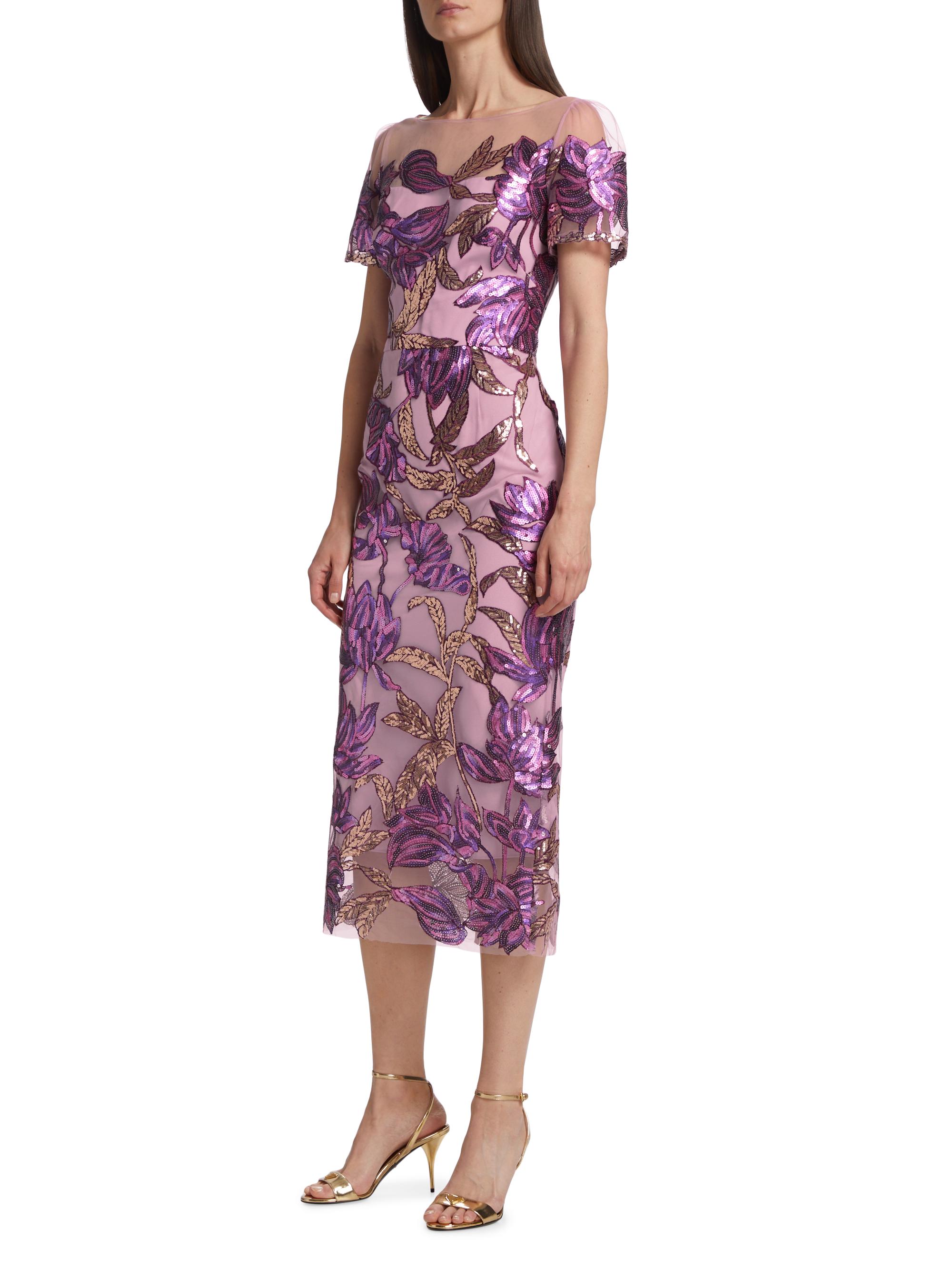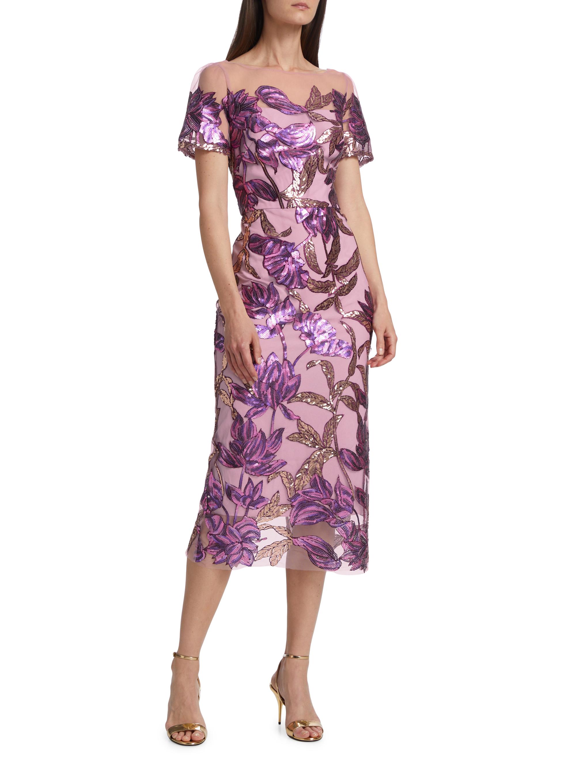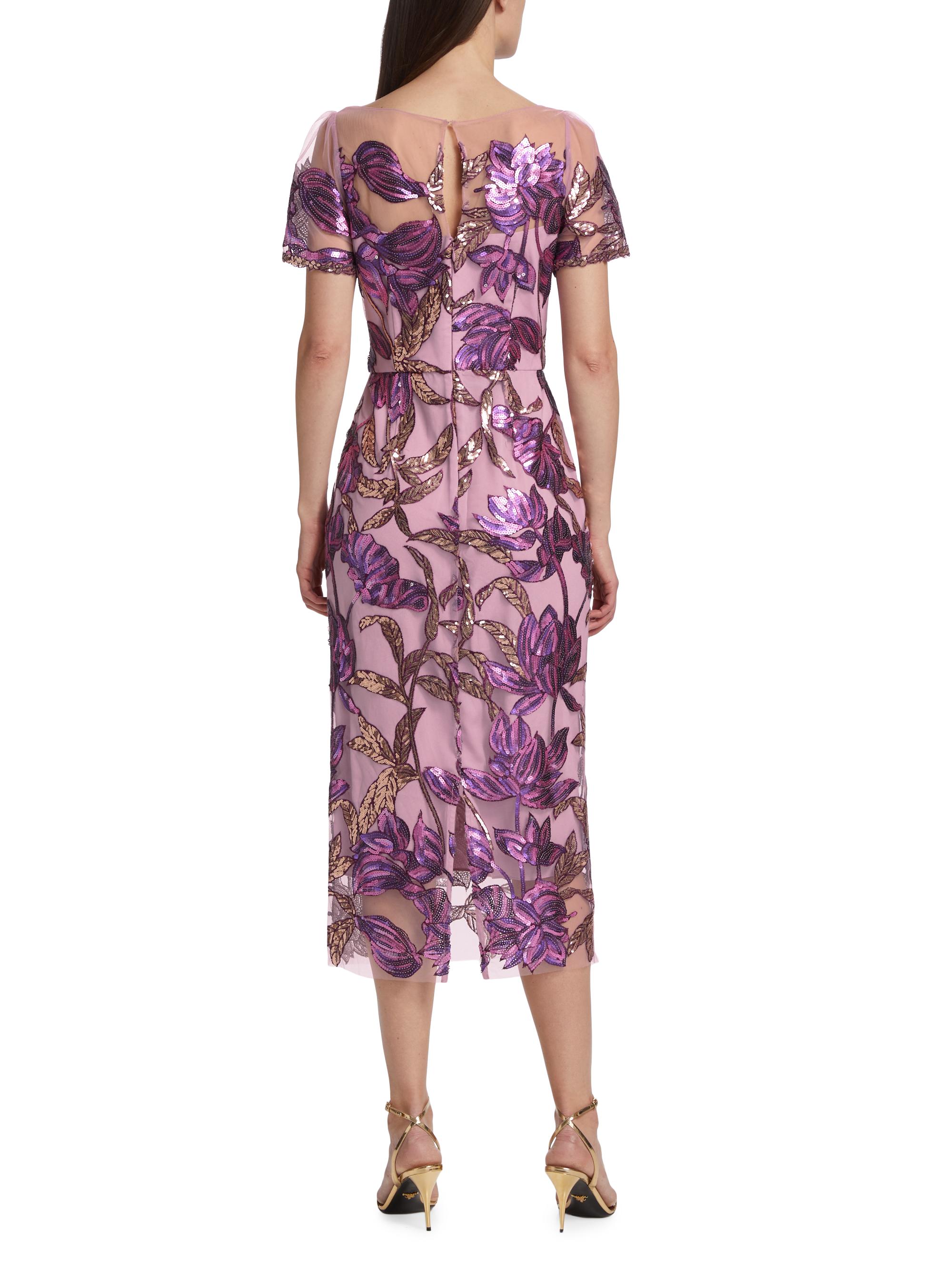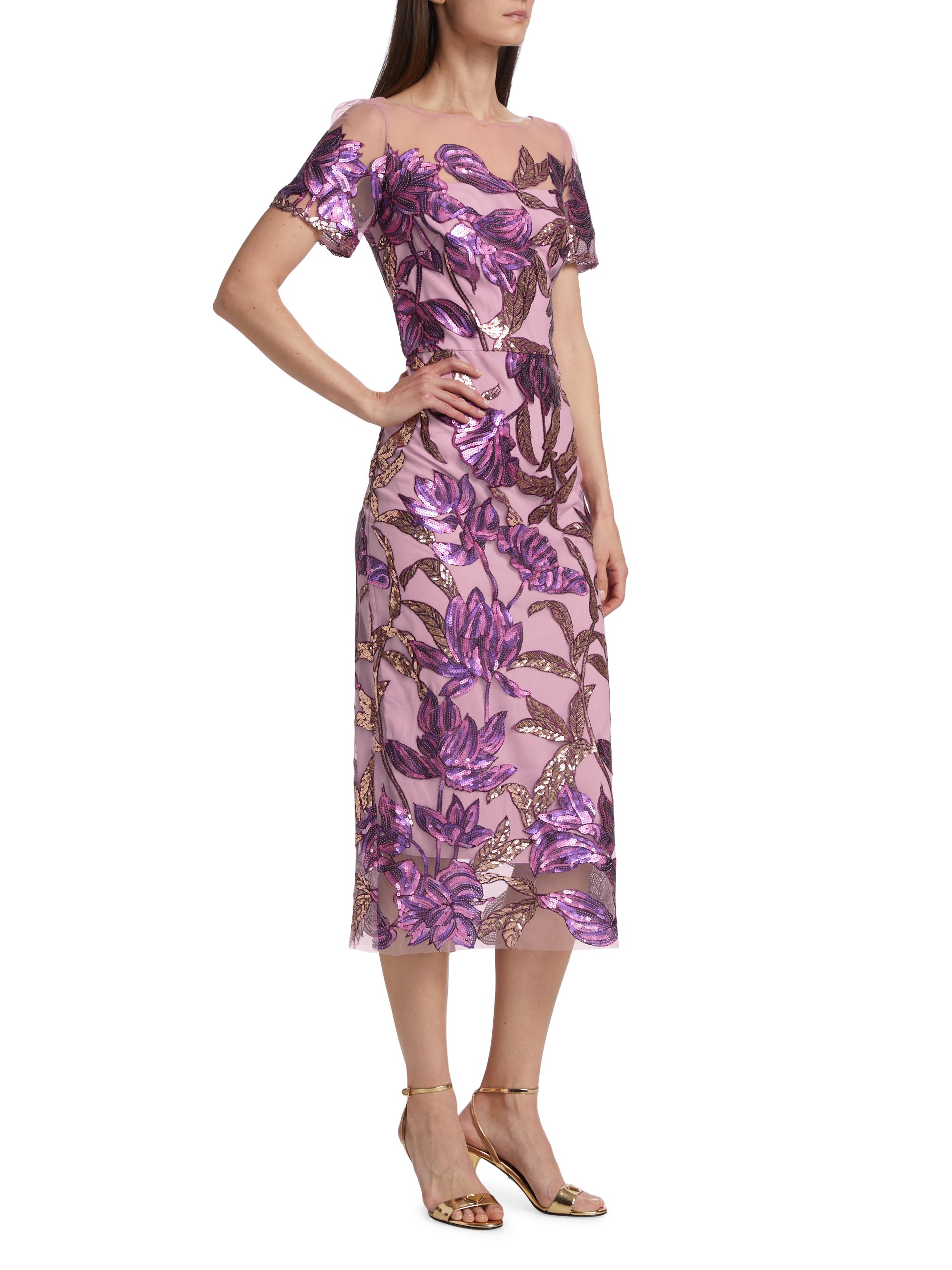 Marchesa Notte Floral Sequin Sheath Midi-Dress