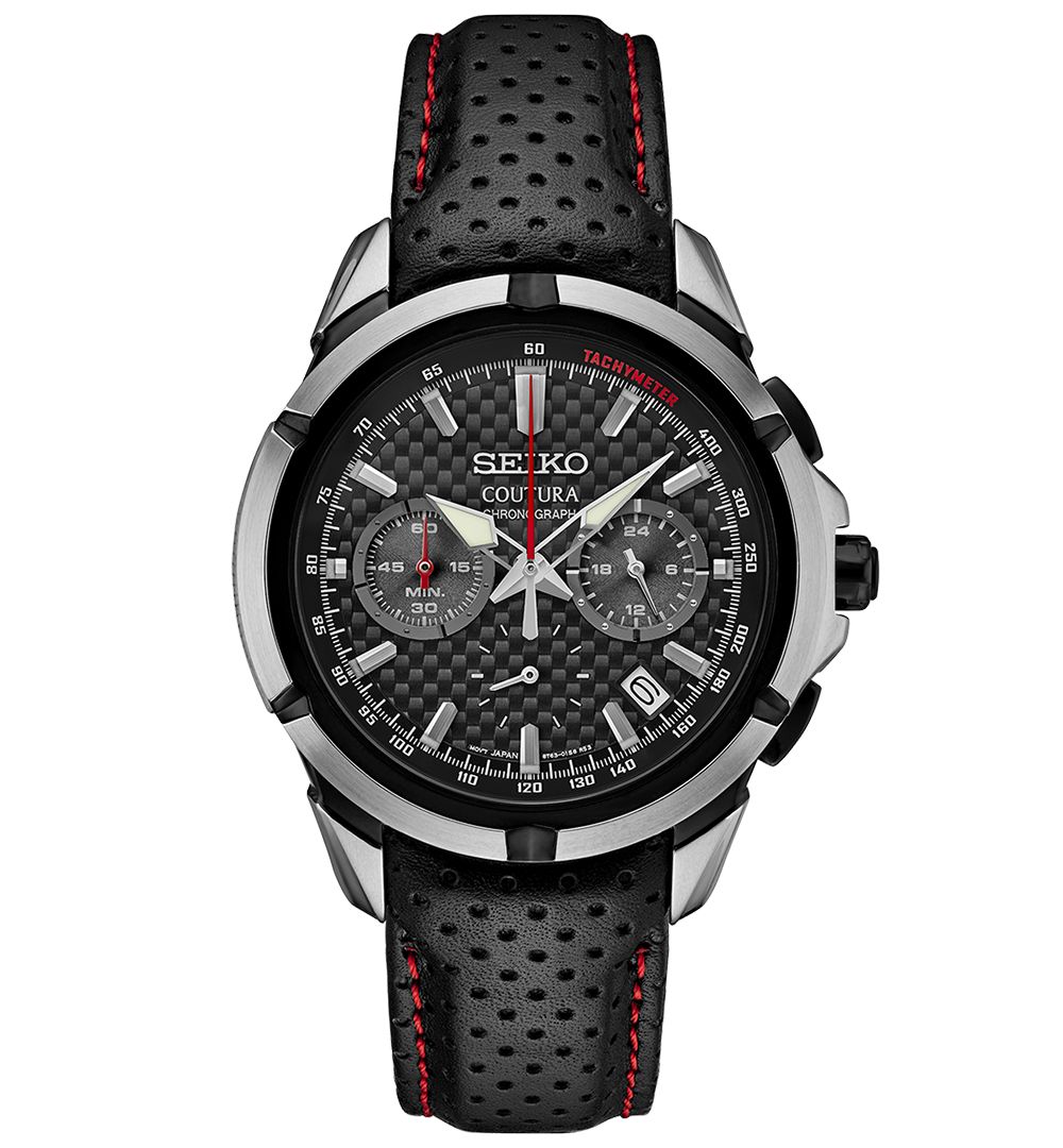 Seiko Mens Chronograph Coutura Black Perforated Leather Strap Watch 42mm