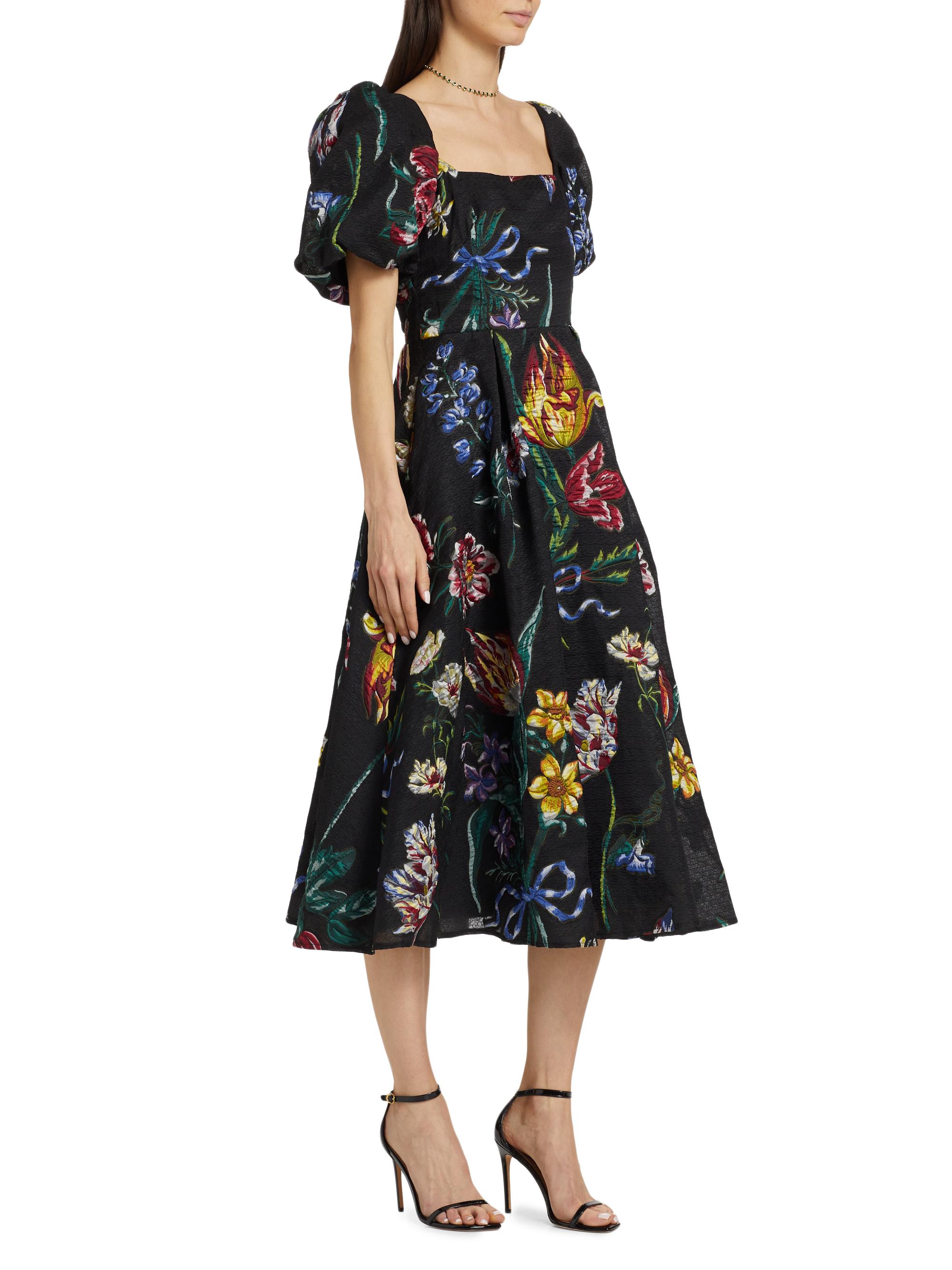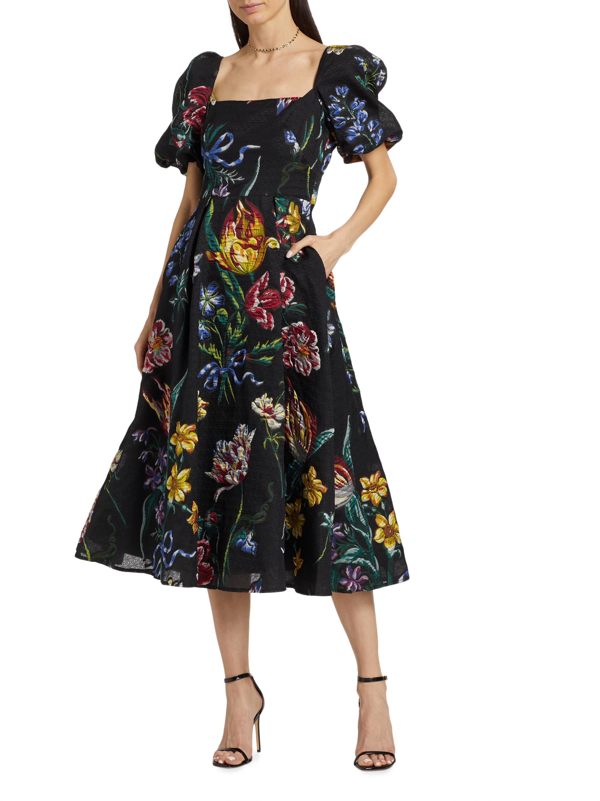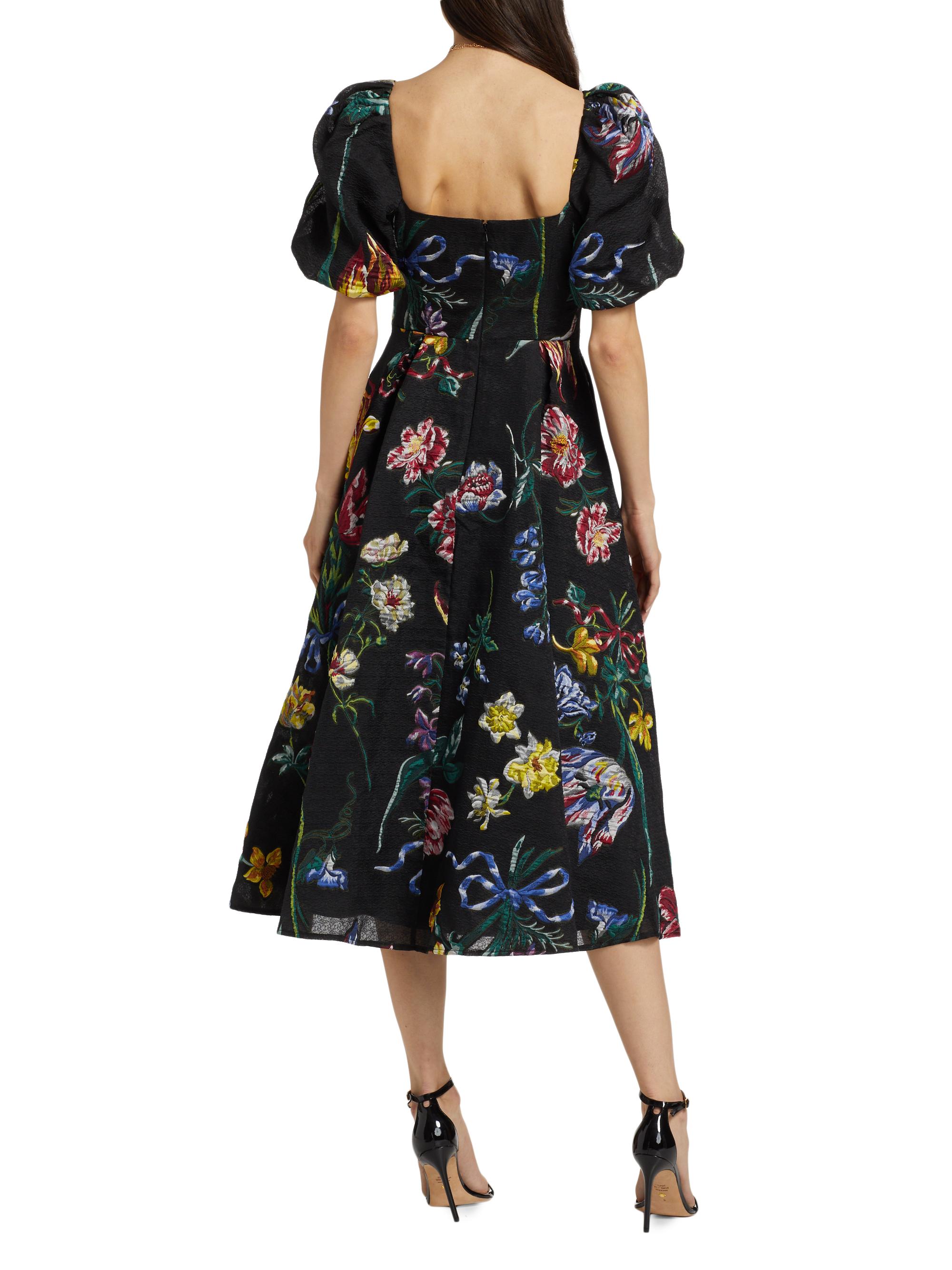 Marchesa Notte Floral Jacquard Puff-Sleeve A-Line Dress