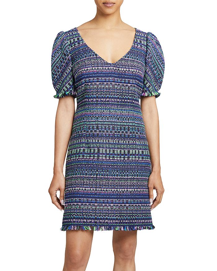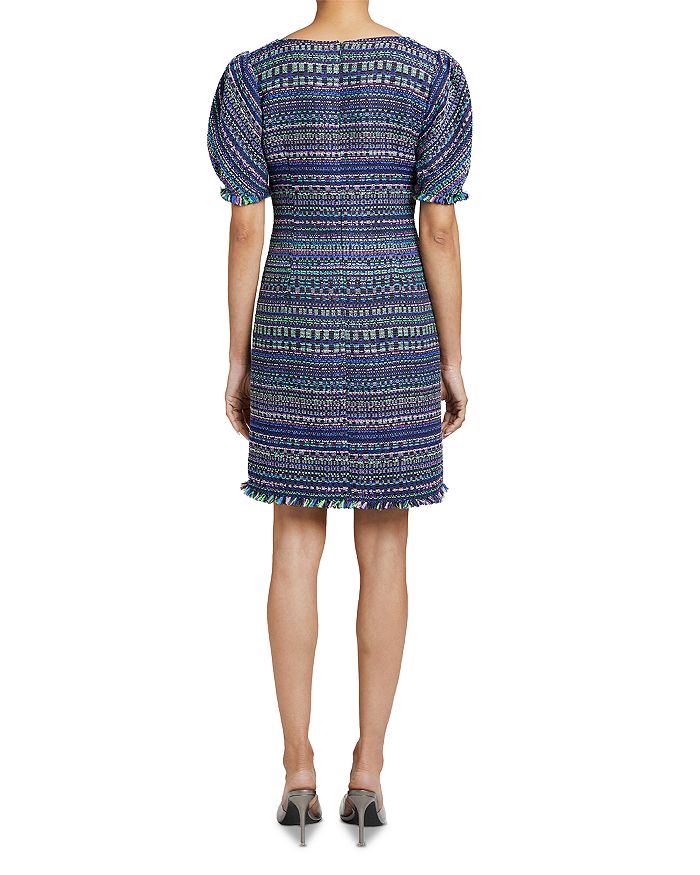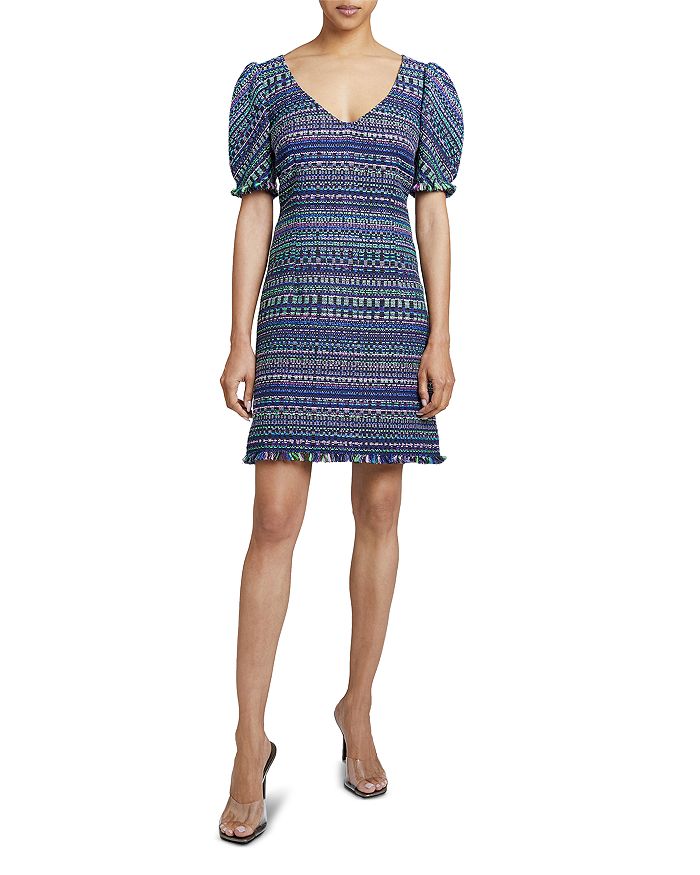 Santorelli Puff Sleeve Fringe Trim Shift Dress