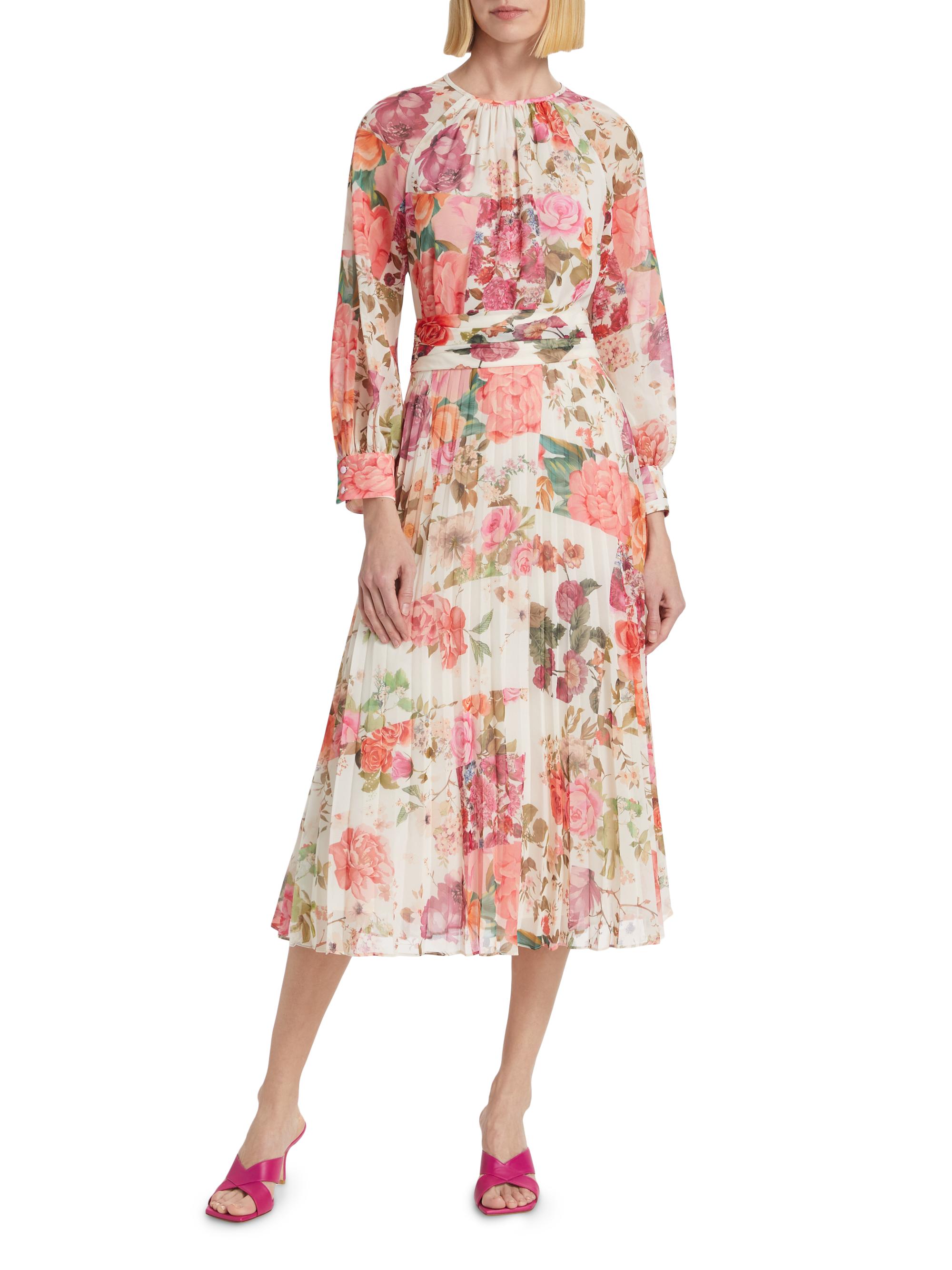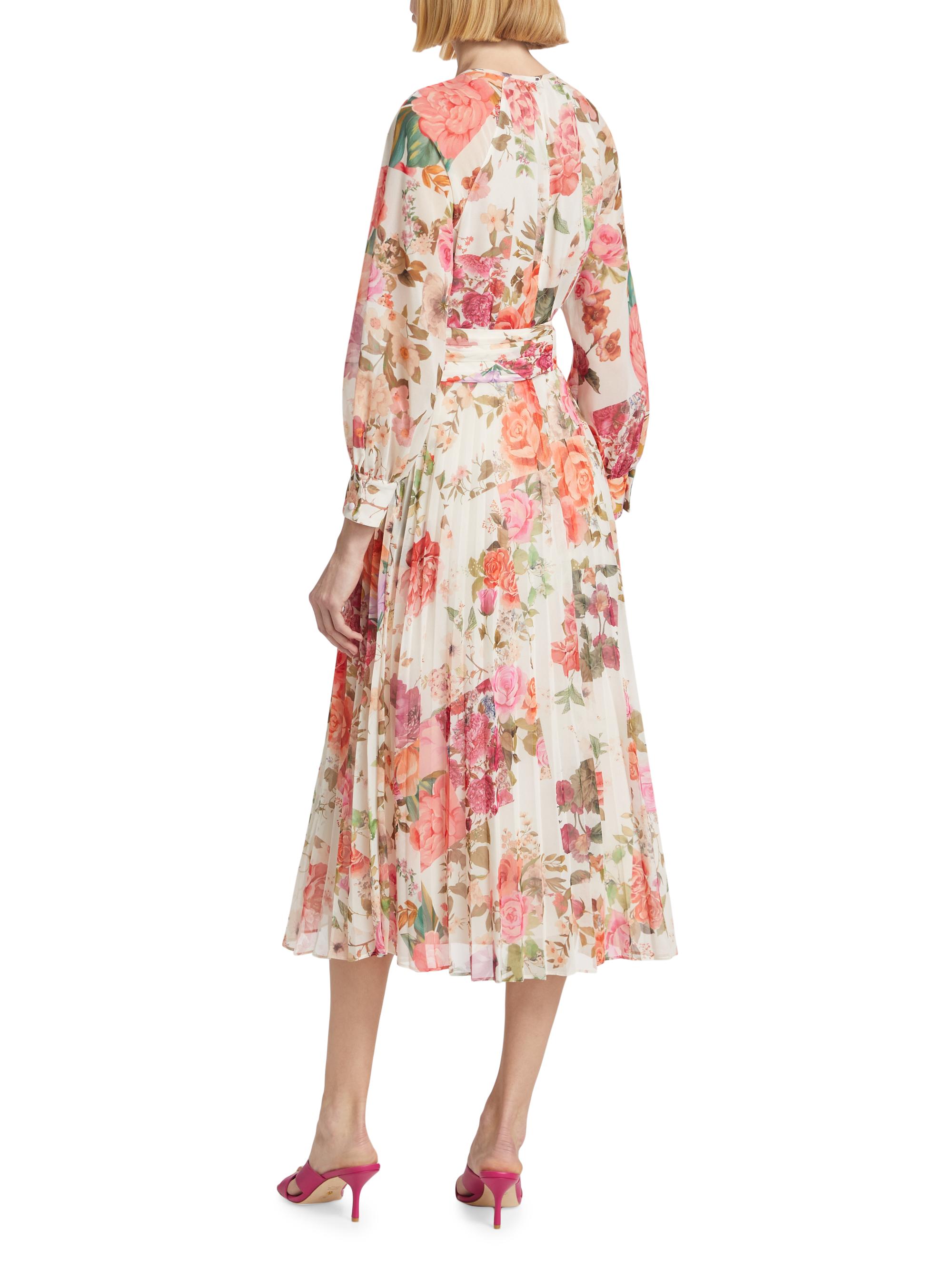 Teri Jon by Rickie Freeman Floral Pleated Chiffon Midi-Dress