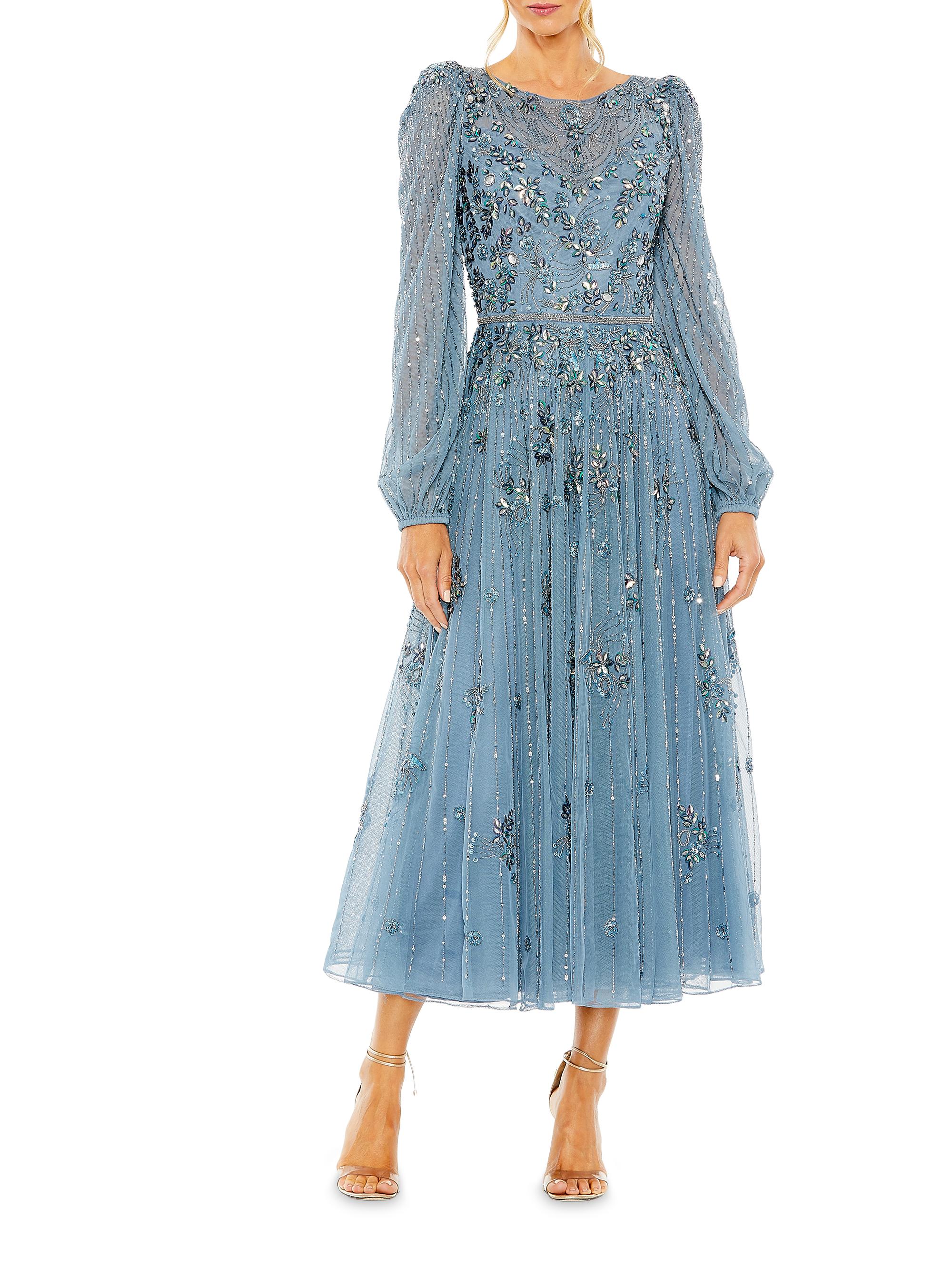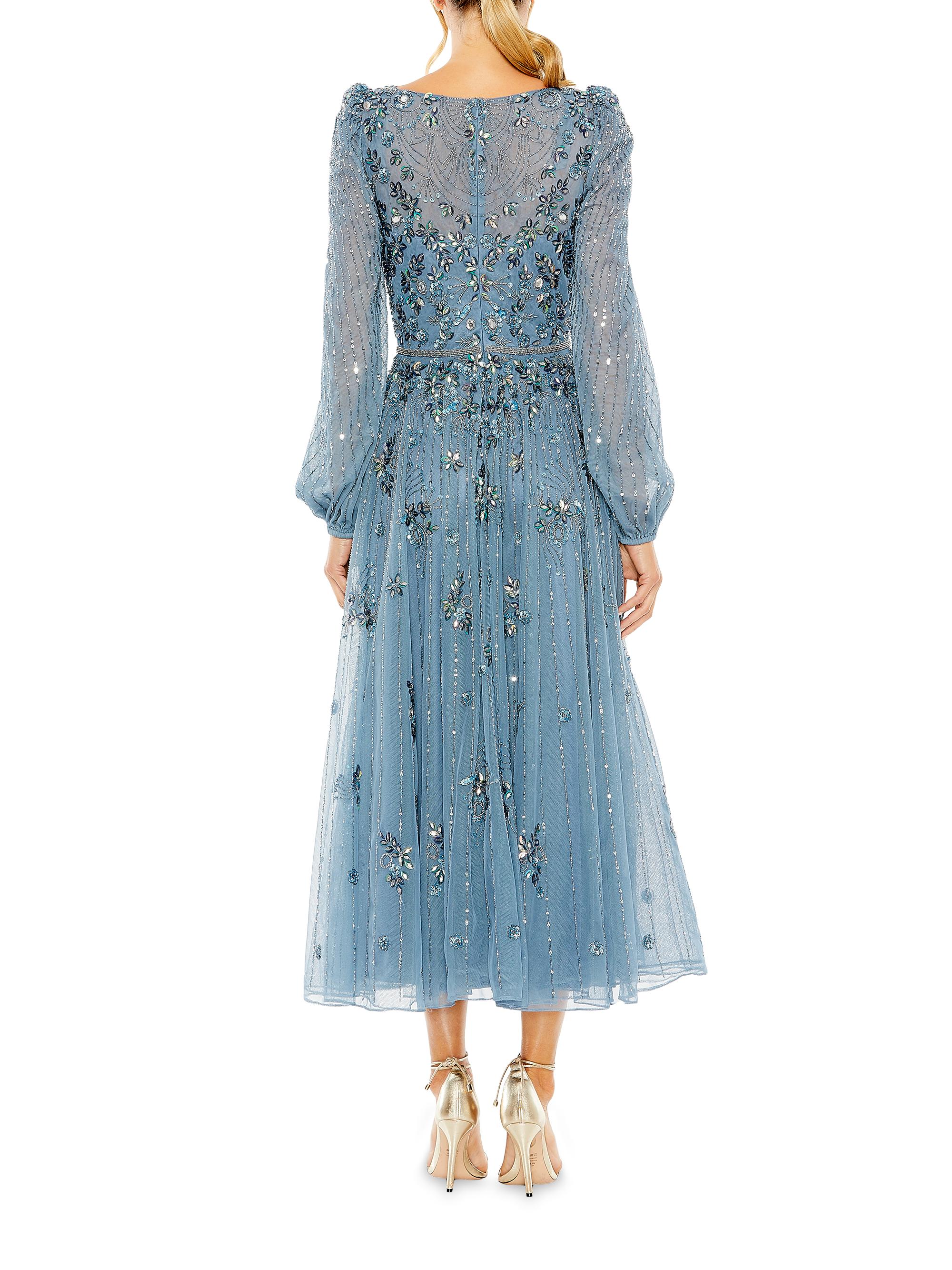Mac Duggal Embellished Long-Sleeve Midi-Dress SLATE BLUE