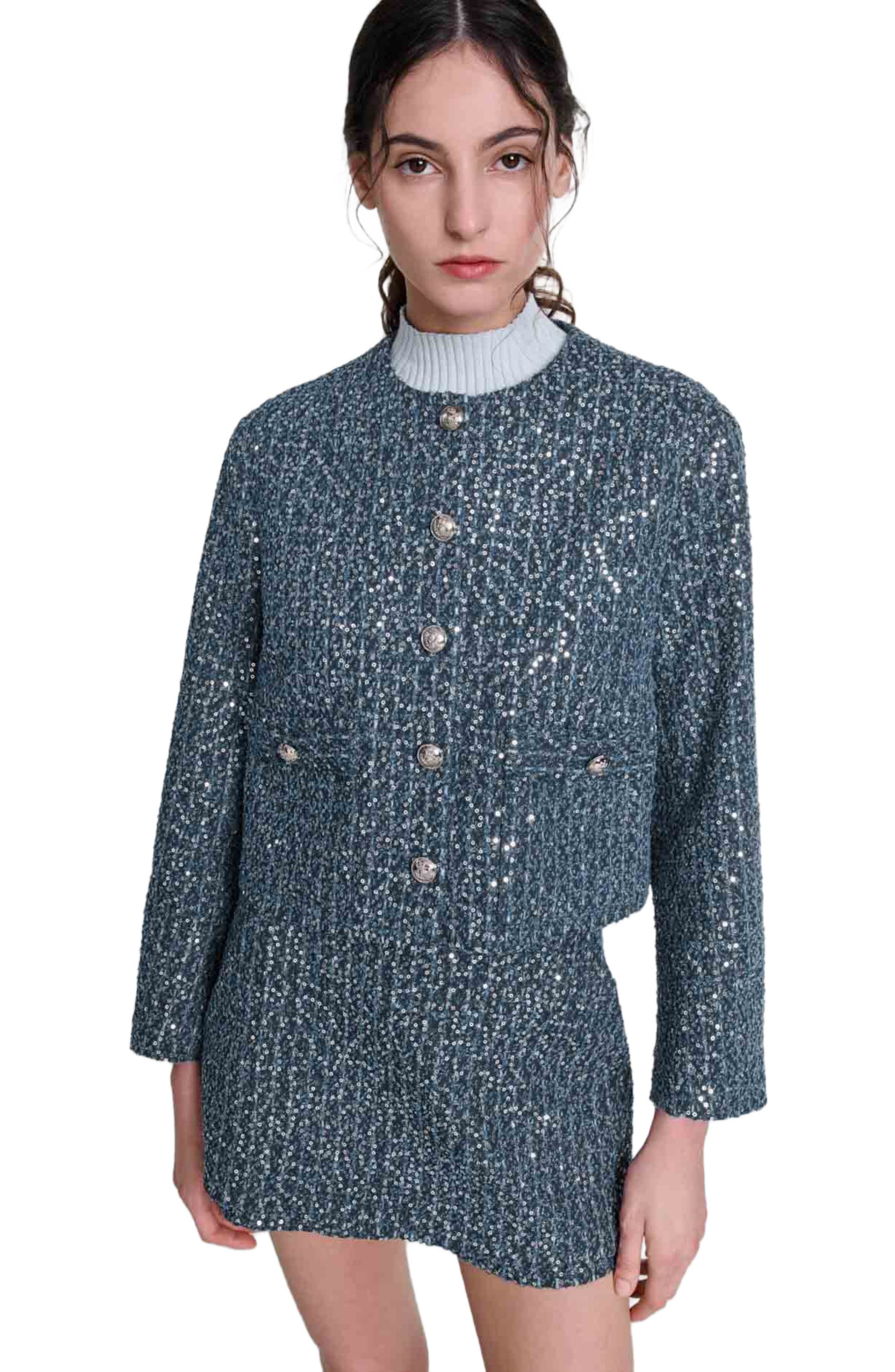 maje Sequinned tweed jacket_Blue Silver