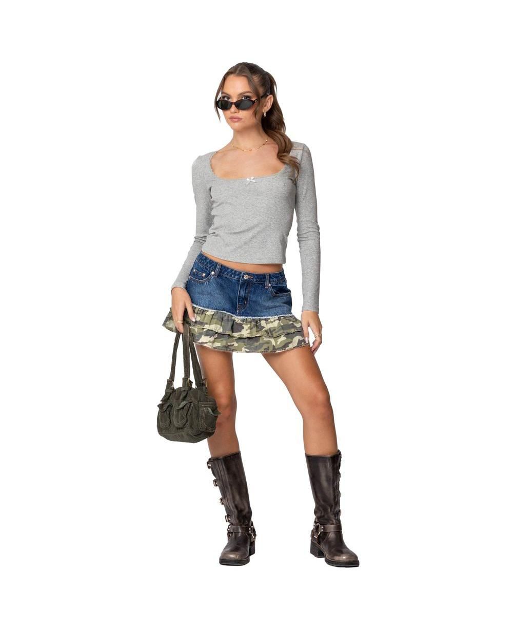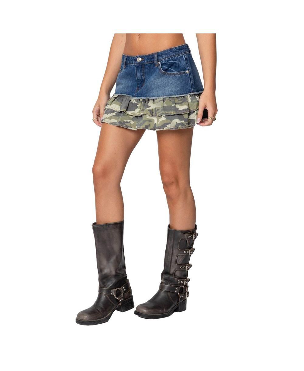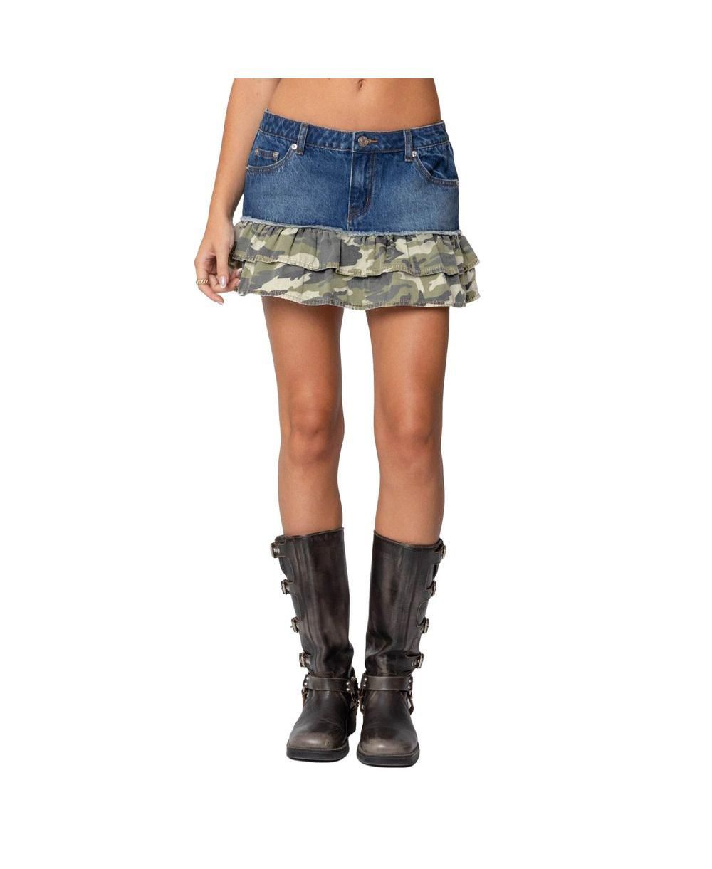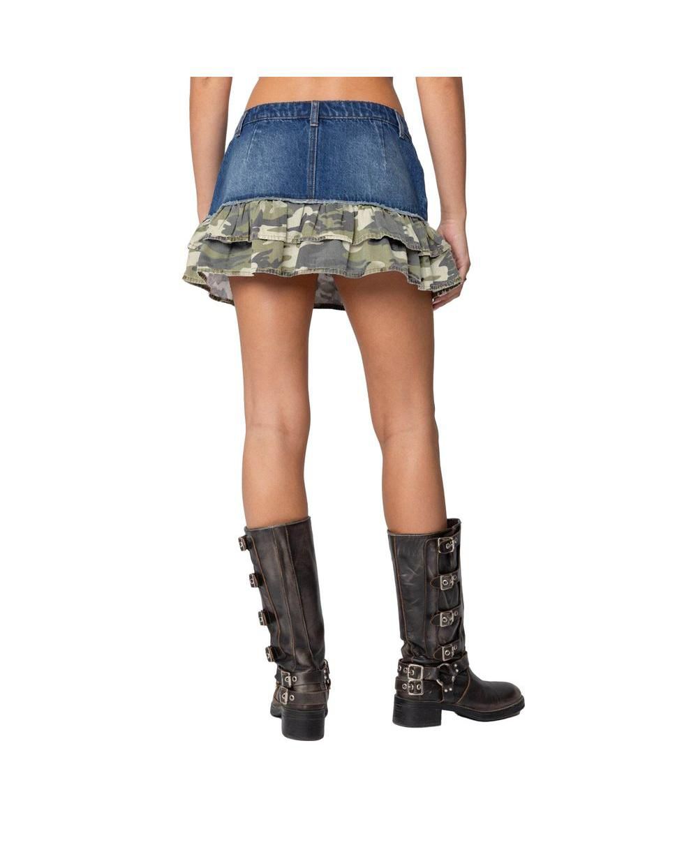 Edikted Womens Camo Ruffle Denim Mini Skirt