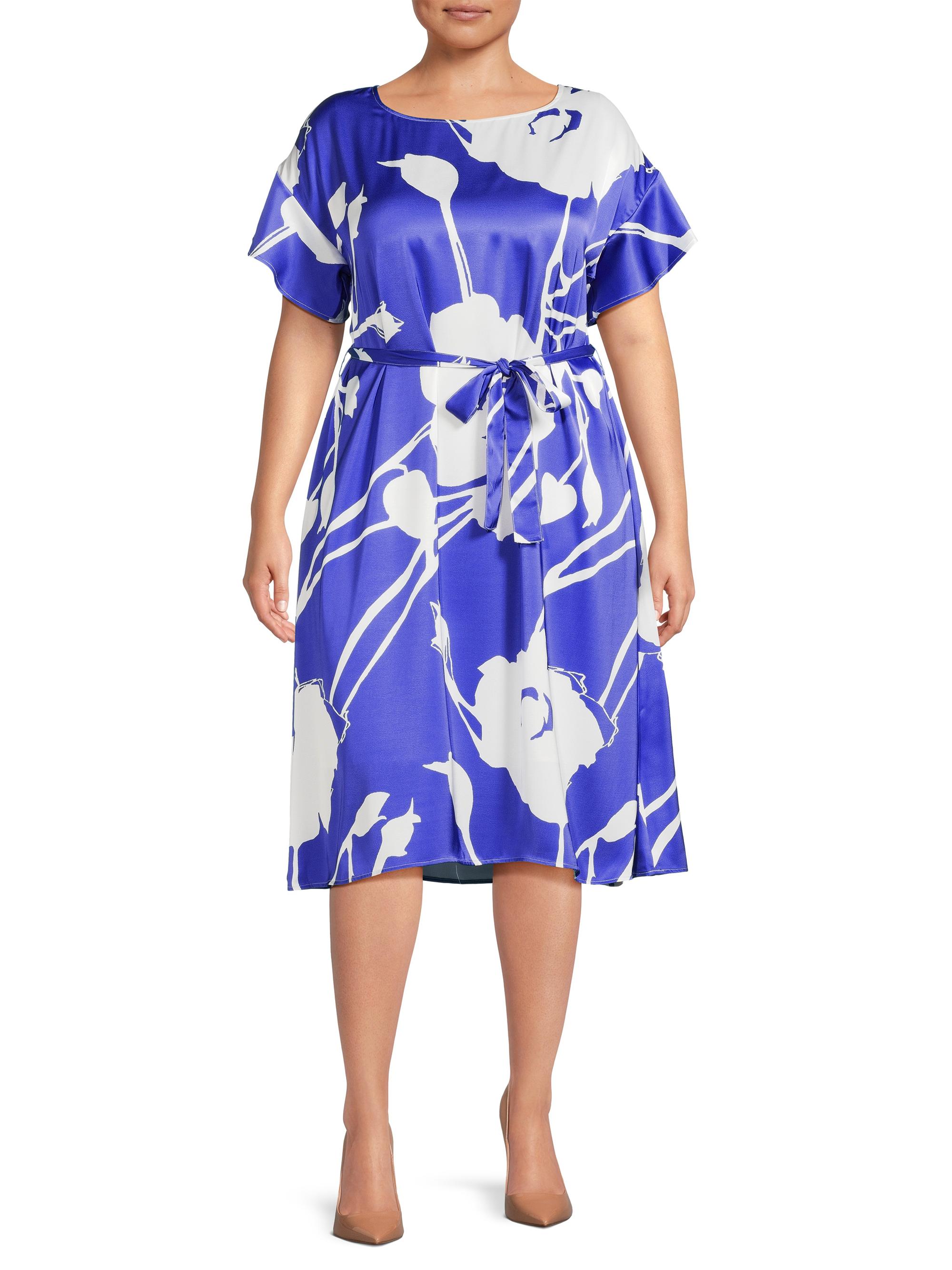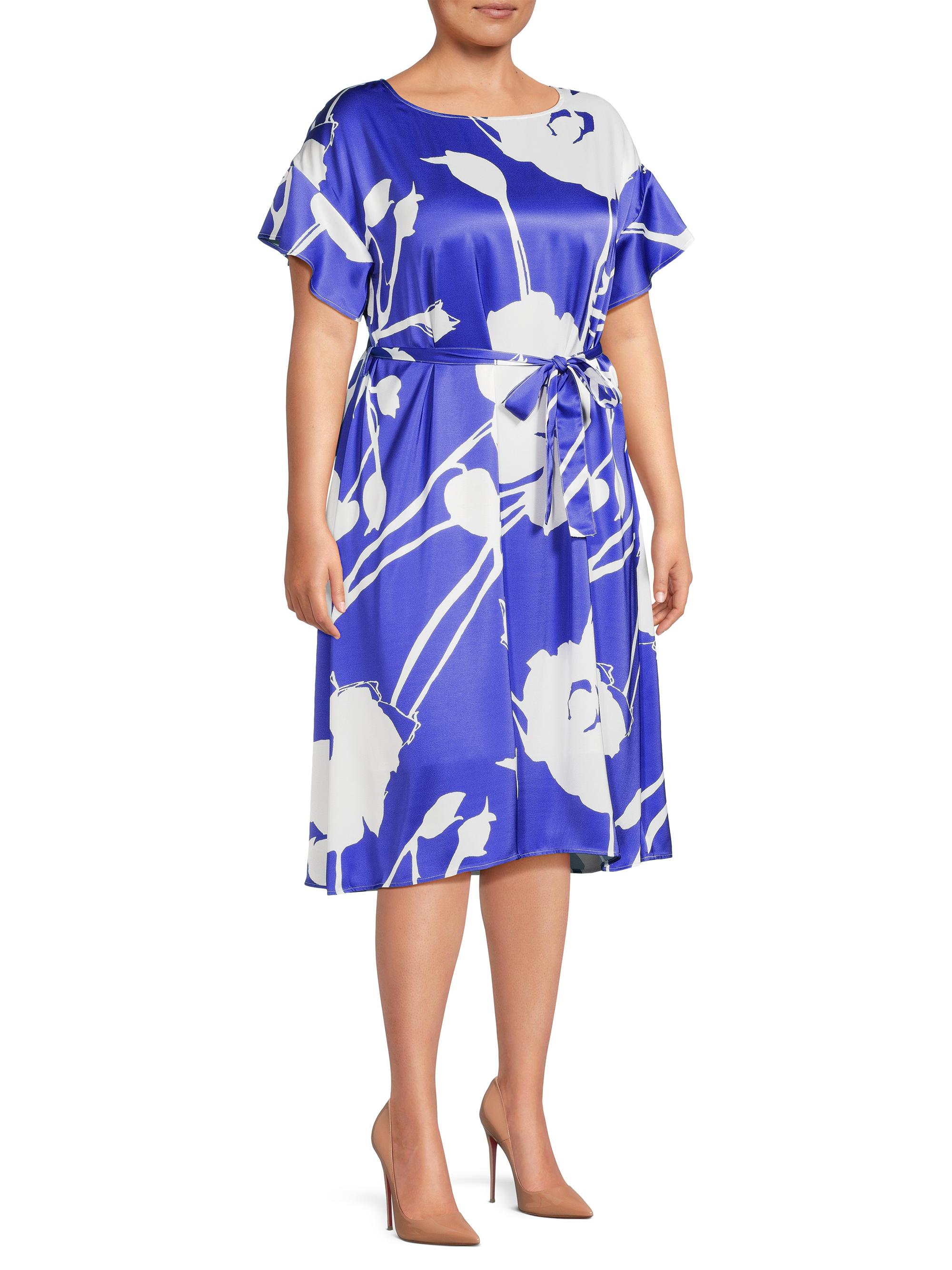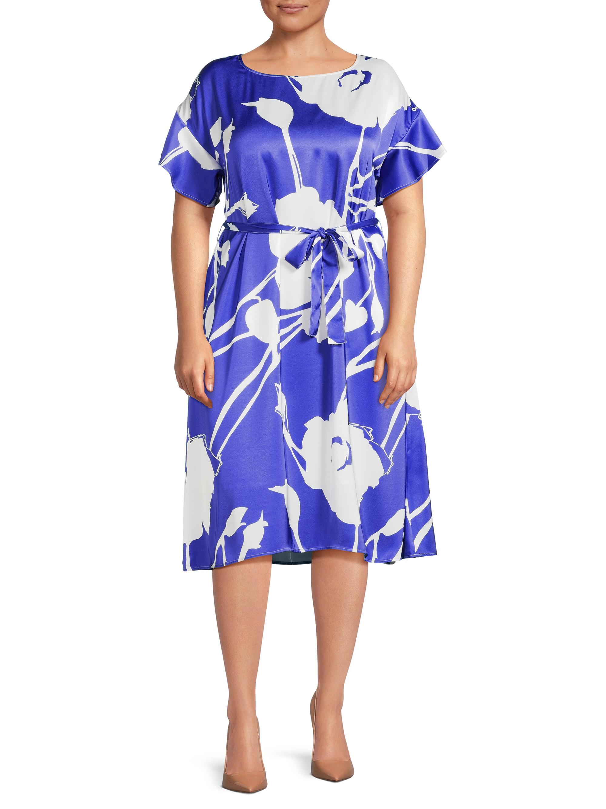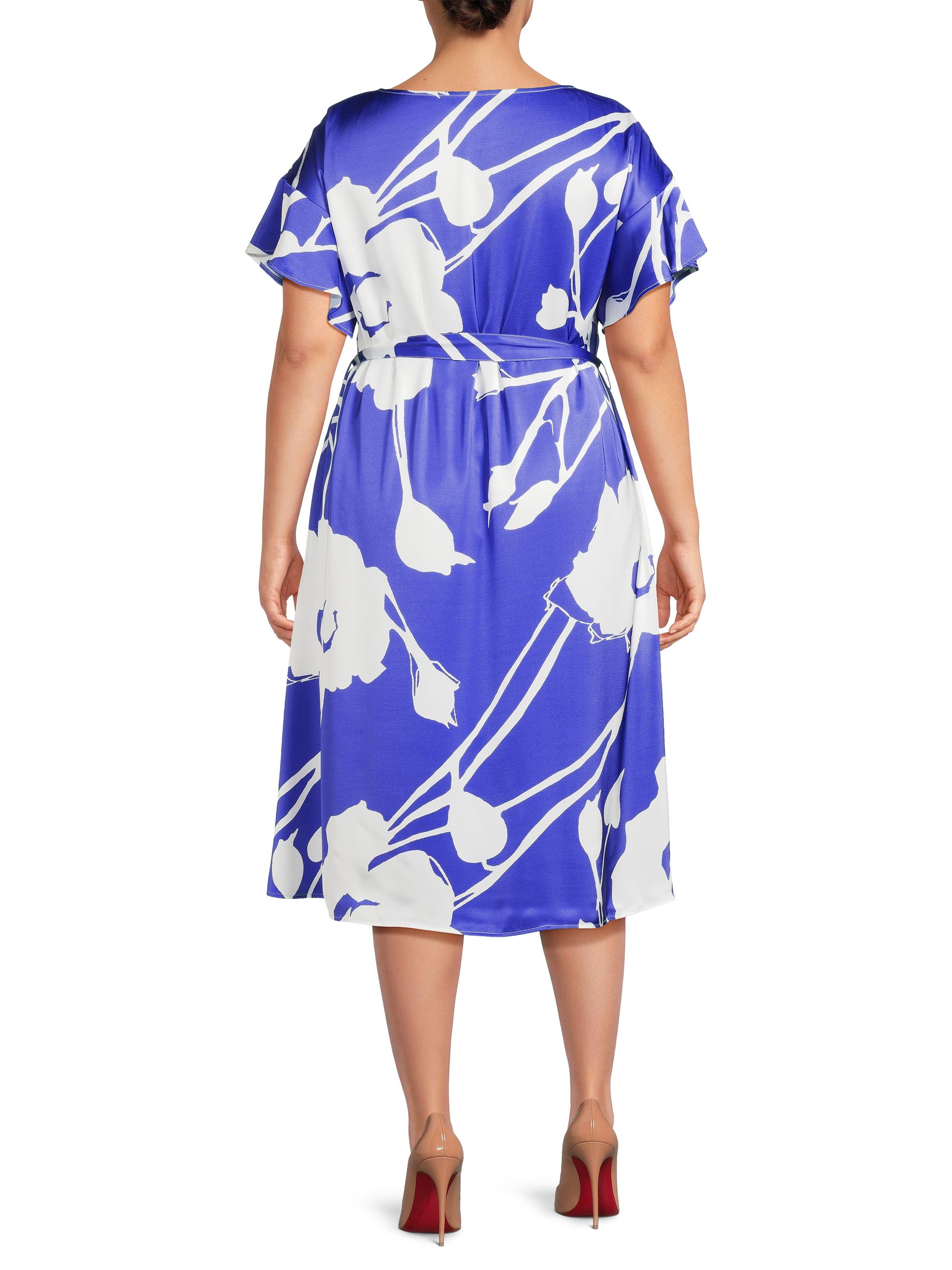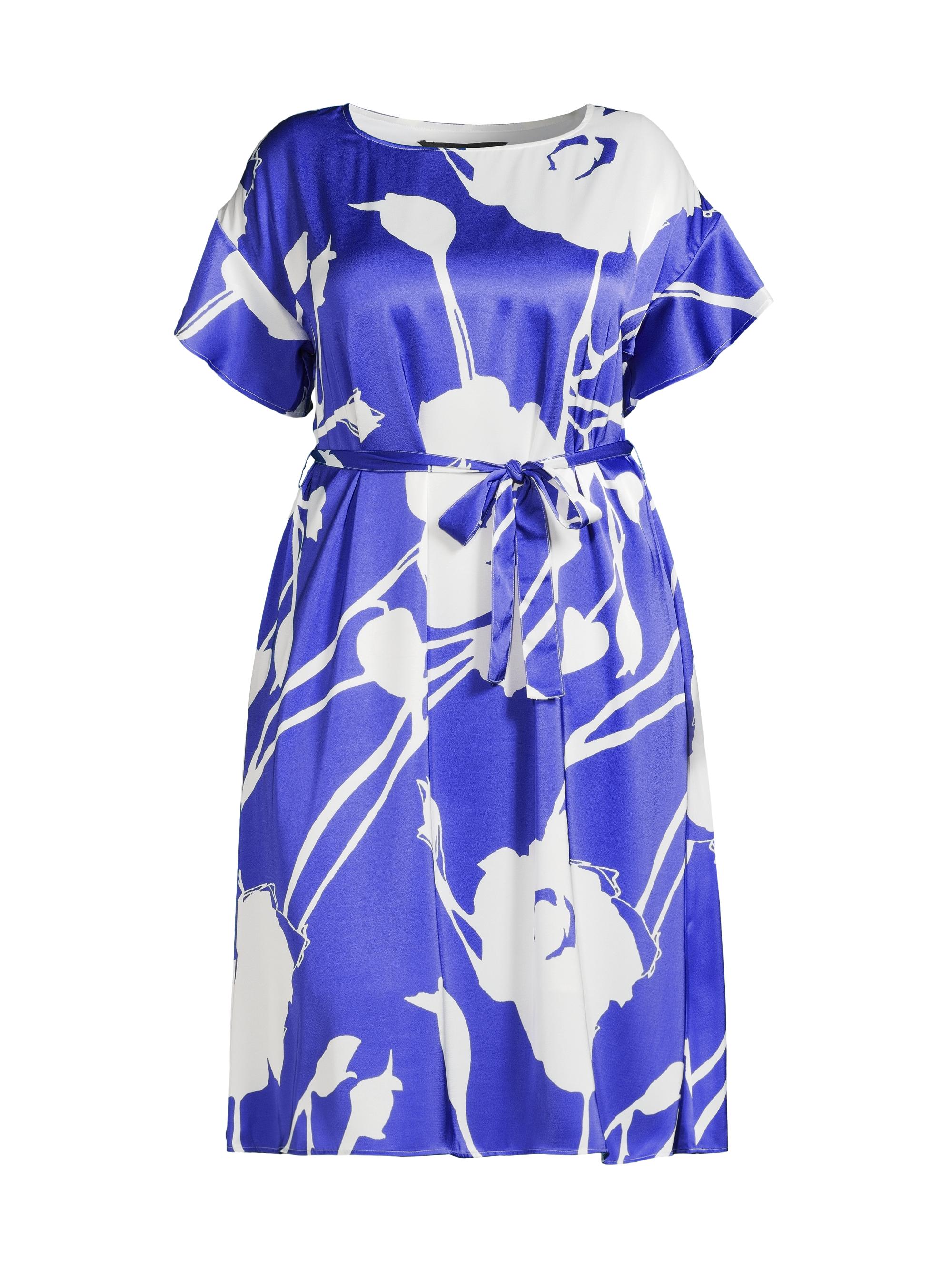 Ming Wang Plus Floral Crepe De Chine Belted Shift Midi-Dress