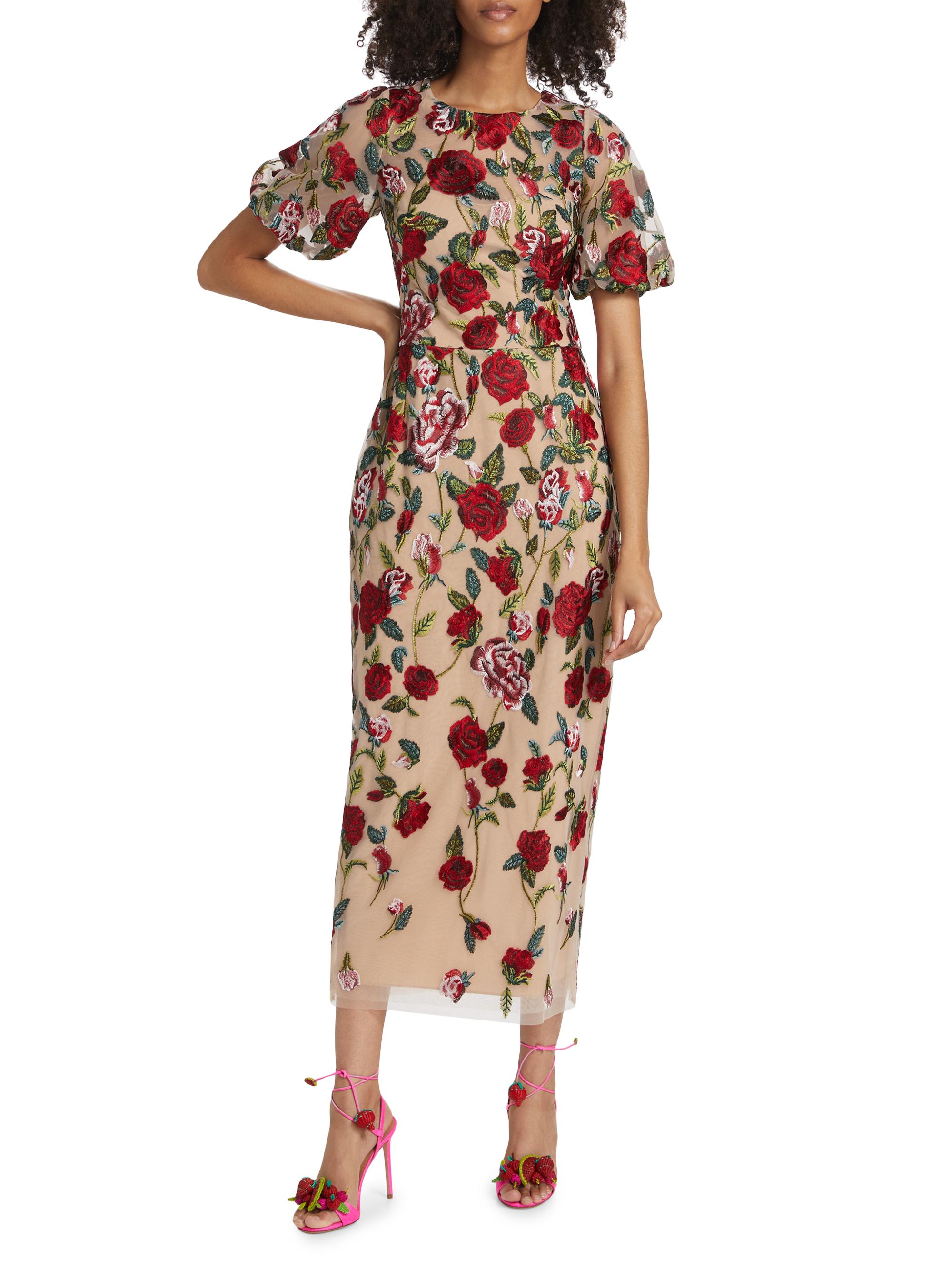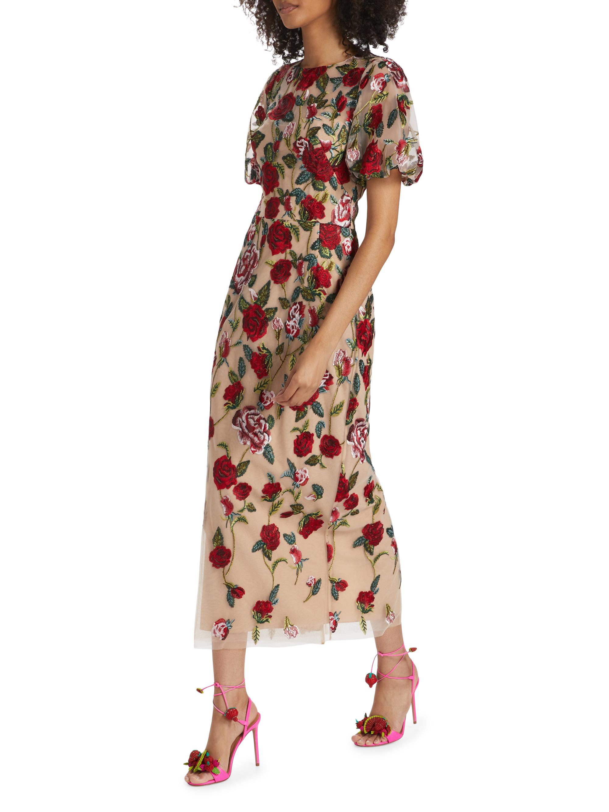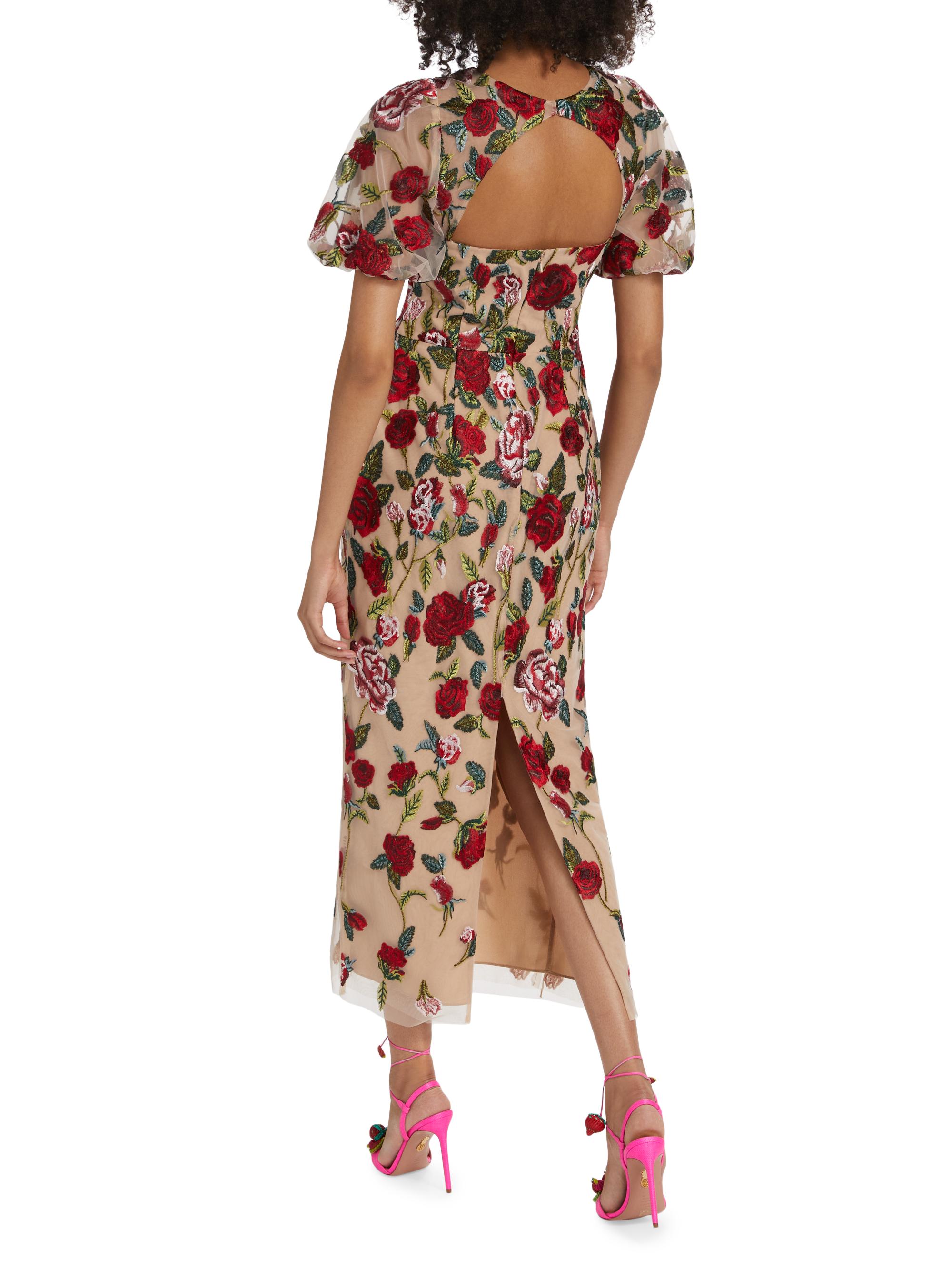Marchesa Notte Floral Embroidered Puff-Sleeve Midi-Dress