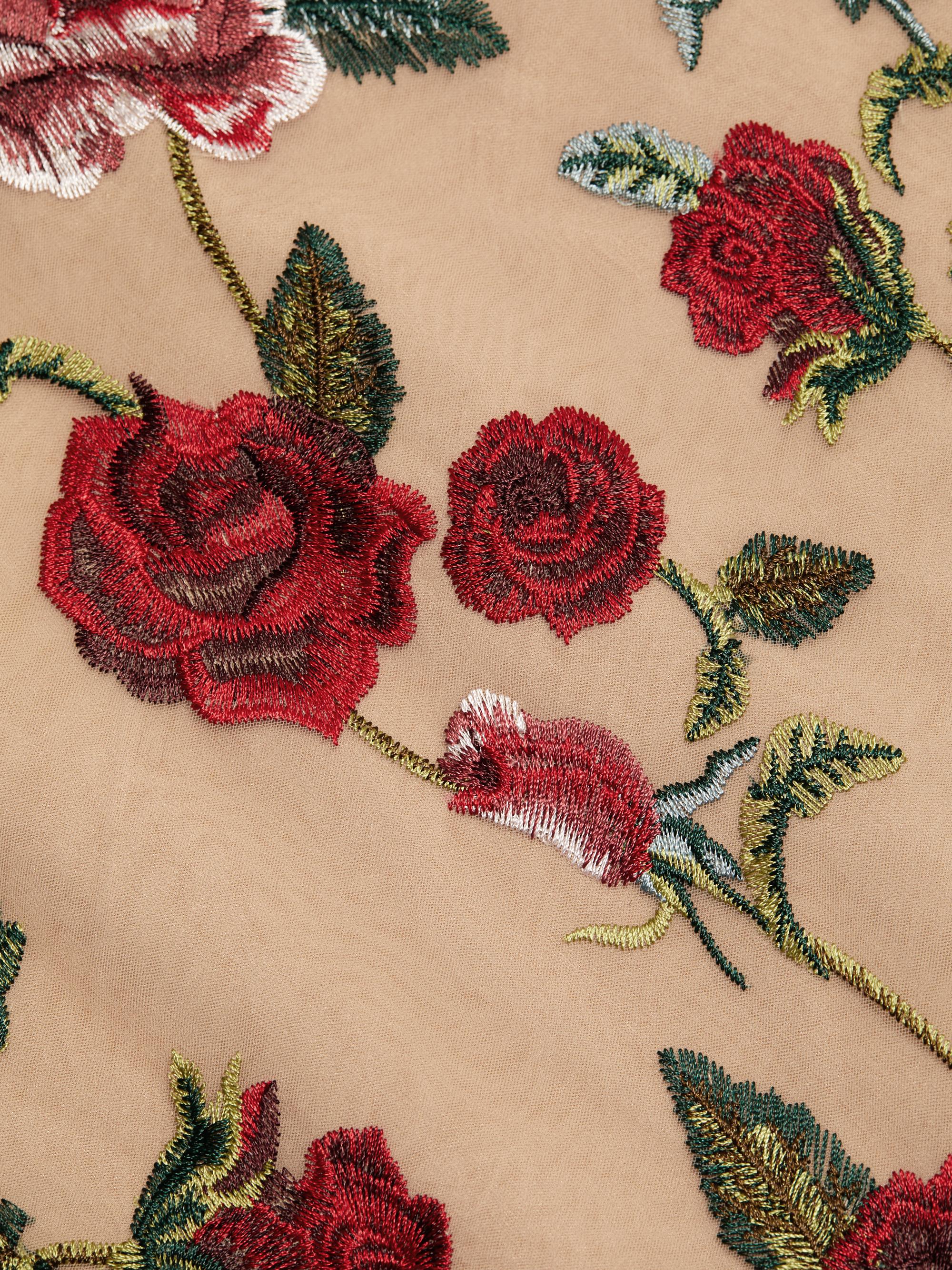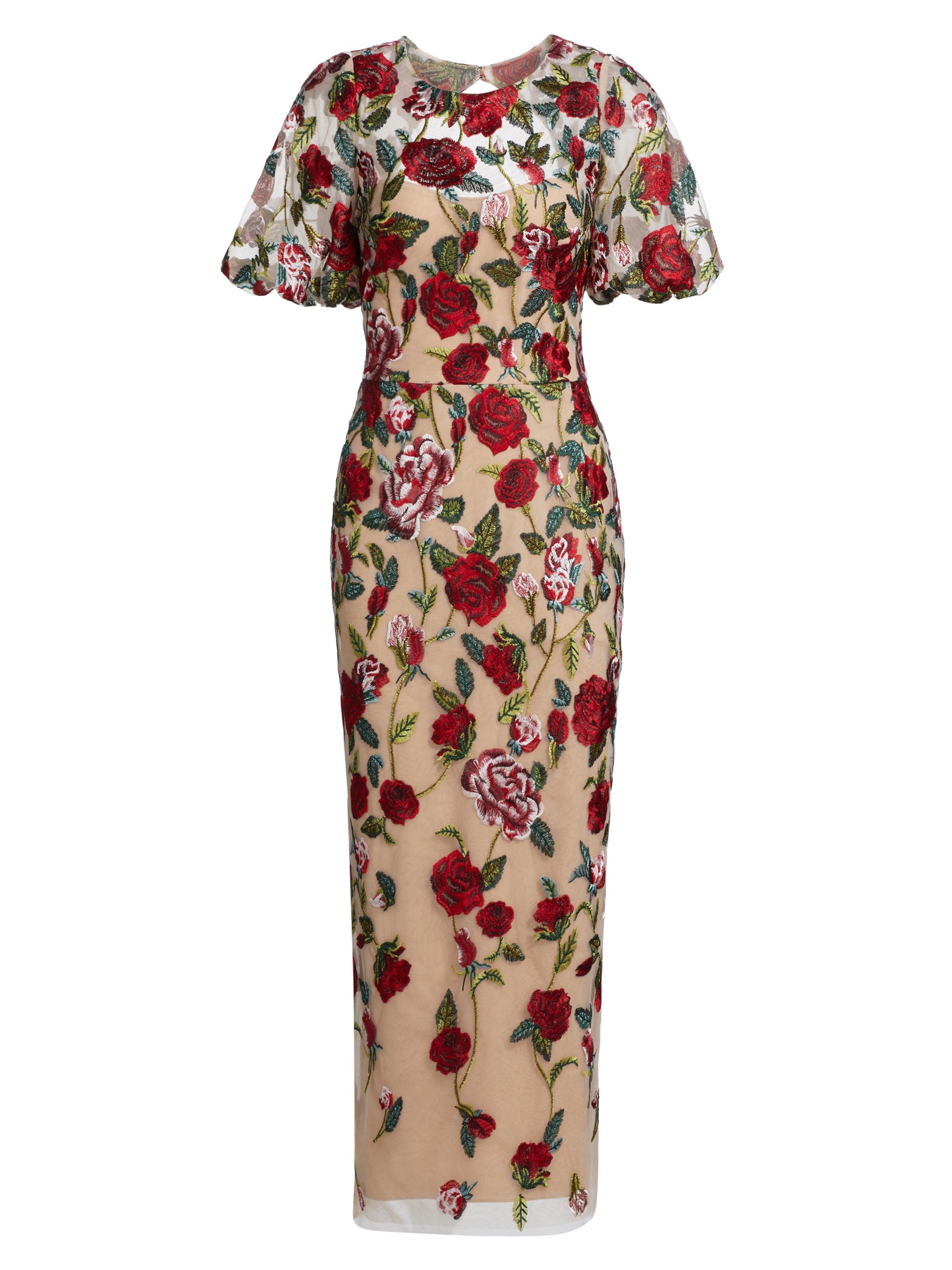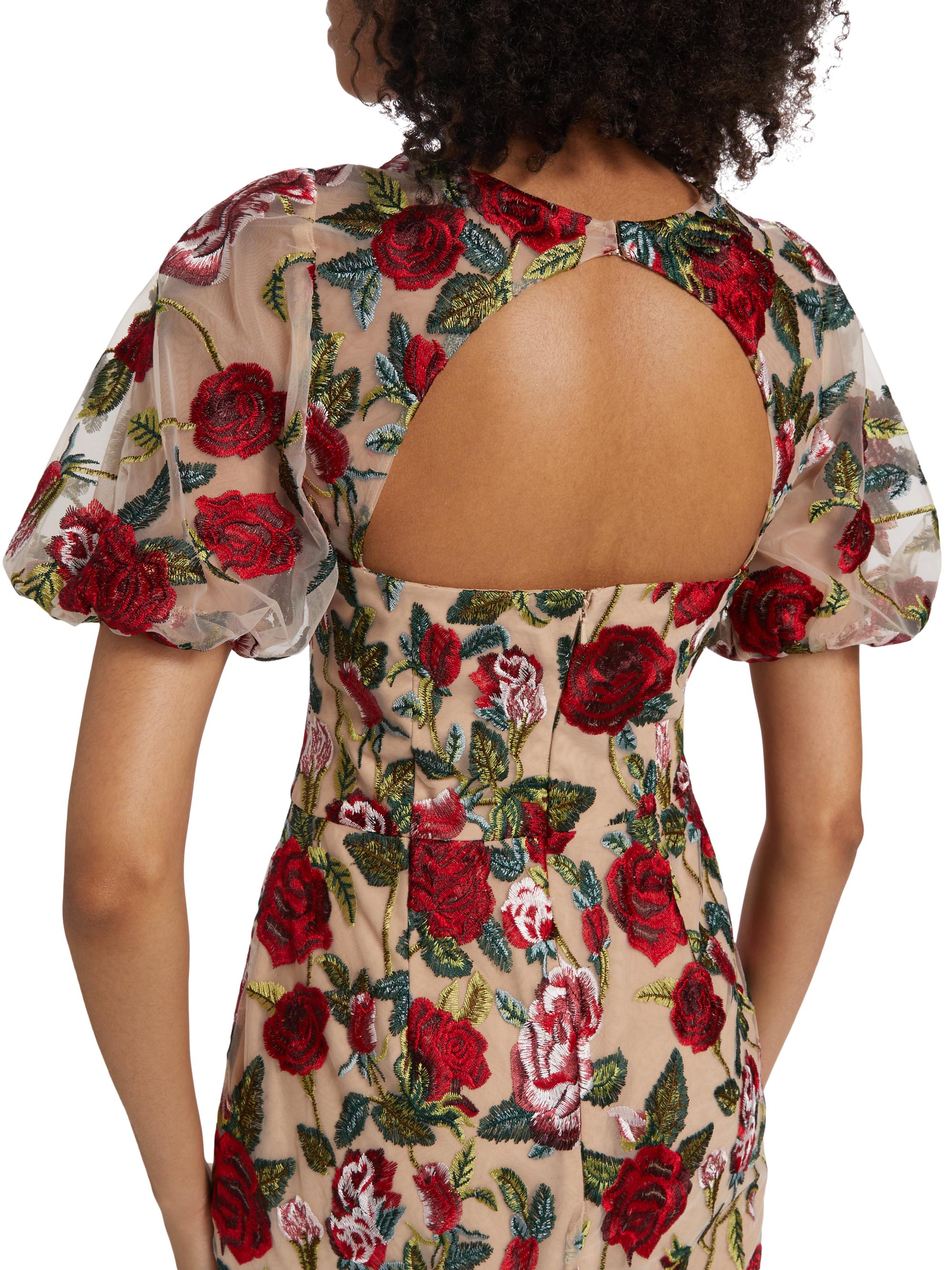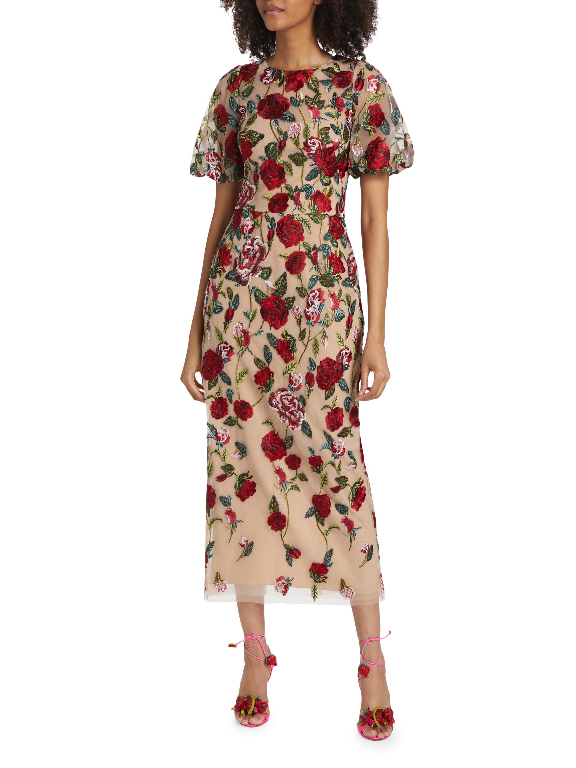 Marchesa Notte Floral Embroidered Puff-Sleeve Midi-Dress