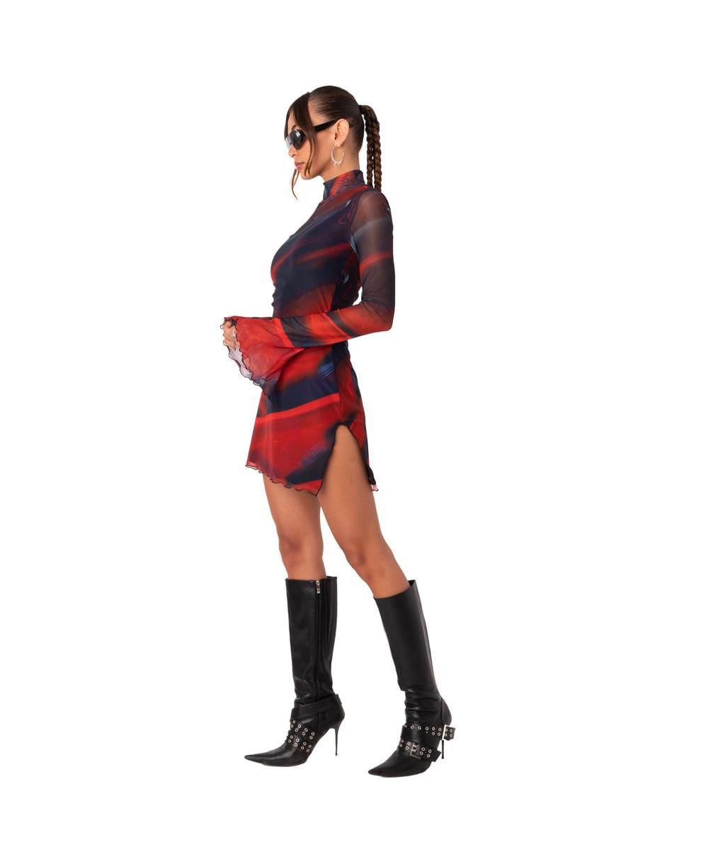 Edikted Womens Printed Mesh Lettuce Hem Mini Dress With Side Slits And Bell Sleeves