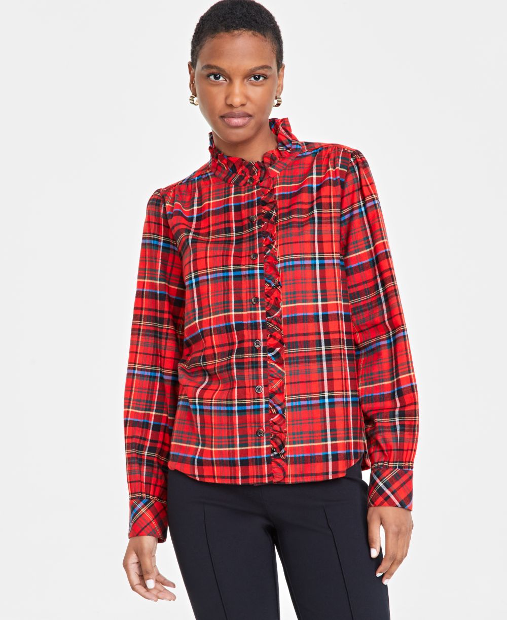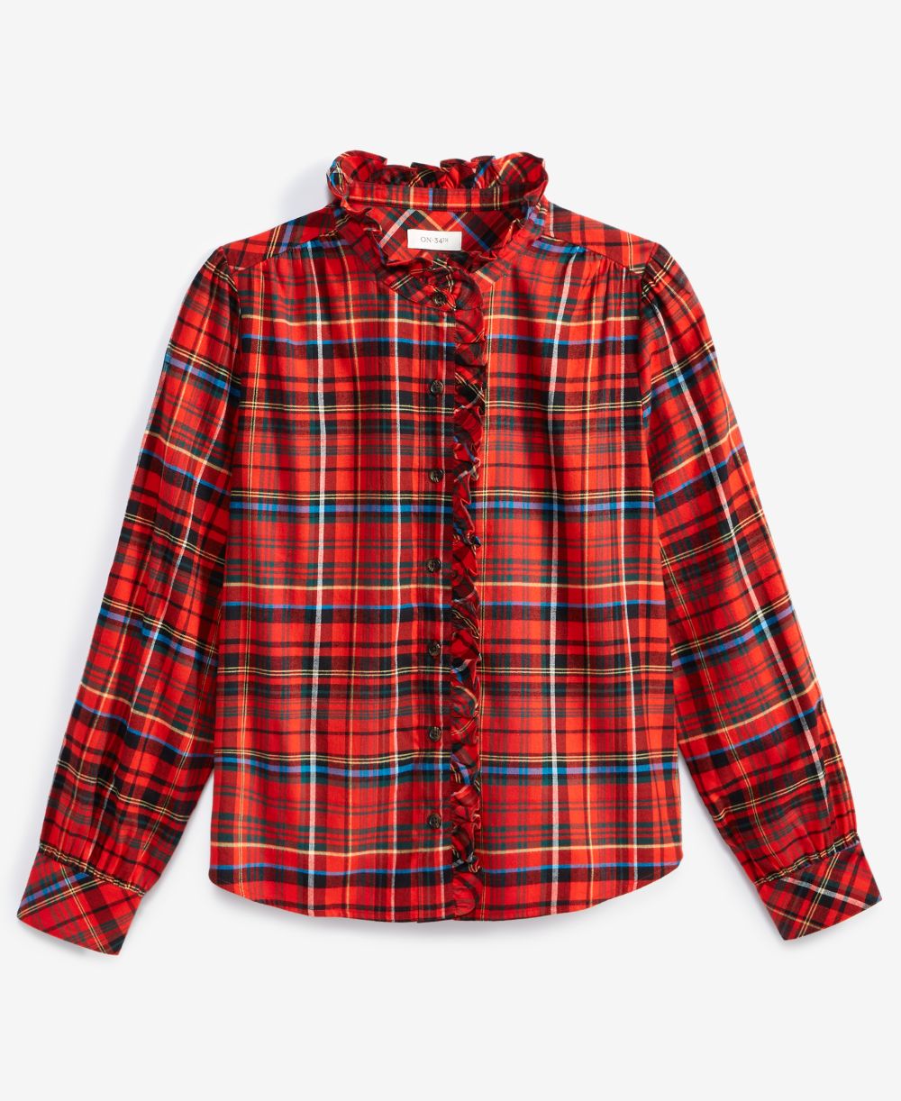 On 34th Womens Festive Plaid Ruffle Neck Flannel Shirt