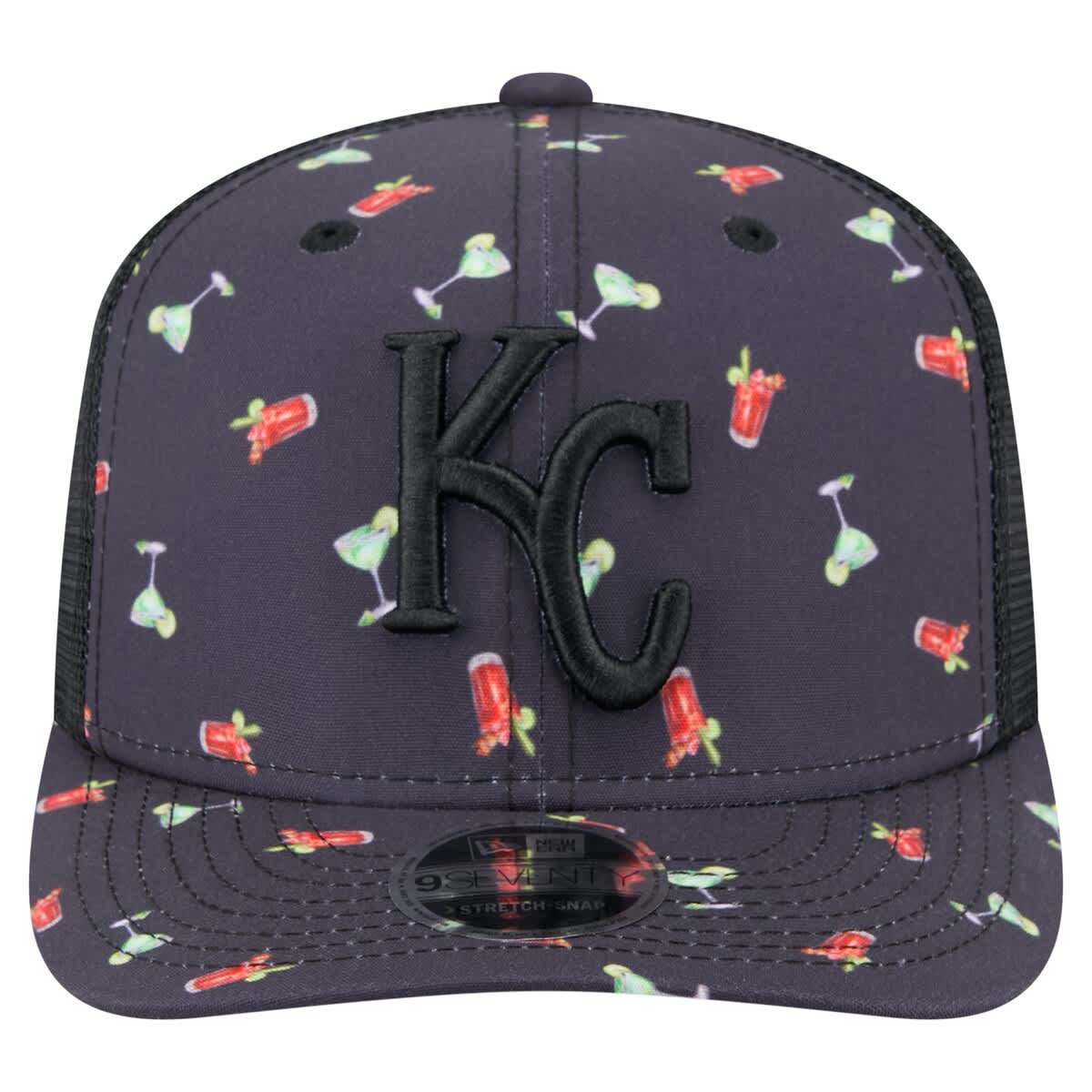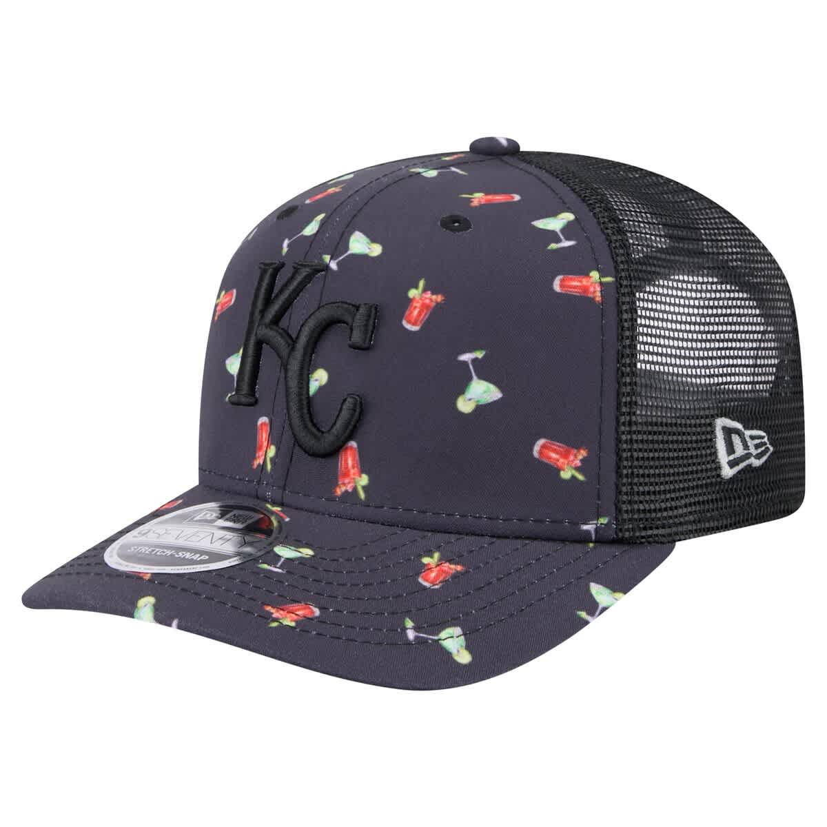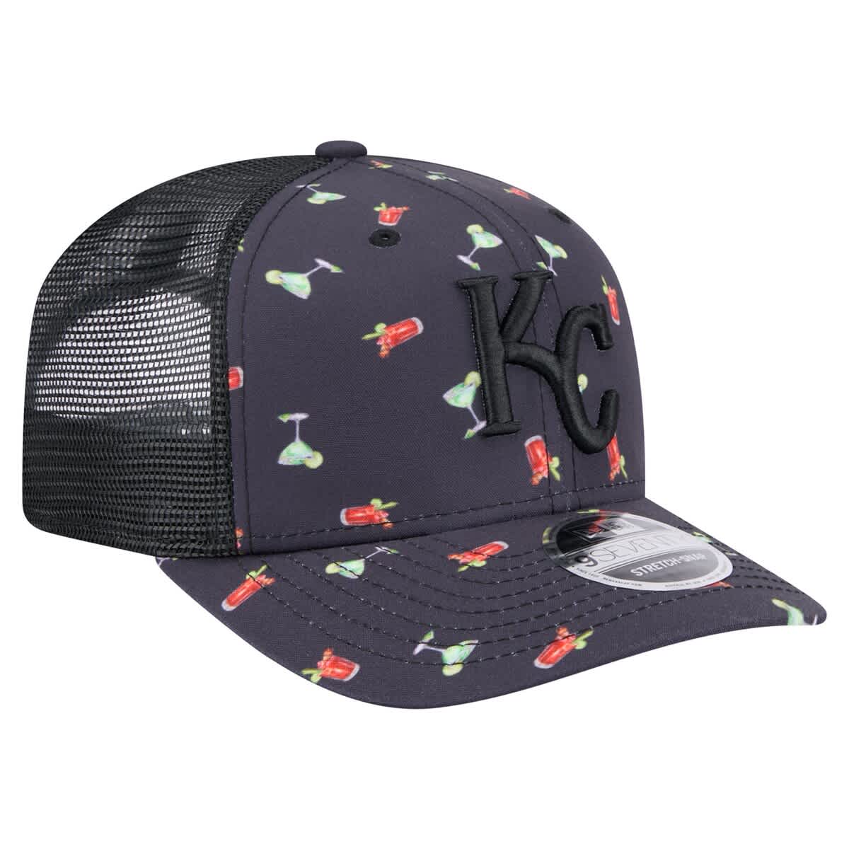 New Era Mens New Era Black Kansas City Royals Adventure Drinks Pattern 9SEVENTY Stretch-Snap Hat_Navy