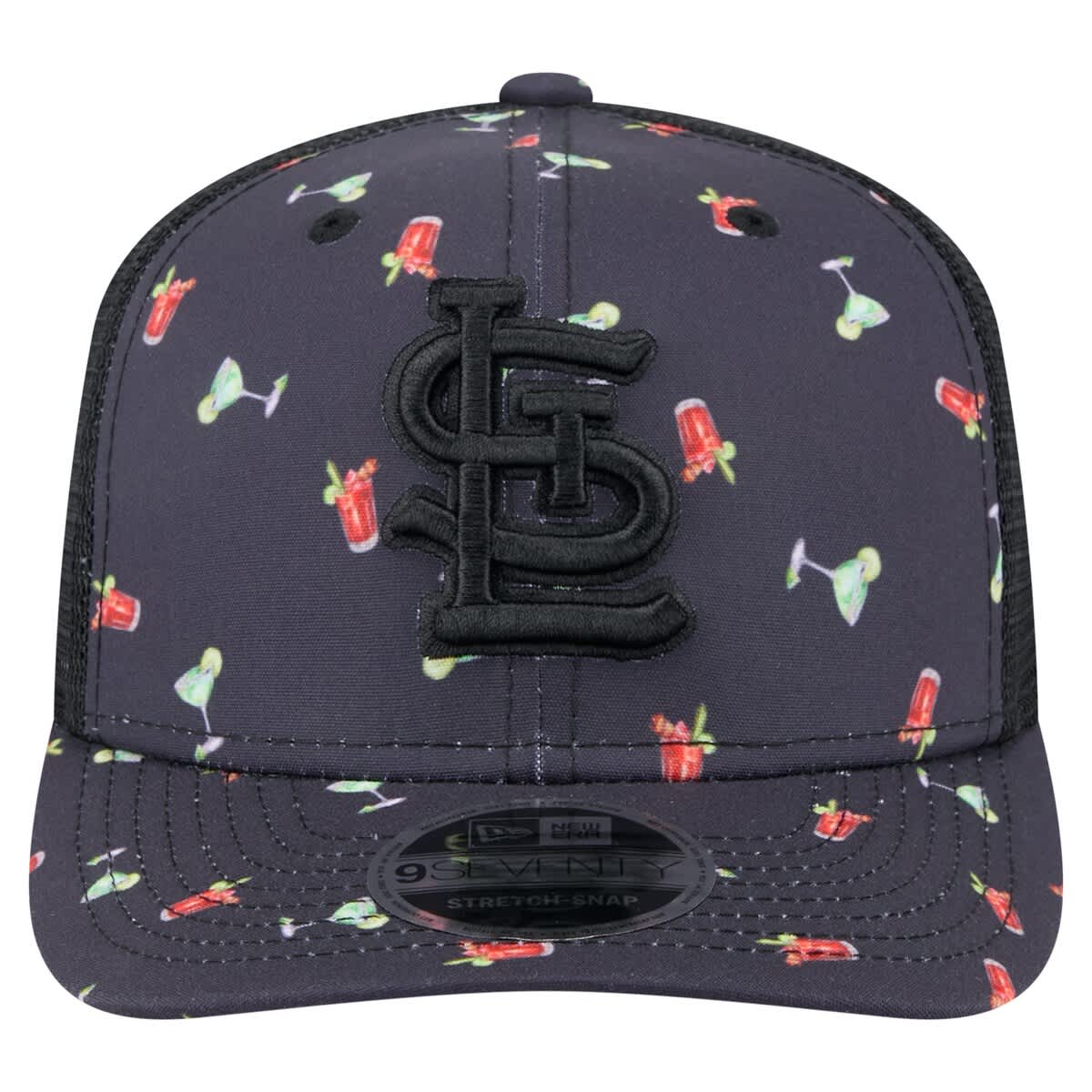 New Era Mens New Era Black St. Louis Cardinals Adventure Drinks Pattern 9SEVENTY Stretch-Snap Hat_Navy