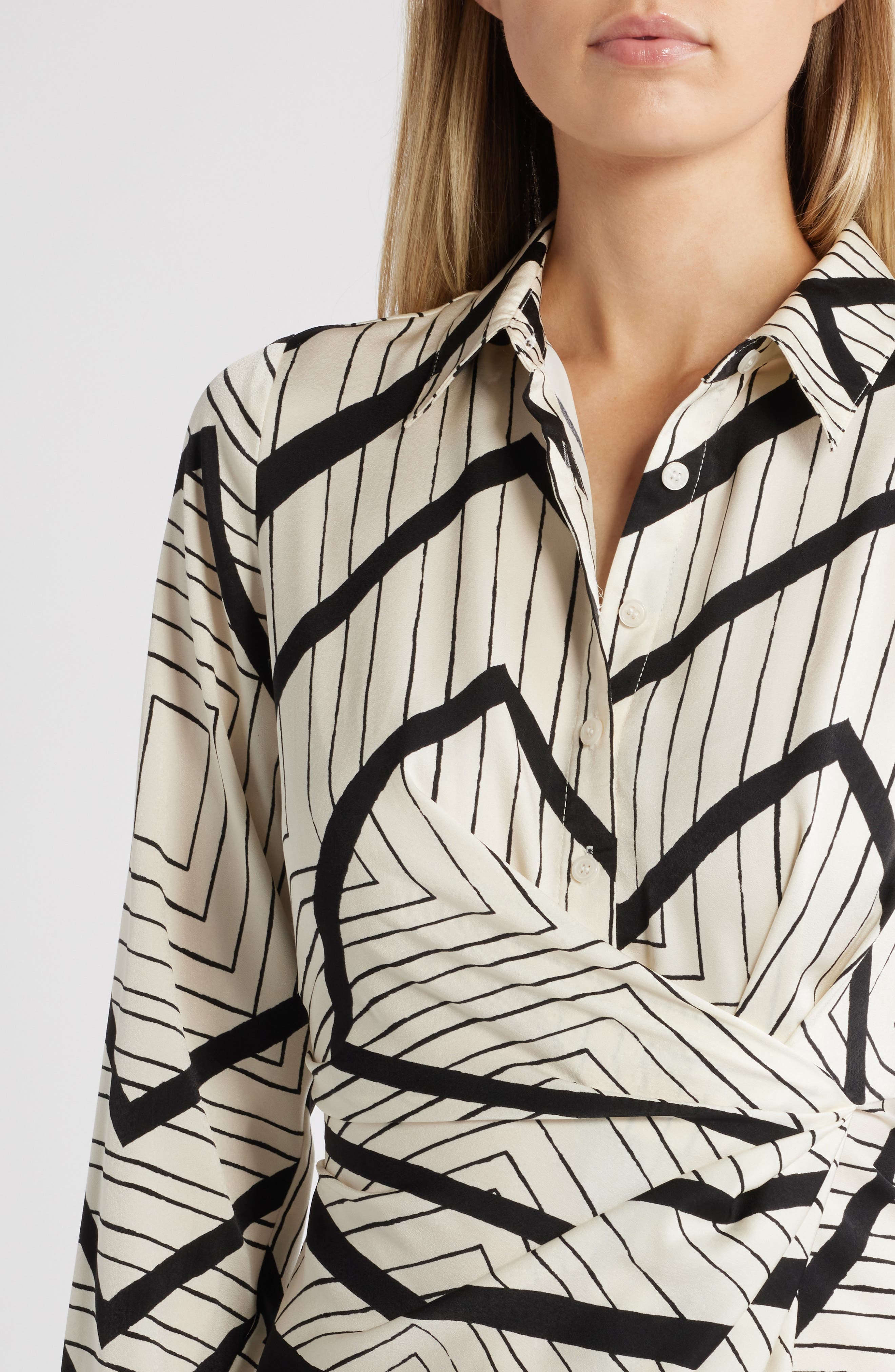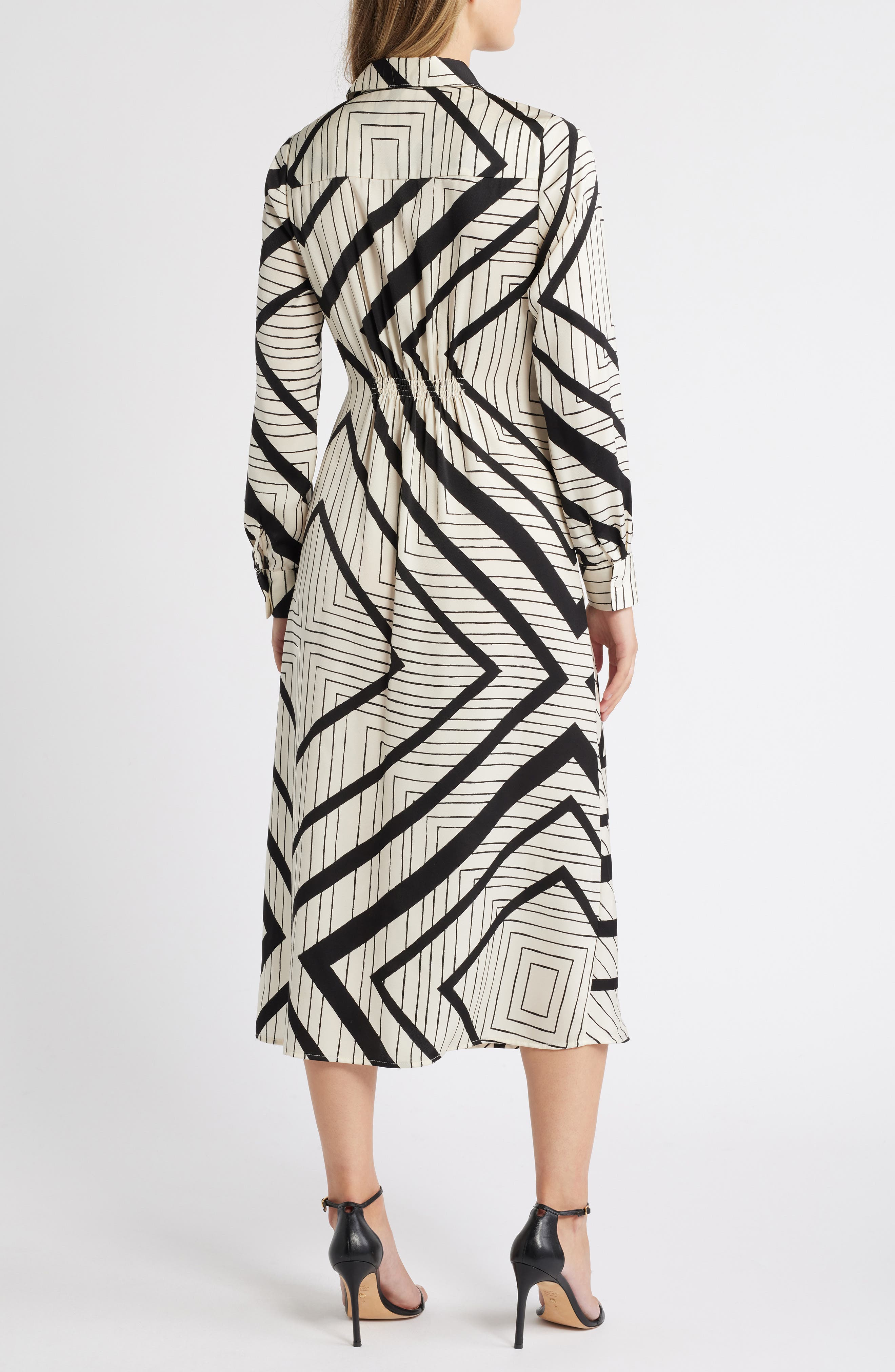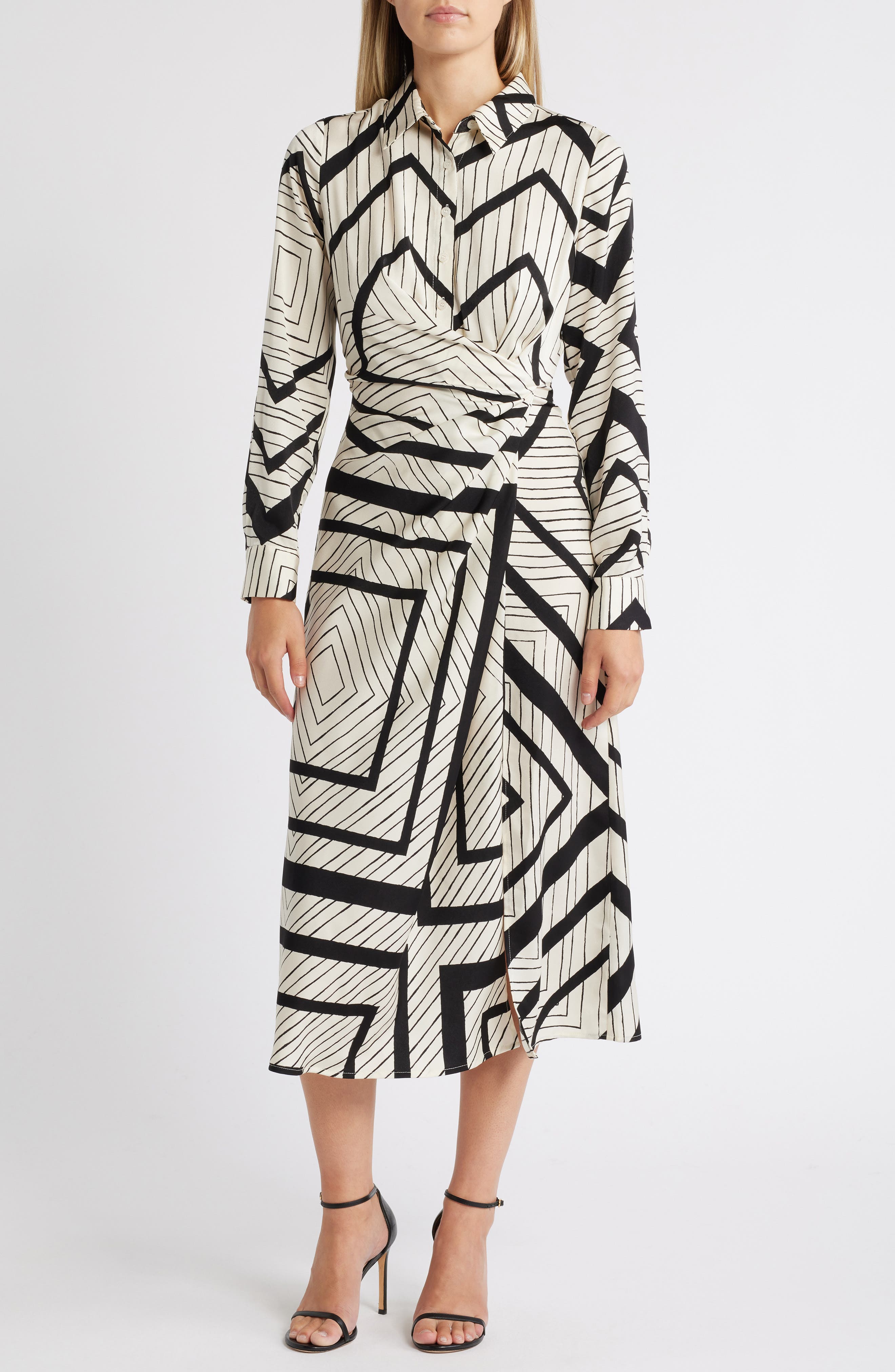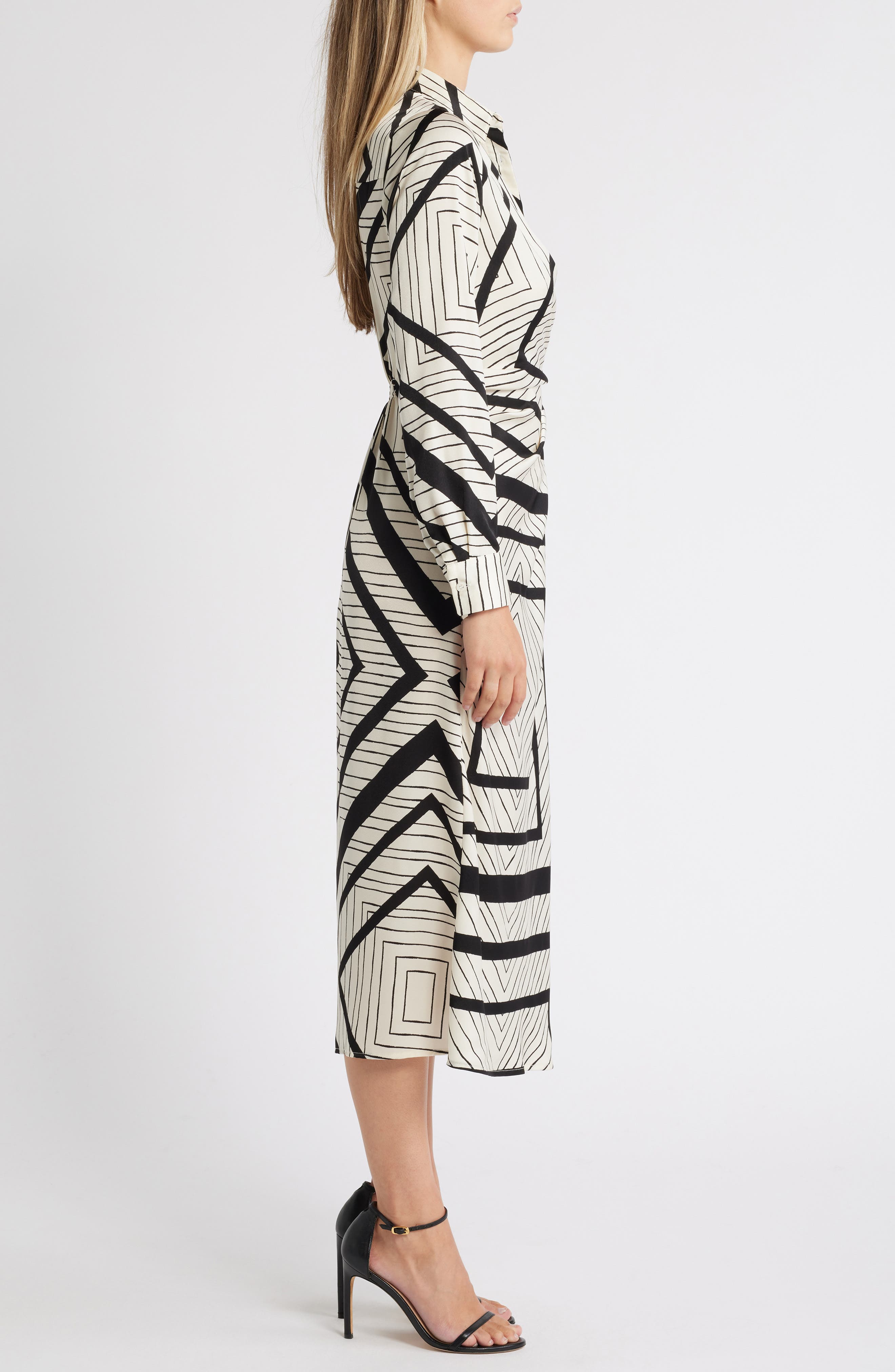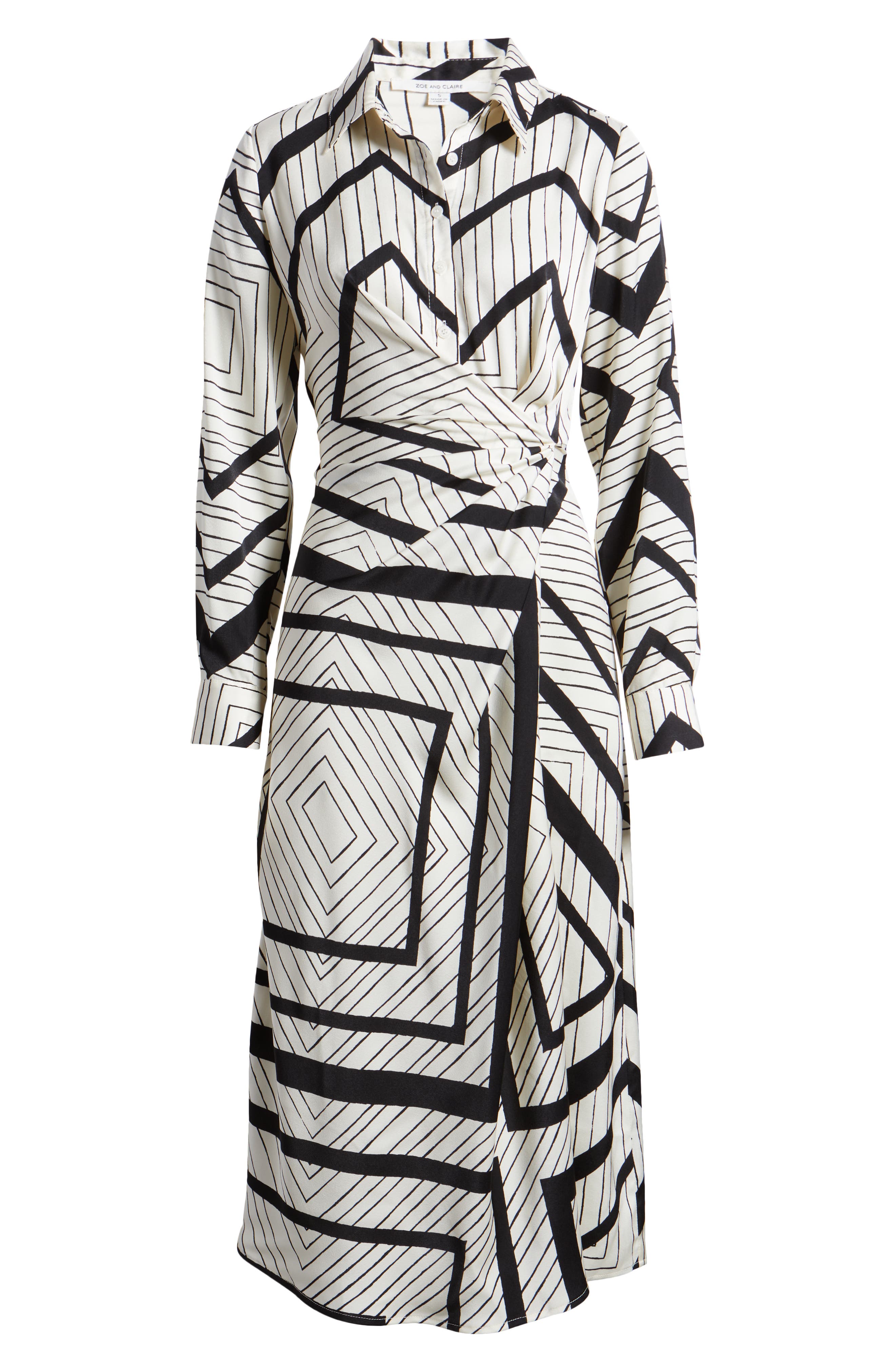 ZOE AND CLAIRE Stripe Wrap Waist Long Sleeve Midi Shirtdress_Natural/ Black