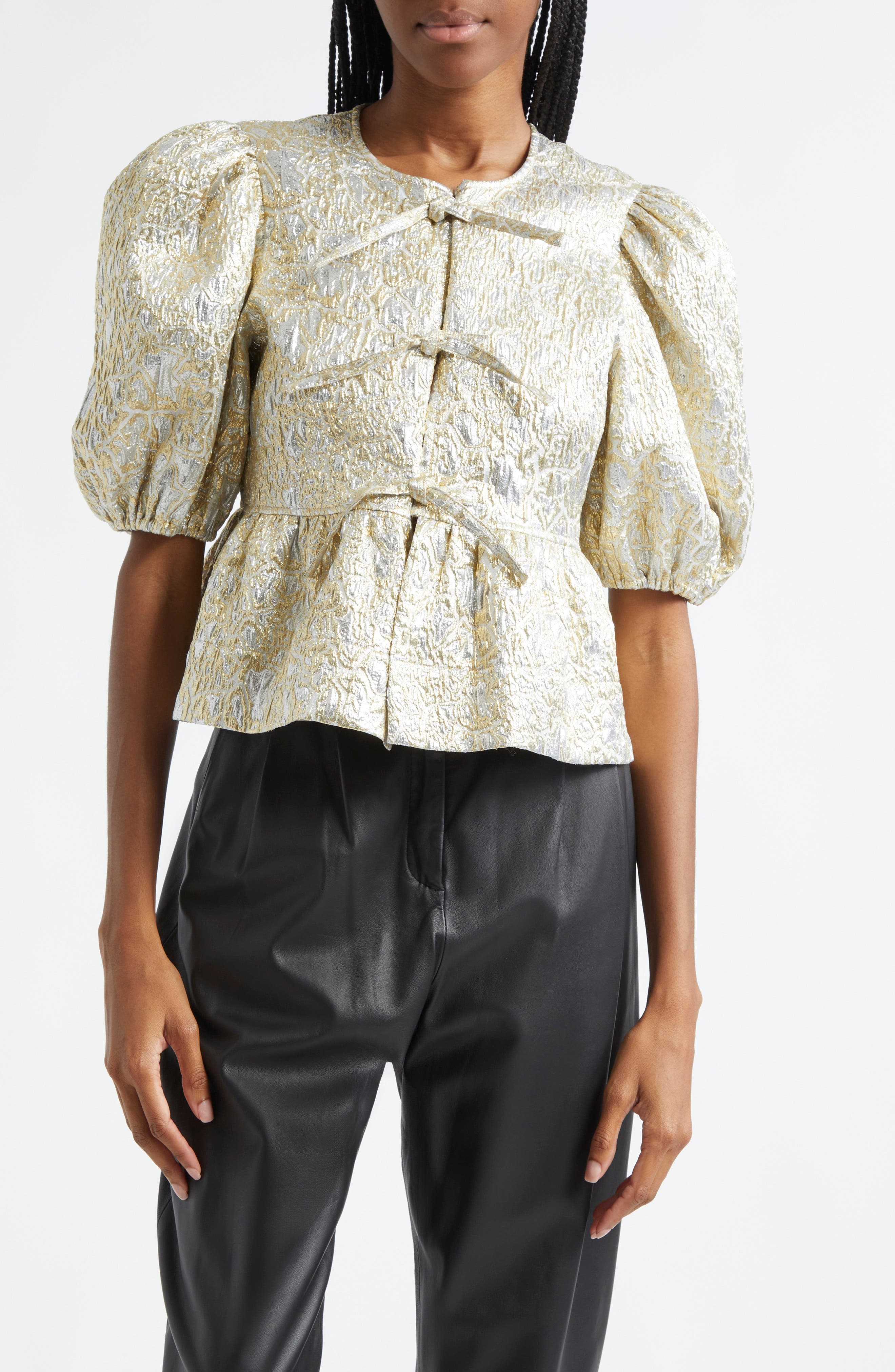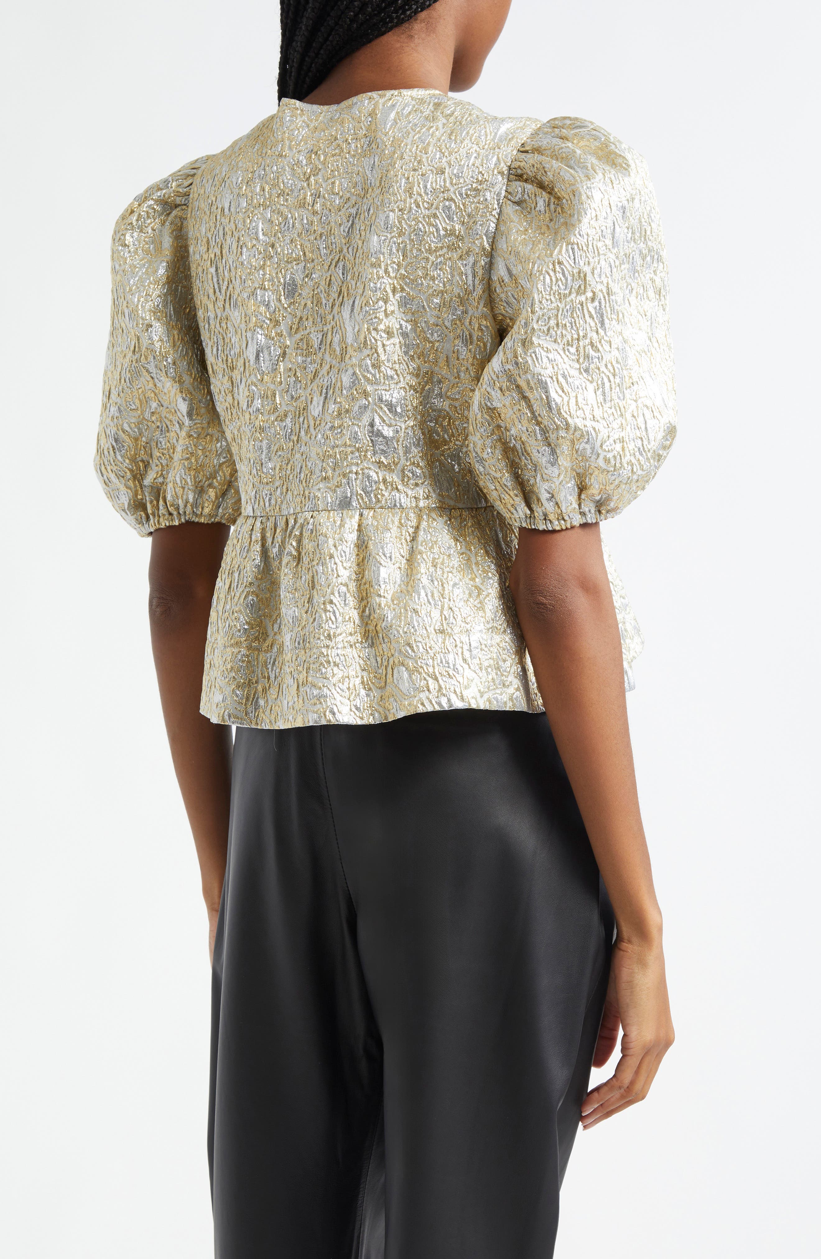 Ganni Metallic Jacquard Peplum Top_Gold/ Silver