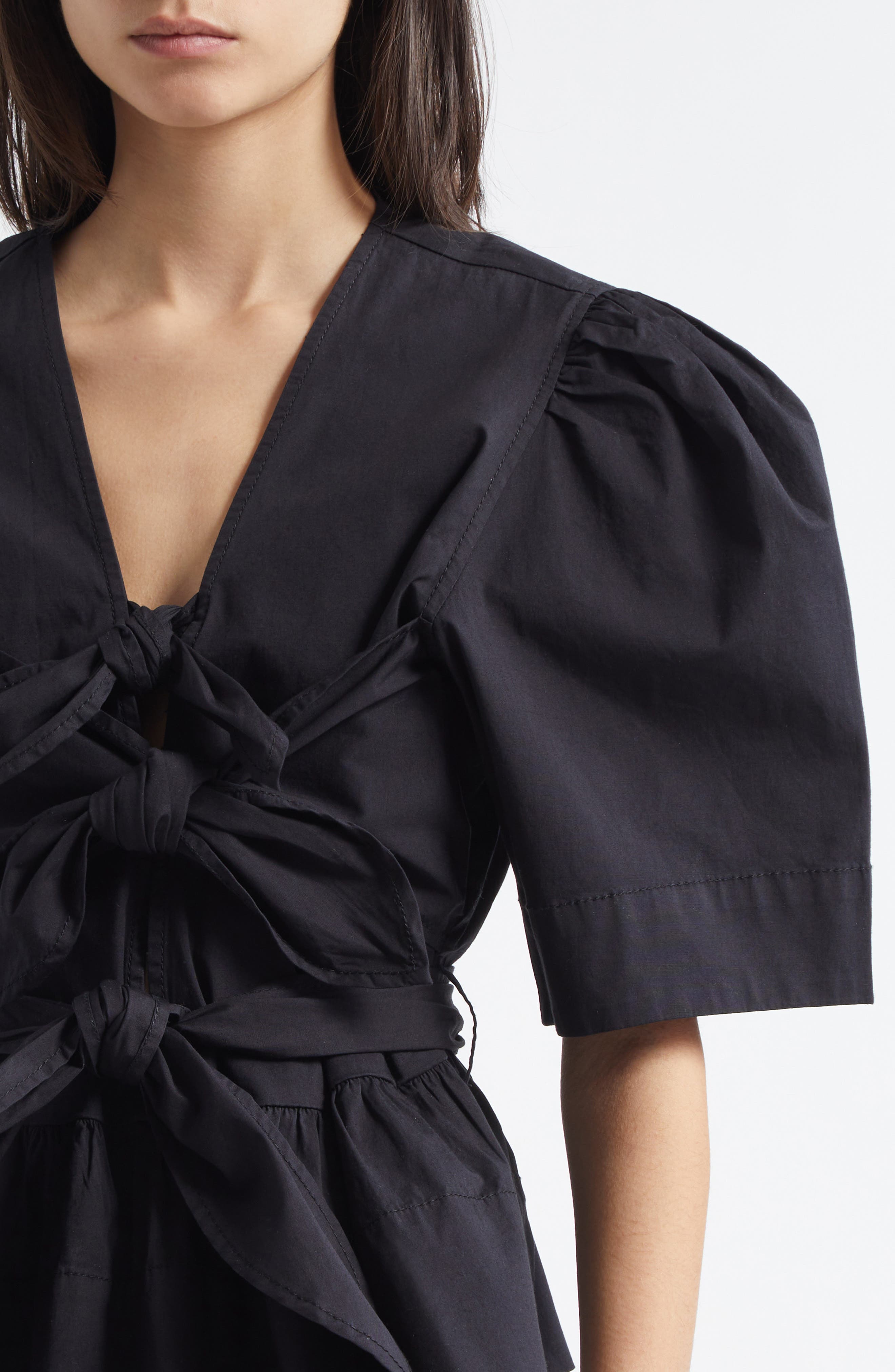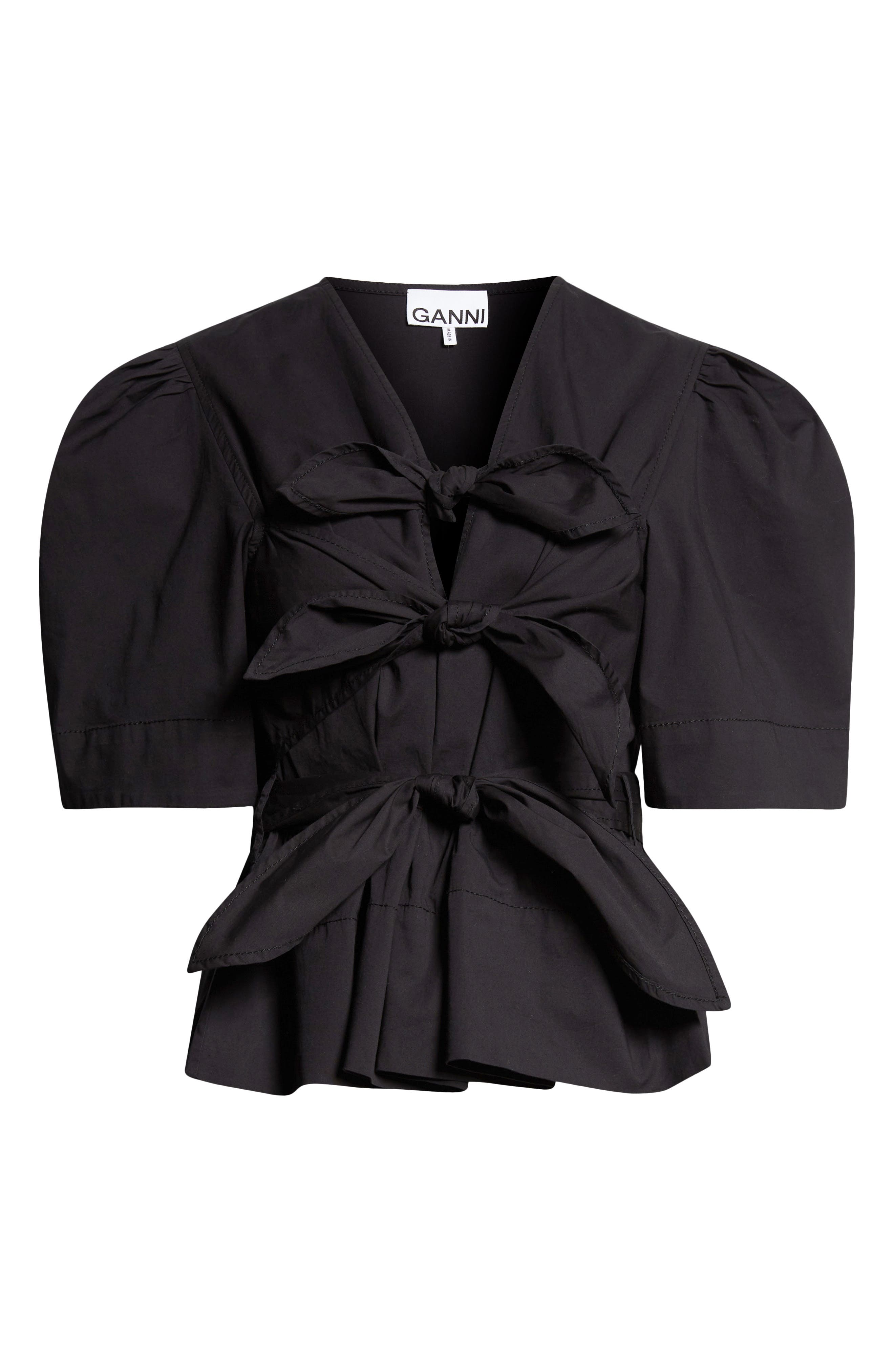 Ganni Bow Front Puff Sleeve Organic Cotton Poplin Top_Black