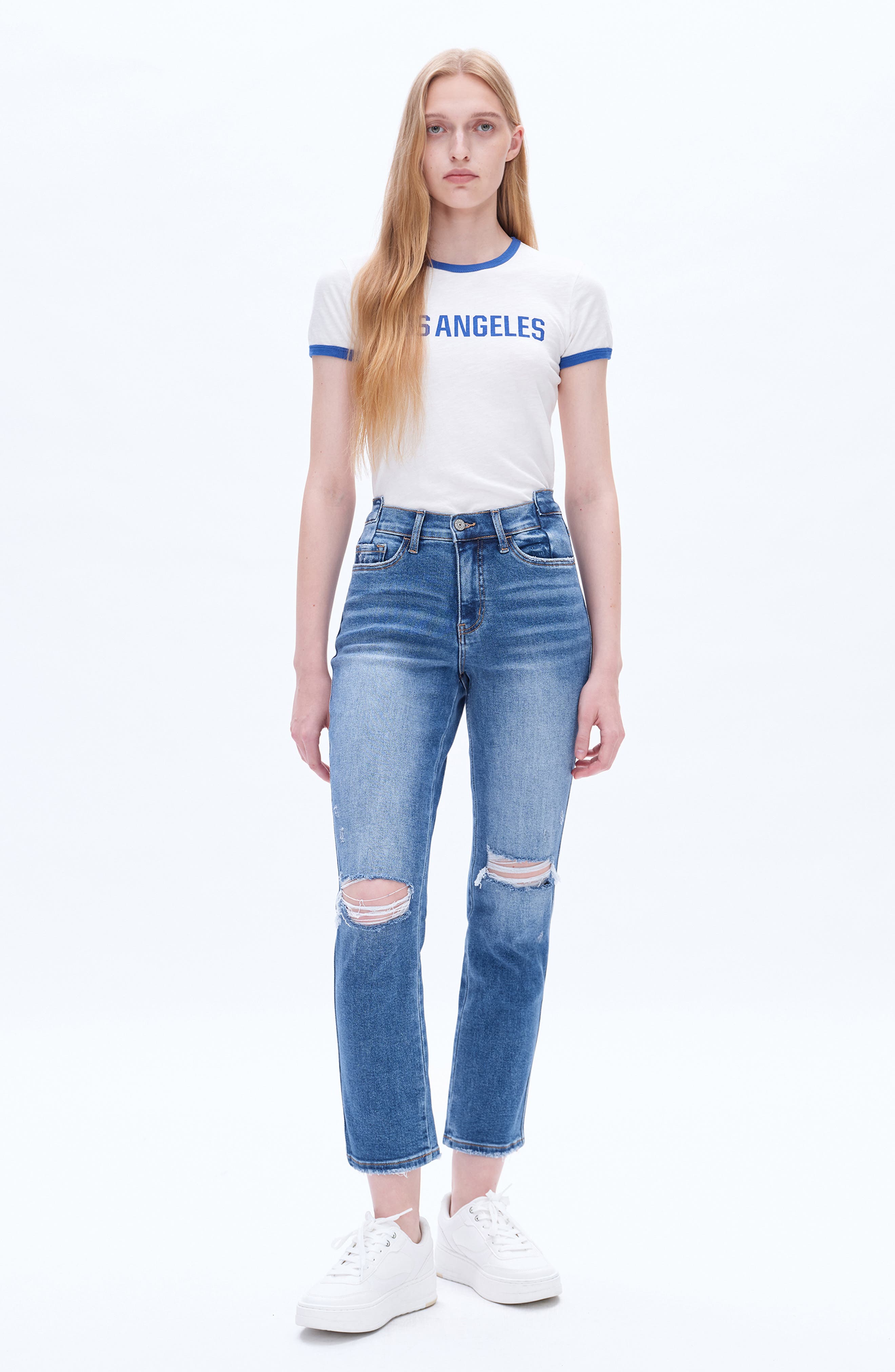 Bayeas Distressed High Waist Ankle Straight Leg Jeans_Medium Blue