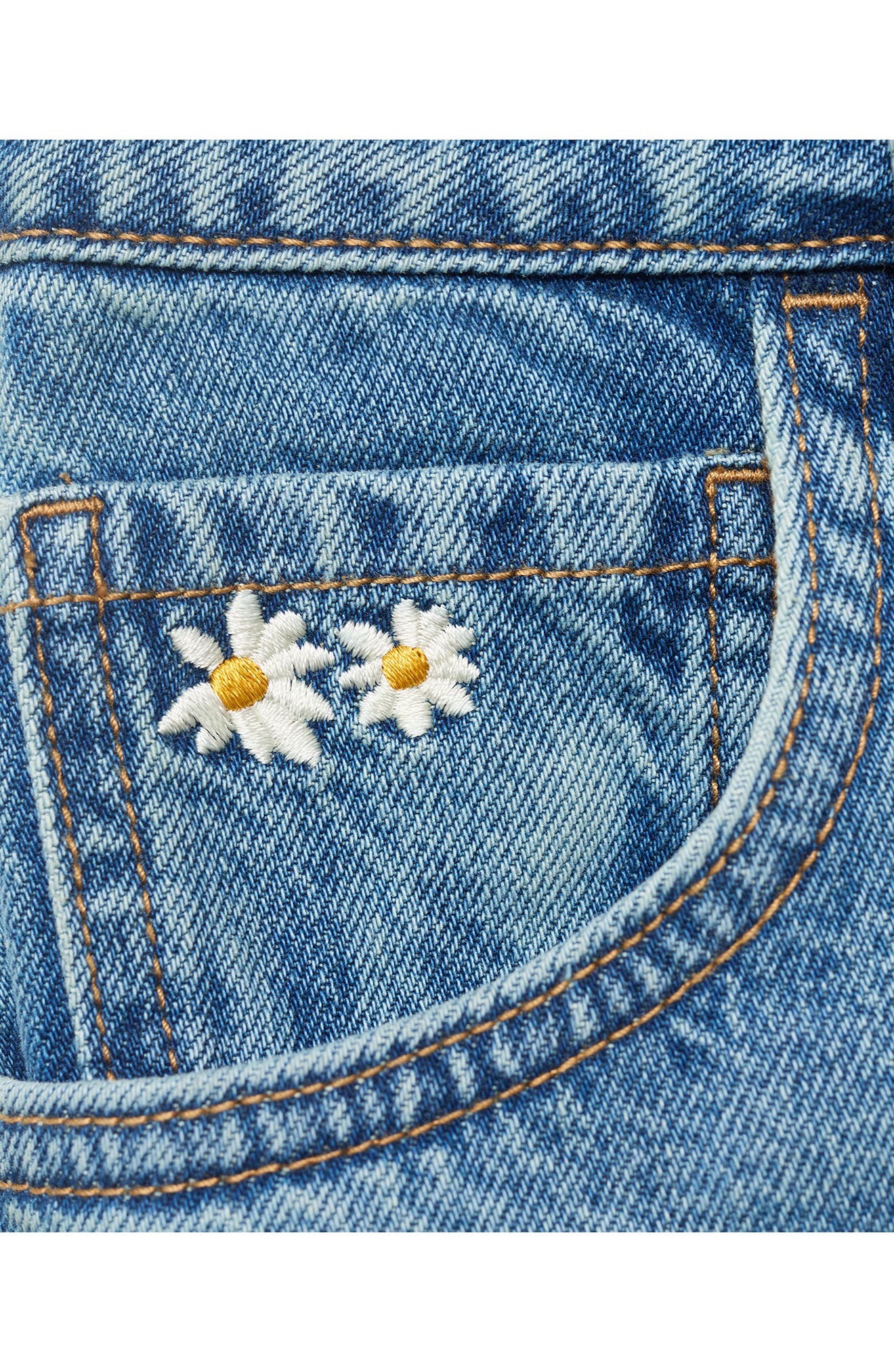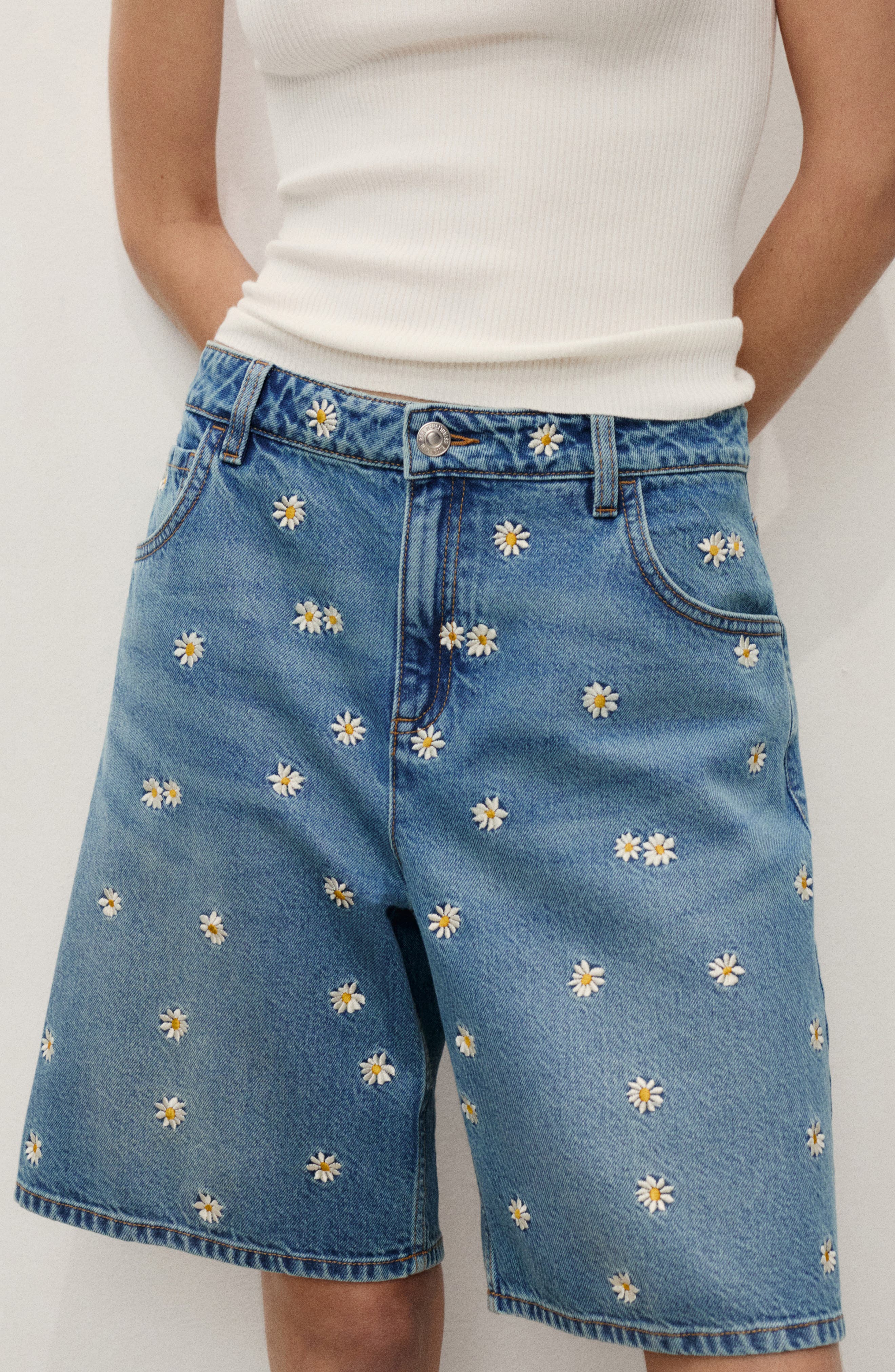 MANGO Floral Embroidered High Waist Denim Bermuda Shorts_Medium Blue