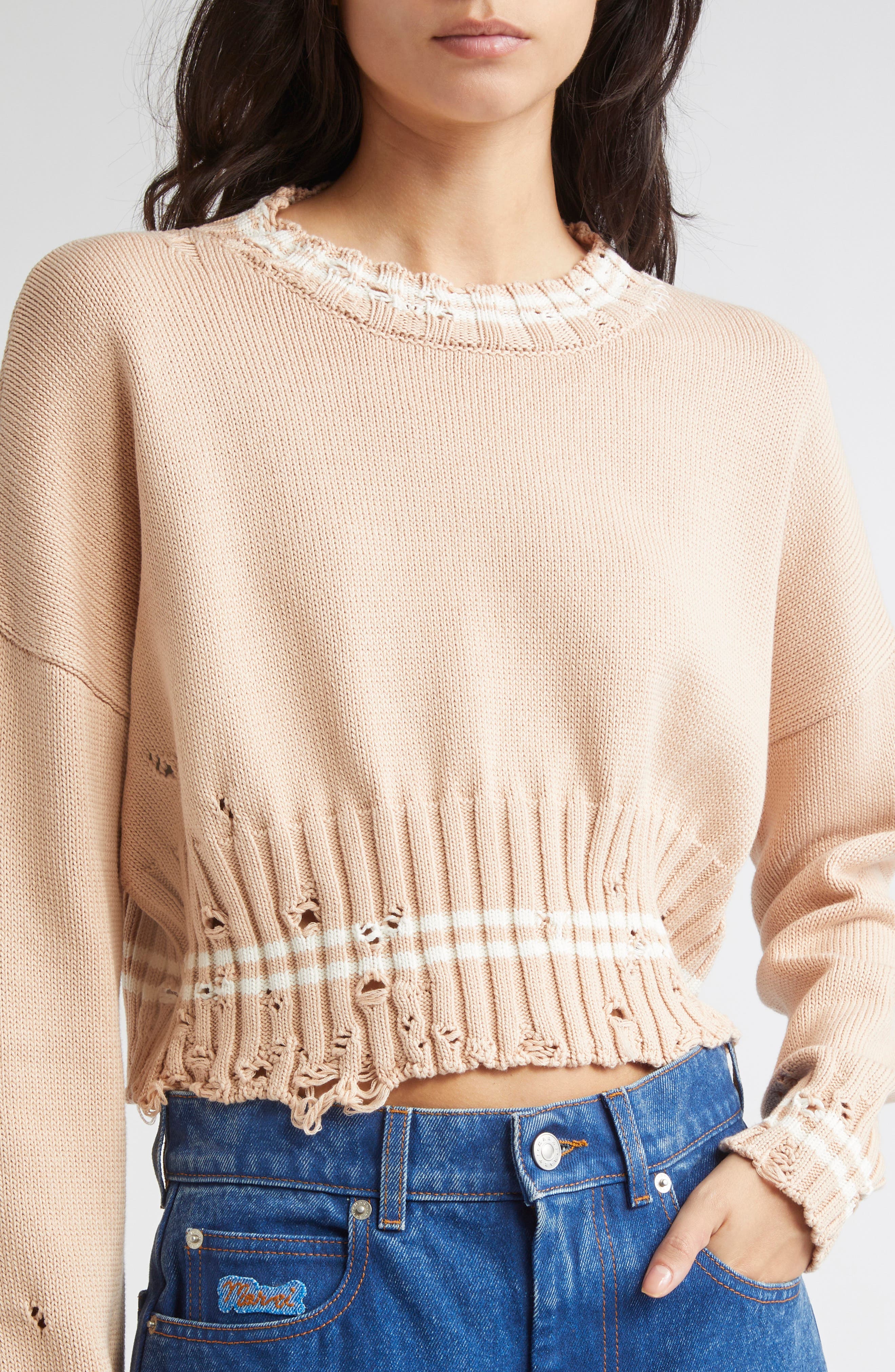 Marni Mending Logo Distressed Cotton Crewneck Sweater_00W35 Sand Storm