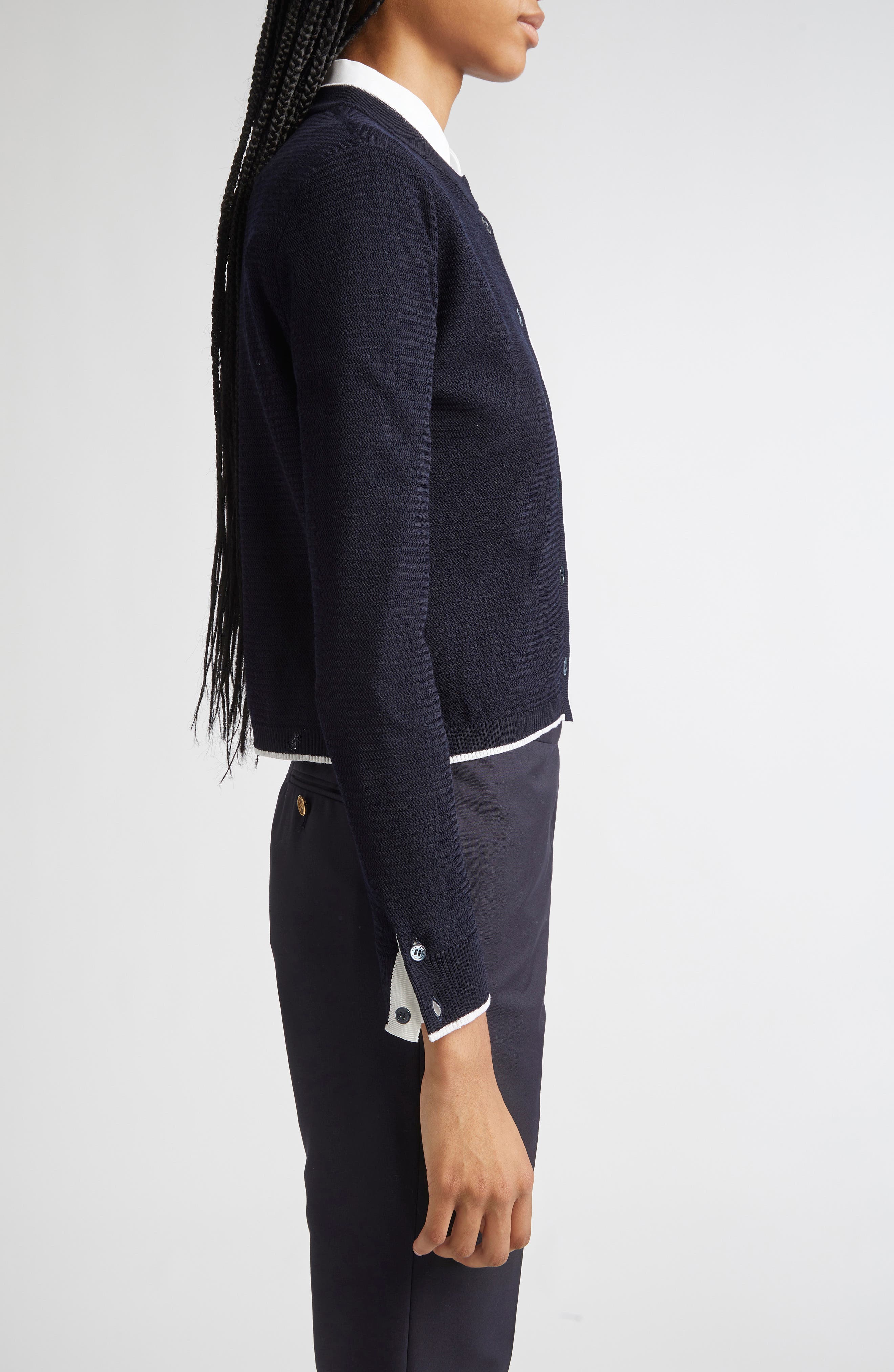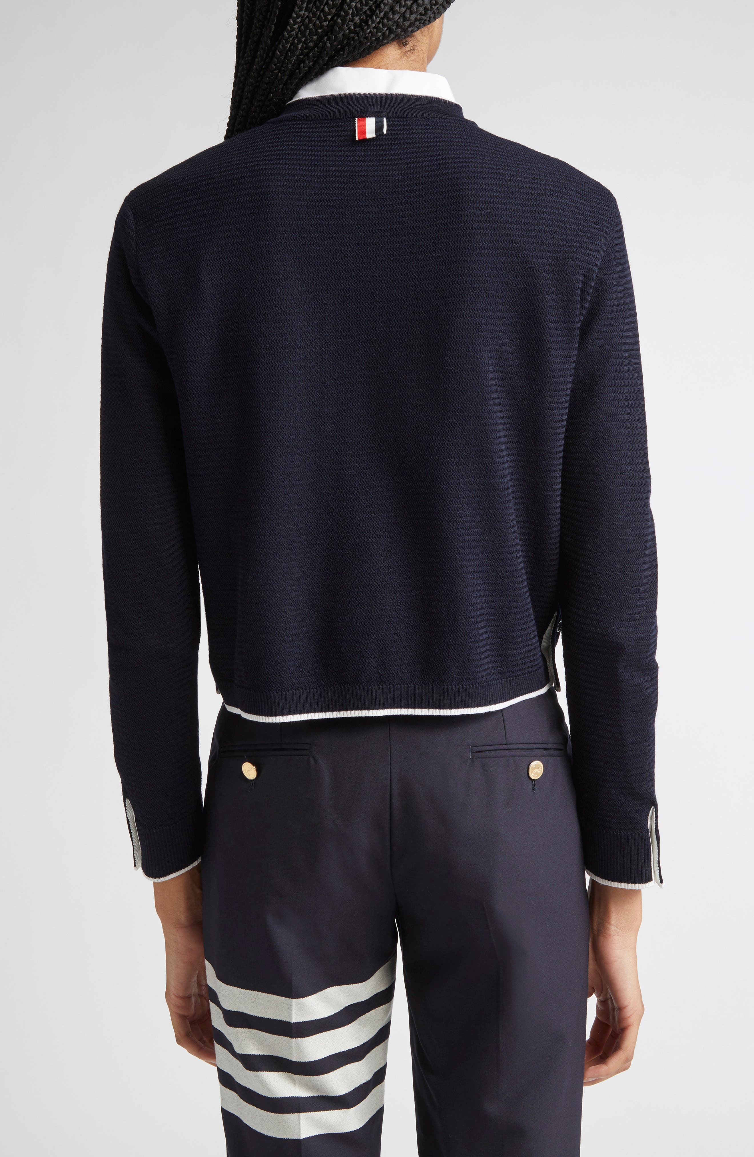 Thom Browne Textured Stitch Virgin Wool Crewneck Cardigan_Navy